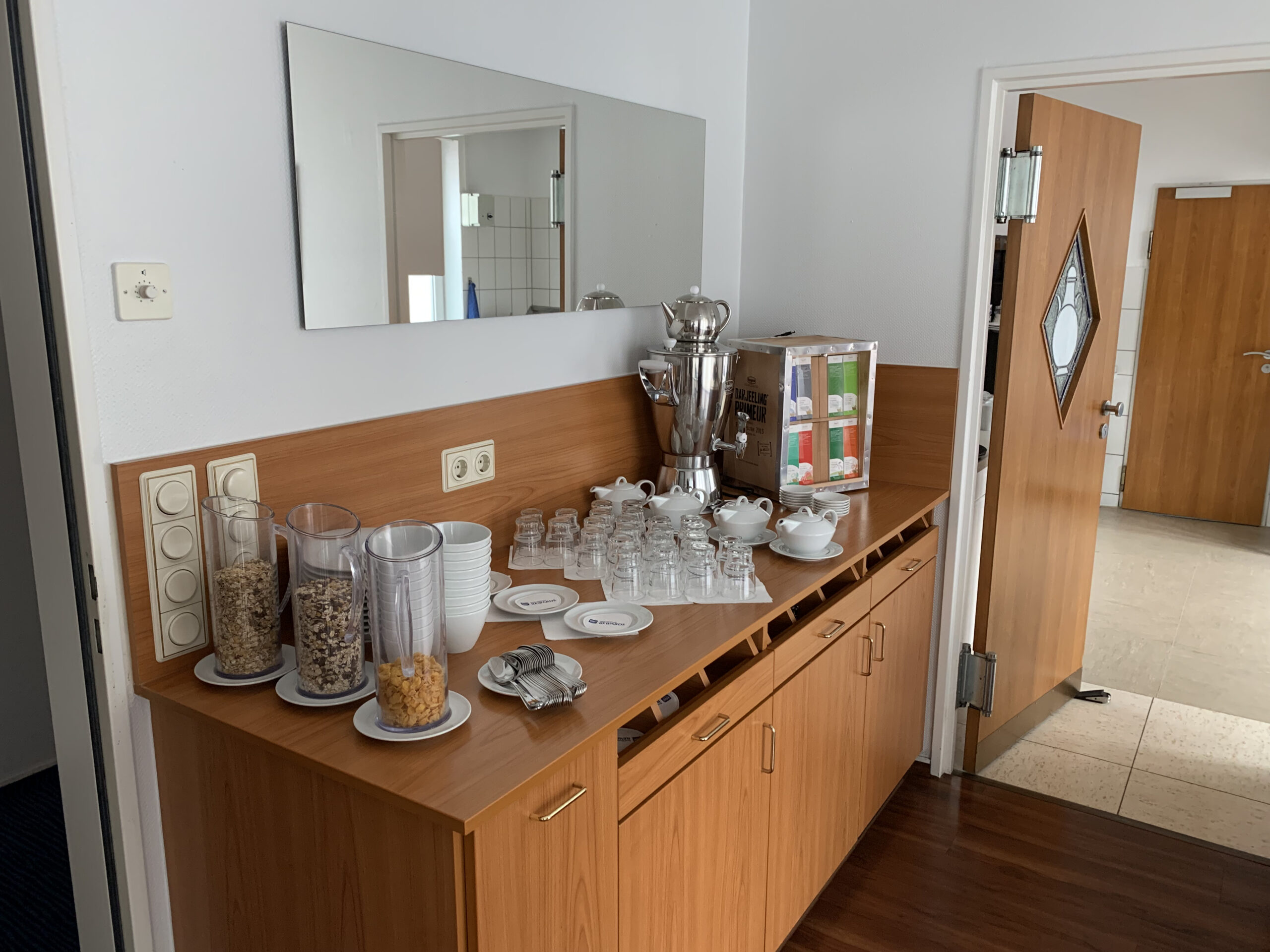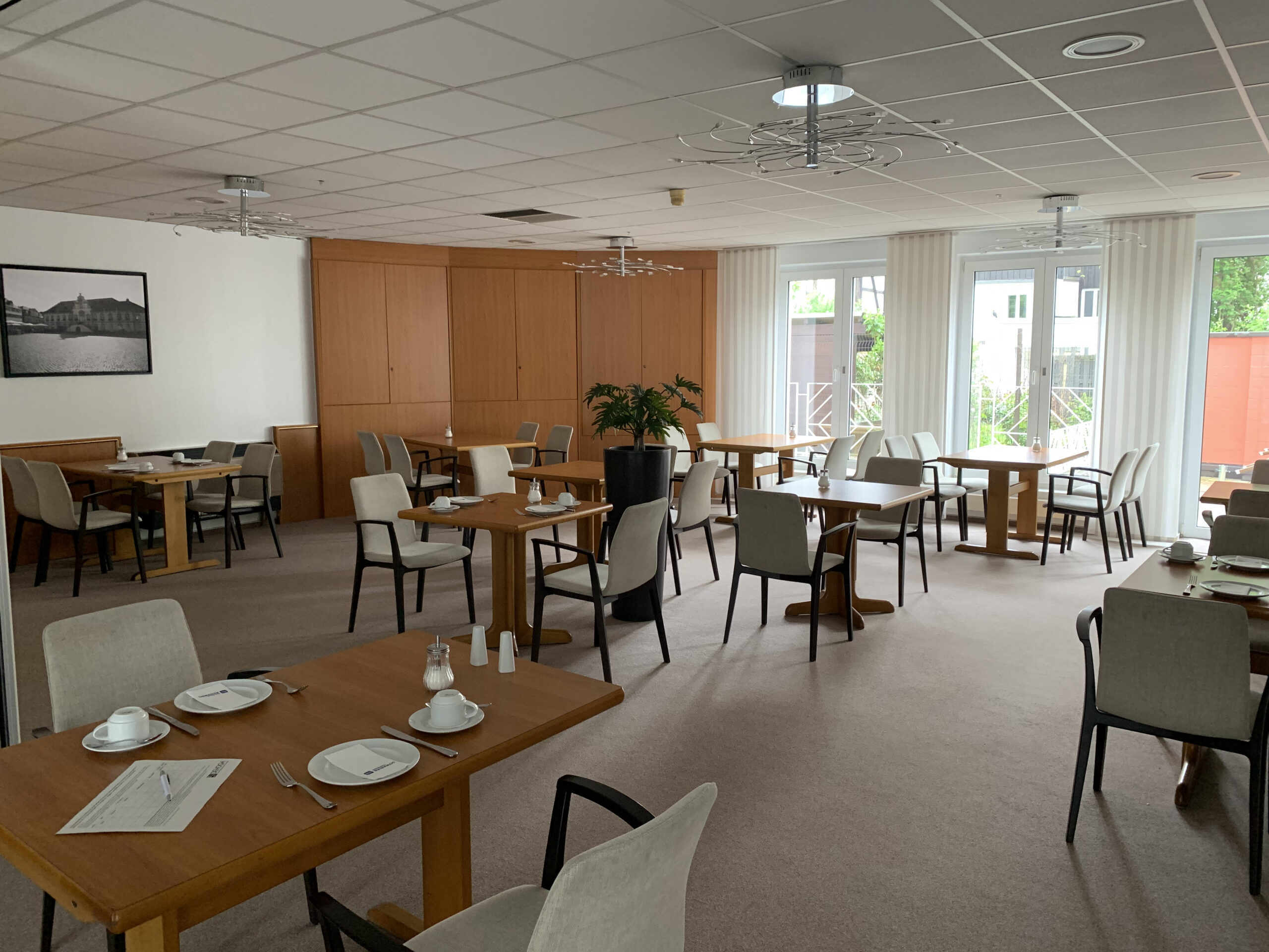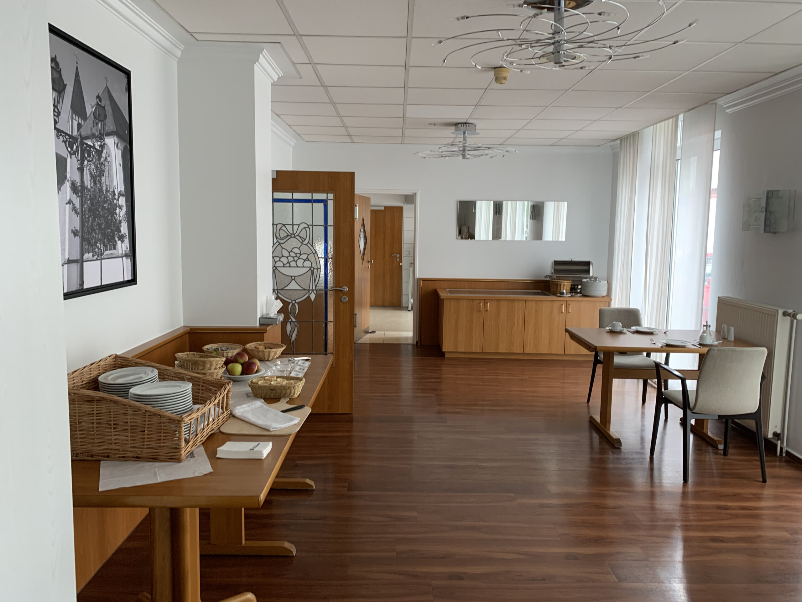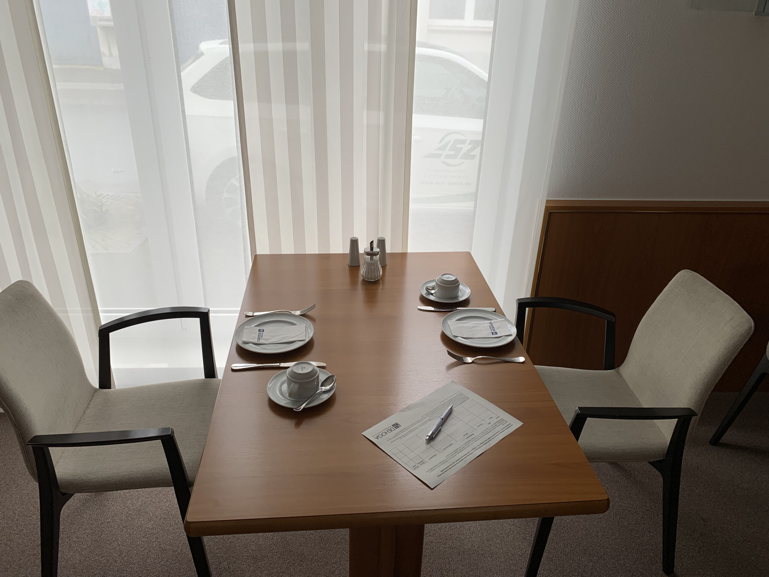 Der Frühstücksraum sieht ein wenig älter aus, aber ist durchaus zweckmässig eingerichtet.