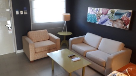 Der erste Eindruck vom Zimmer ist recht gut. Im Eingangsbereich ist das Wohnzimmer mit einer bequemen Couch und einem Tisch. Danach kam auf der linken Seite das Badezimmer, welches als Raumtrenner zwischen Wohnzimmer und Schlafbereich fungiert.