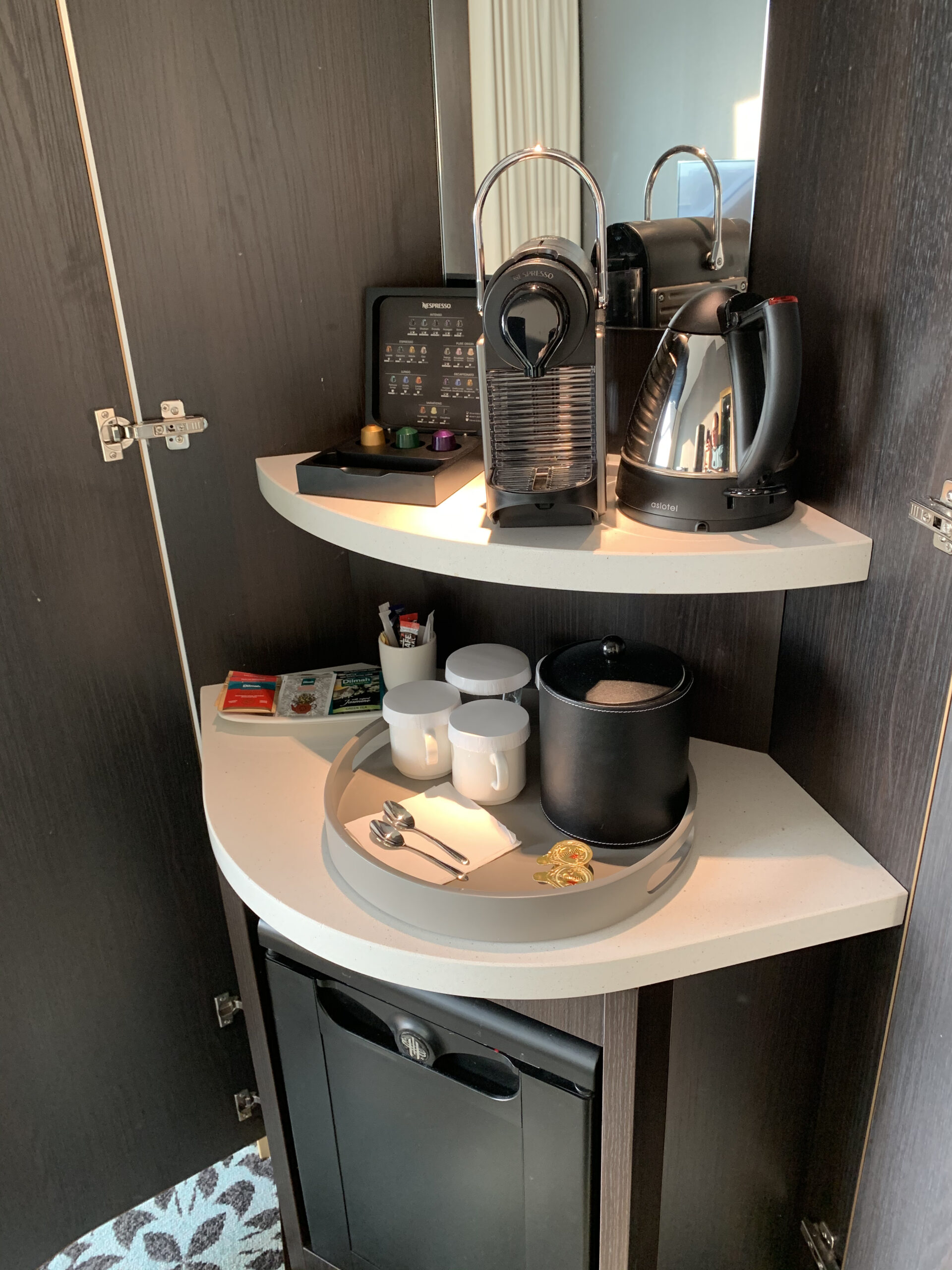 Daneben gibt es bequeme Sitzgelegenheiten und eine ordentliche Kaffee Maschine. In diesem Fall eine Nespresso Maschine sowie auch einen Wasserkocher mit einigen Teesorten. Für beides kann man ohne Probleme auch mehr Kaffe/ Tee bei der Rezeption nachfragen welches dann auch nach kurzer Zeit aufs Zimmer gebracht wird.