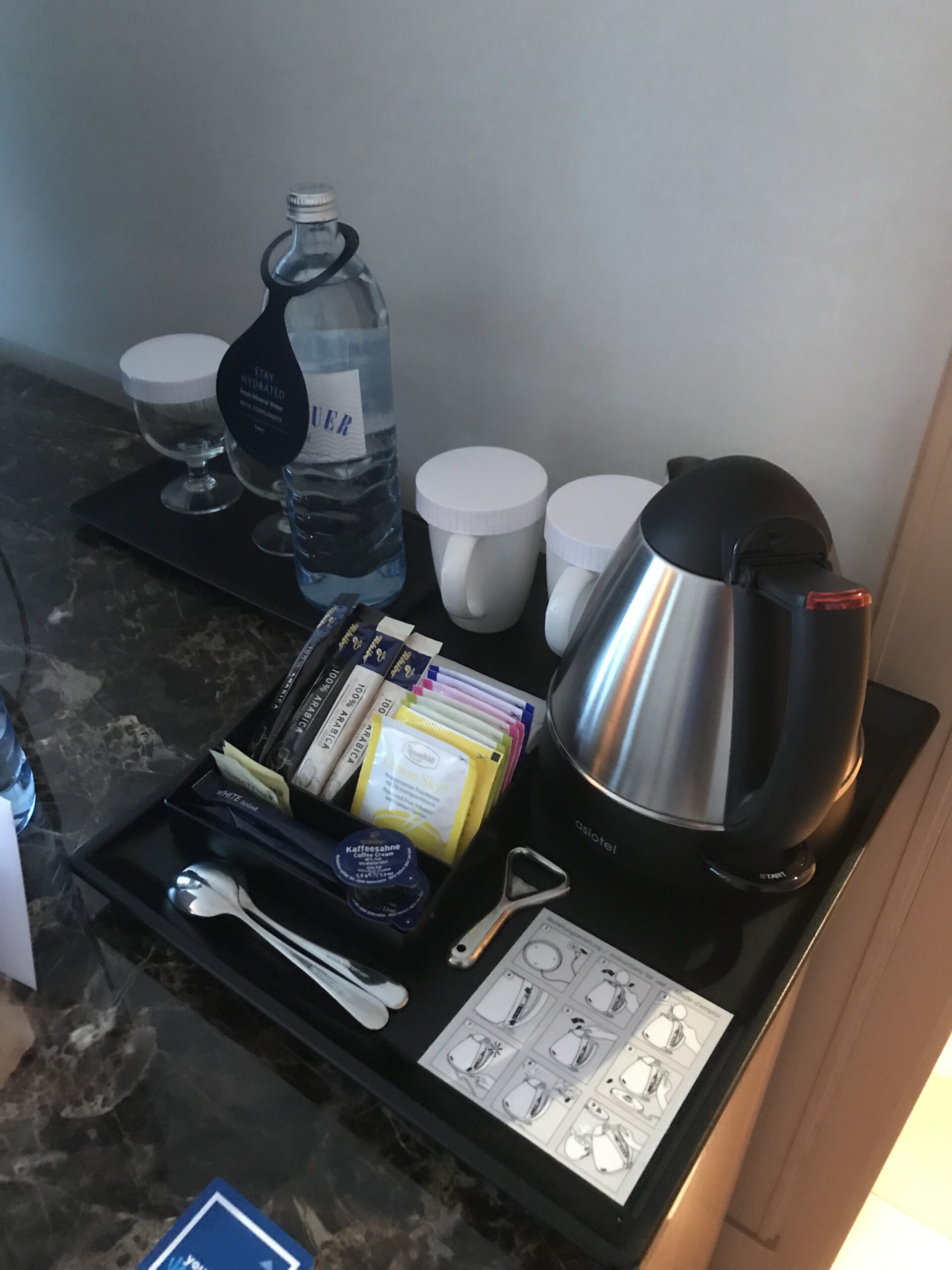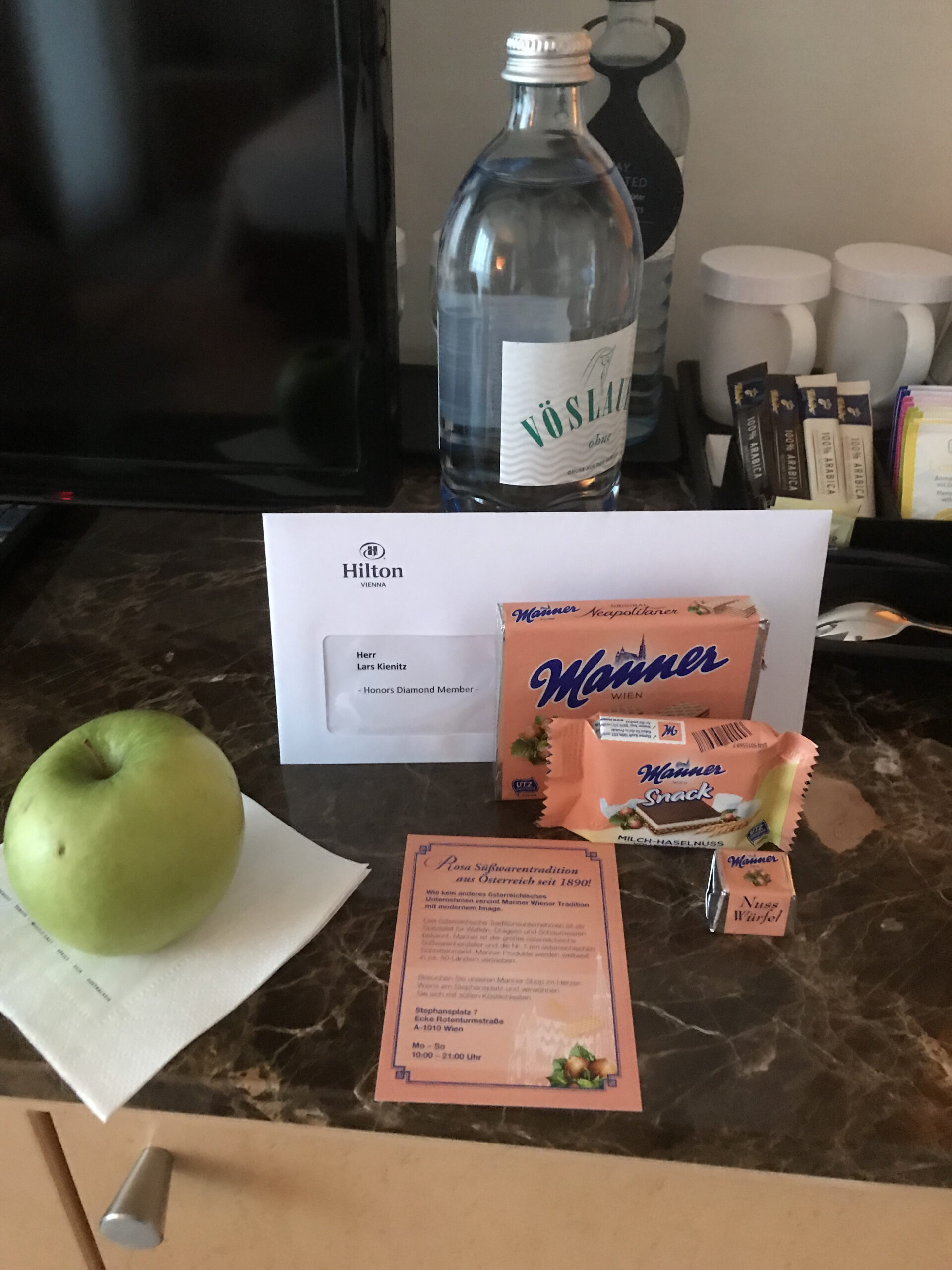 Neben dem Wasserkocher hatte es noch Tee/ Kaffee sowie eines der Willkommens Geschenke sowie einen Brief. Vielleicht achten nicht viele darauf, aber ich finde dies immer wieder einen sehr persönlichen Touch. Hier waren neben allgemeinen Angaben auch noch die aktuelle Punkteübersicht von Hilton aufgeführt.