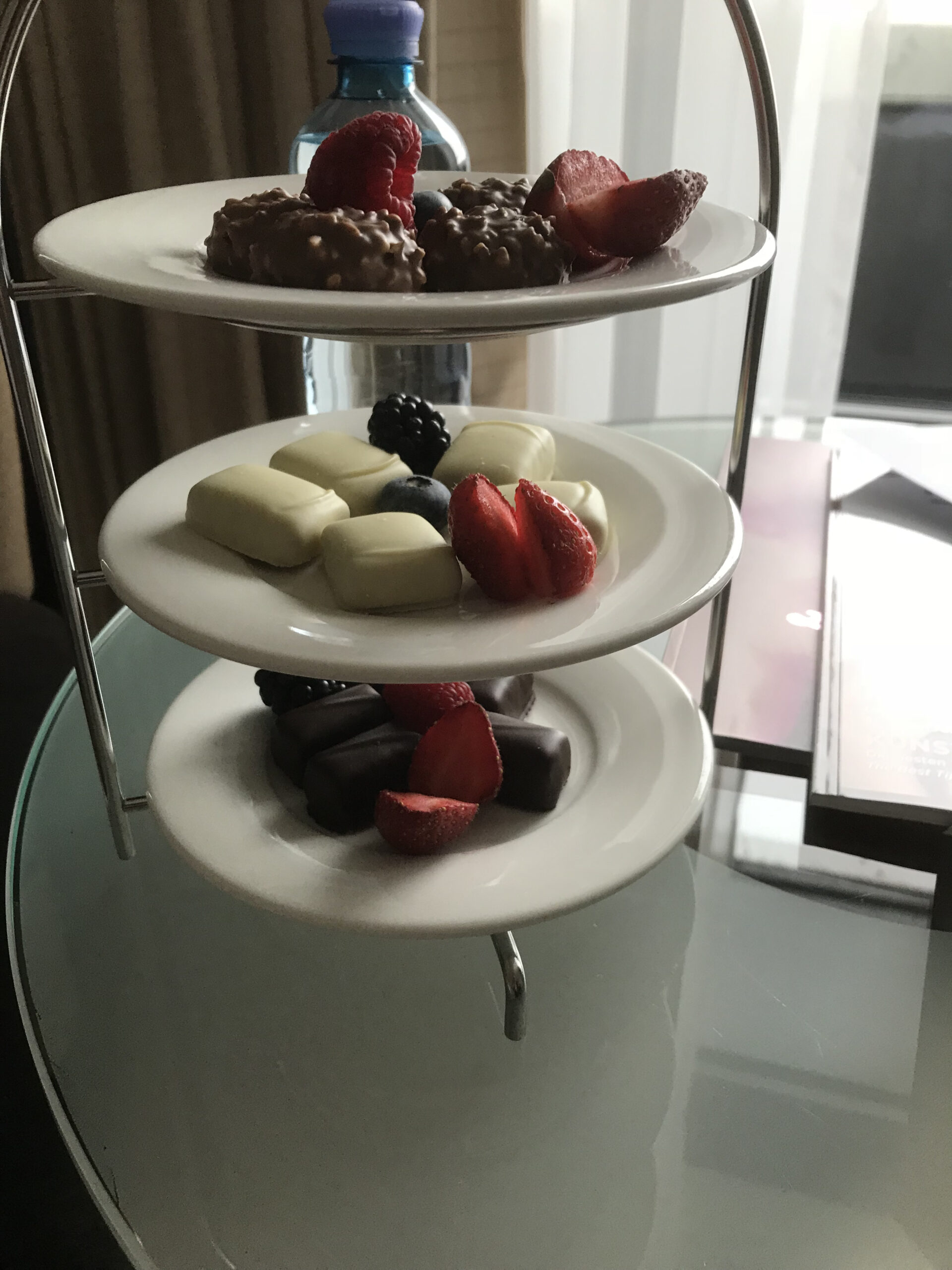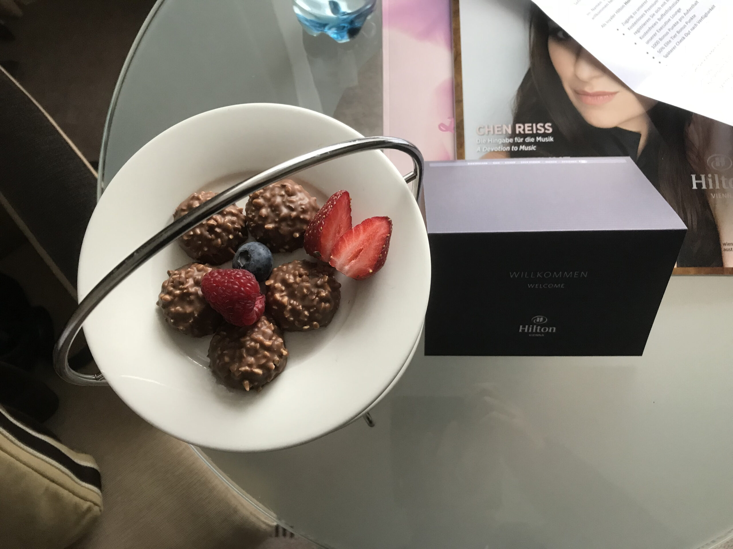 Erst einmal hatte es dort ein doch sehr bequemes Bett (die Betten bei Hilton finde ich eben schon sehr bequem), auf der anderen Seite hatte es dann einen Schreibtisch und Fernseher. Dazu kommt dann noch das schöne Willkommens Geschenk – wobei es hier kurz darauf noch ein Weiteres Geschenk gab.