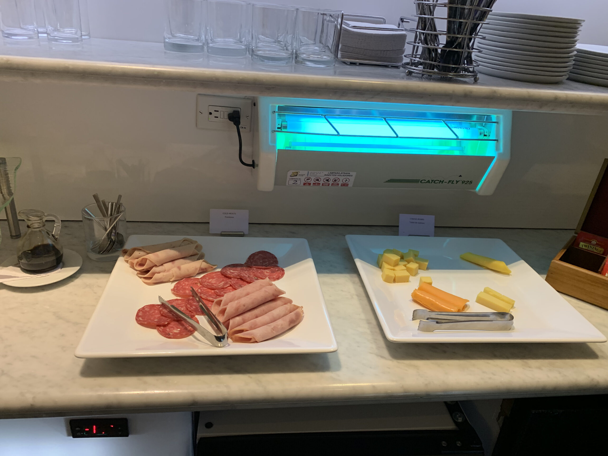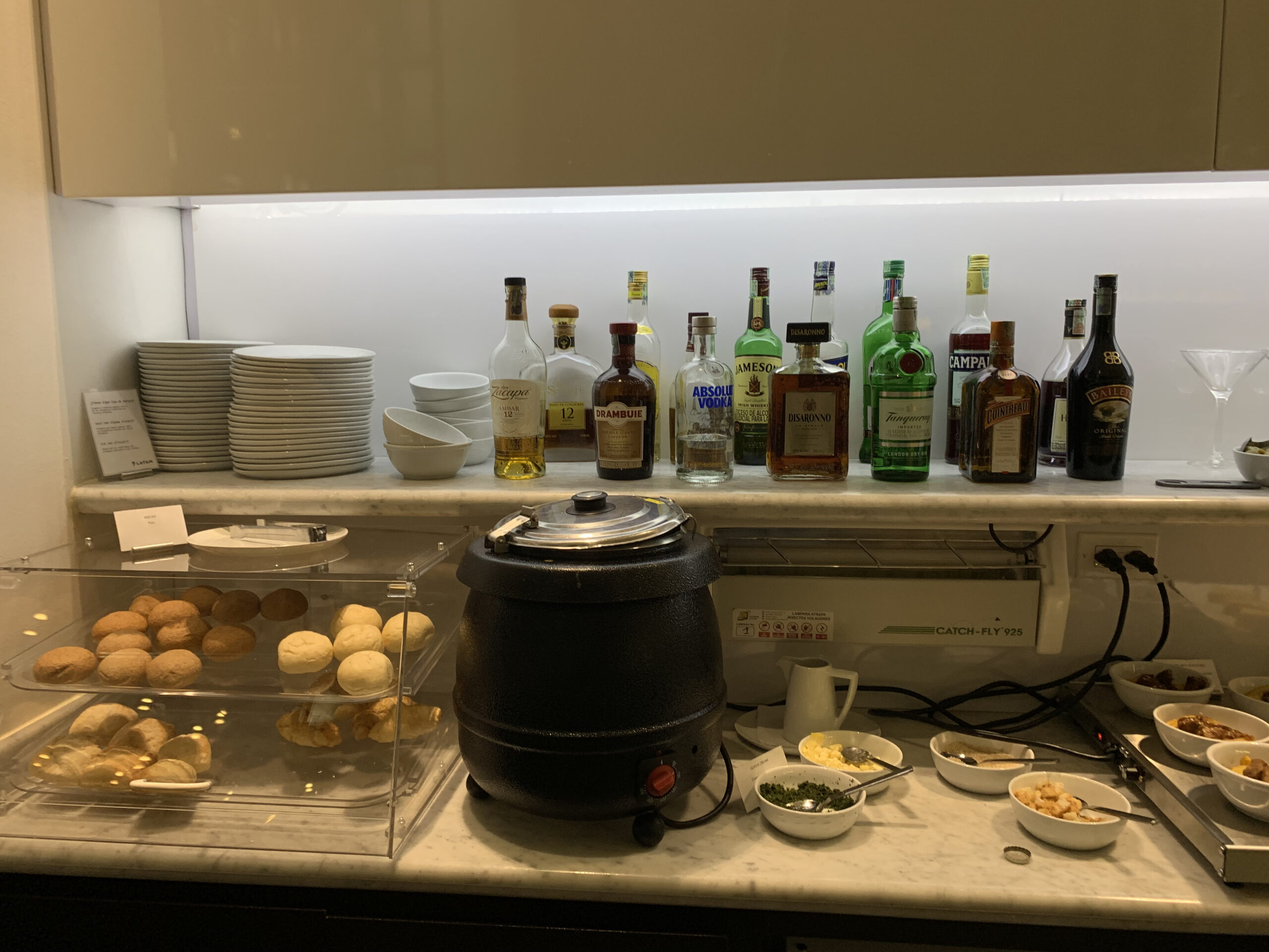 Dazu kommt dann eine einfacher aber nicht schlechte Auswahl an Essen (Sandwiches, Salat, Aufschnitt, Obst) und Getränken. Neben Softgetränken (im Kühlschrank) hat es auch alkoholische Getränke Auswahl. Von der doch leider minderwertigen Kaffeemaschine würde ich allerdings die Finger lassen.