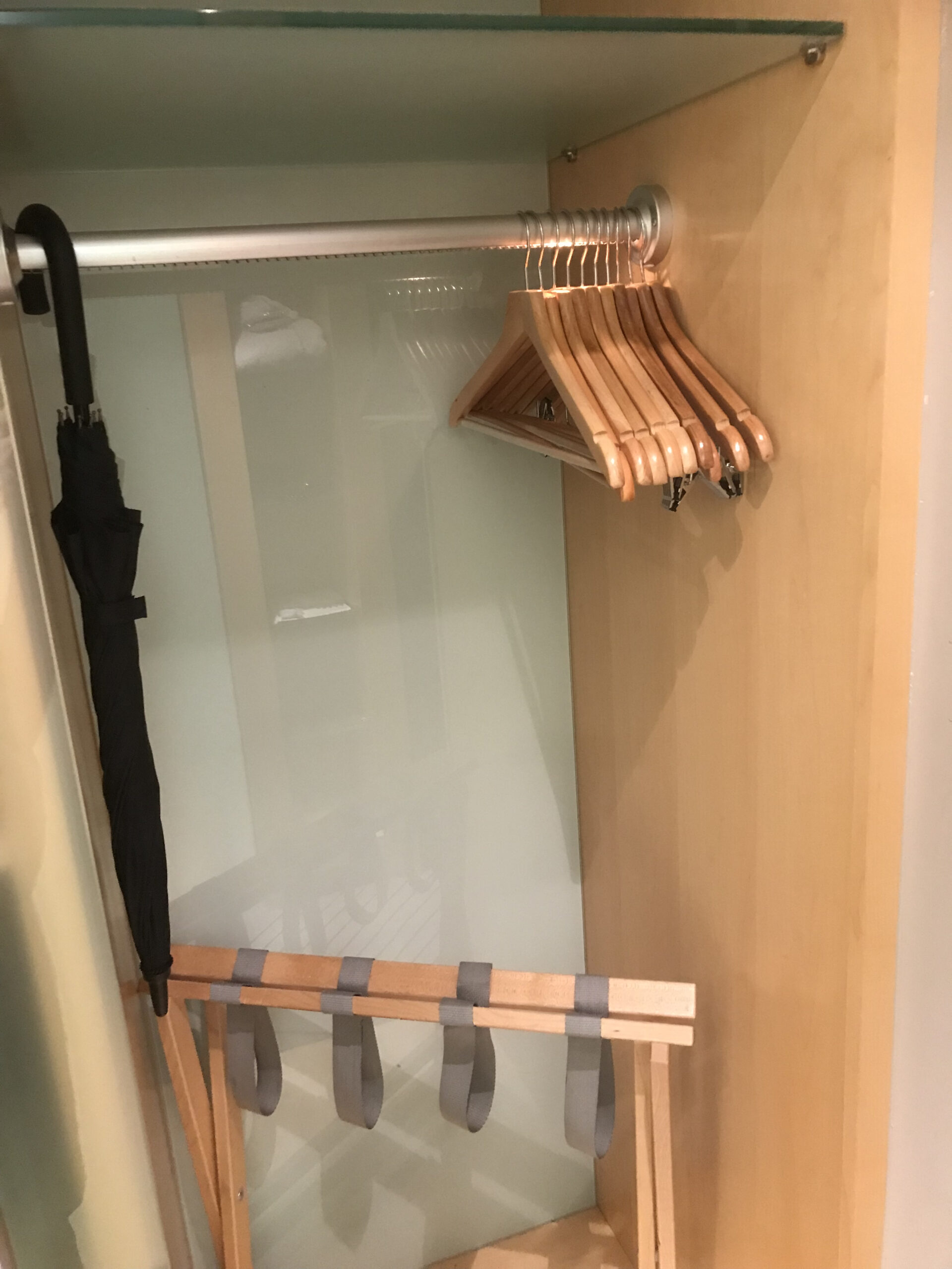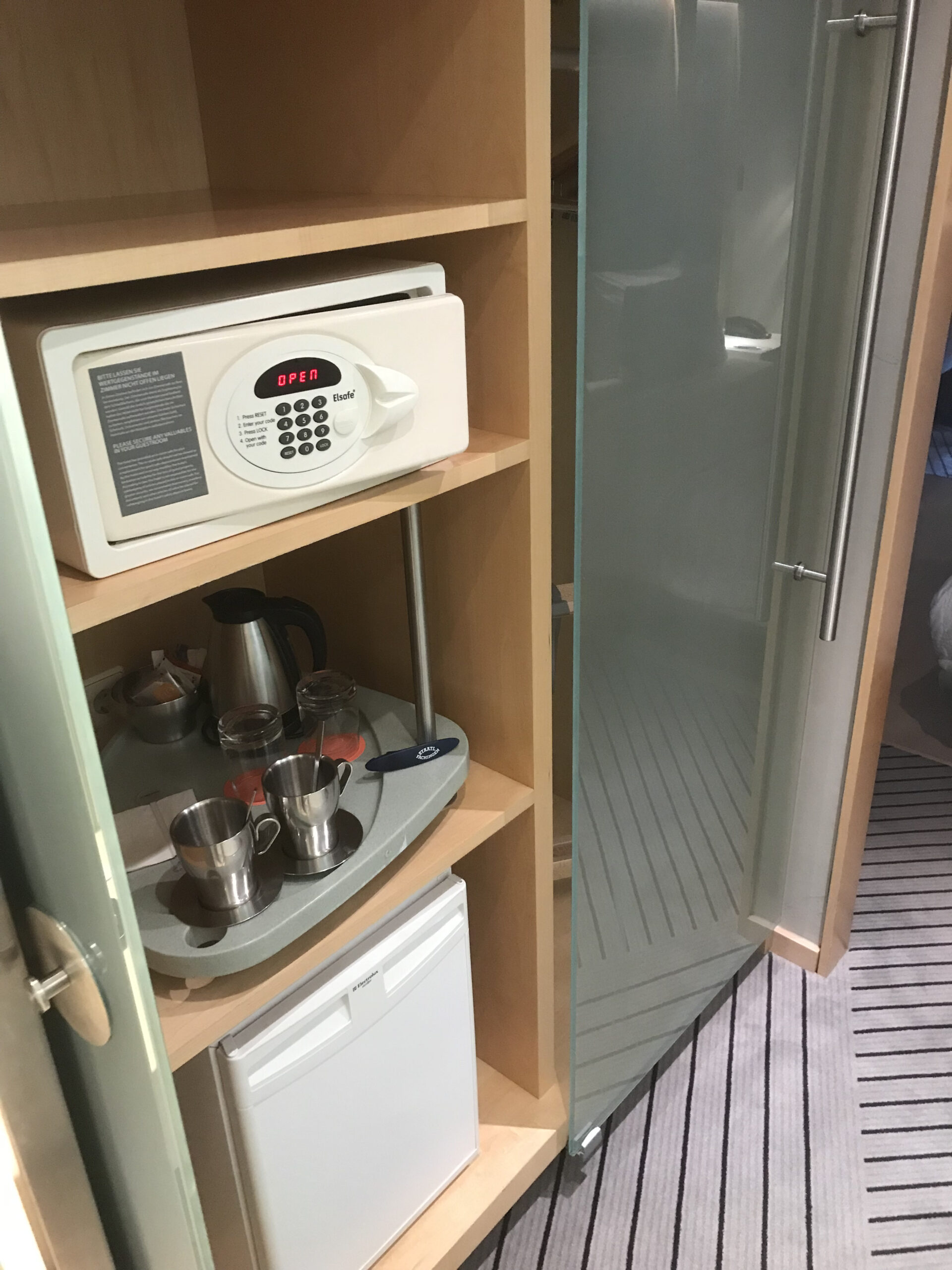 Im Eingangsbereich befindet sich eine Möglichkeit Kaffee / Tee zuzubereiten, dann ein Schrank mit Safe und Bademantel.