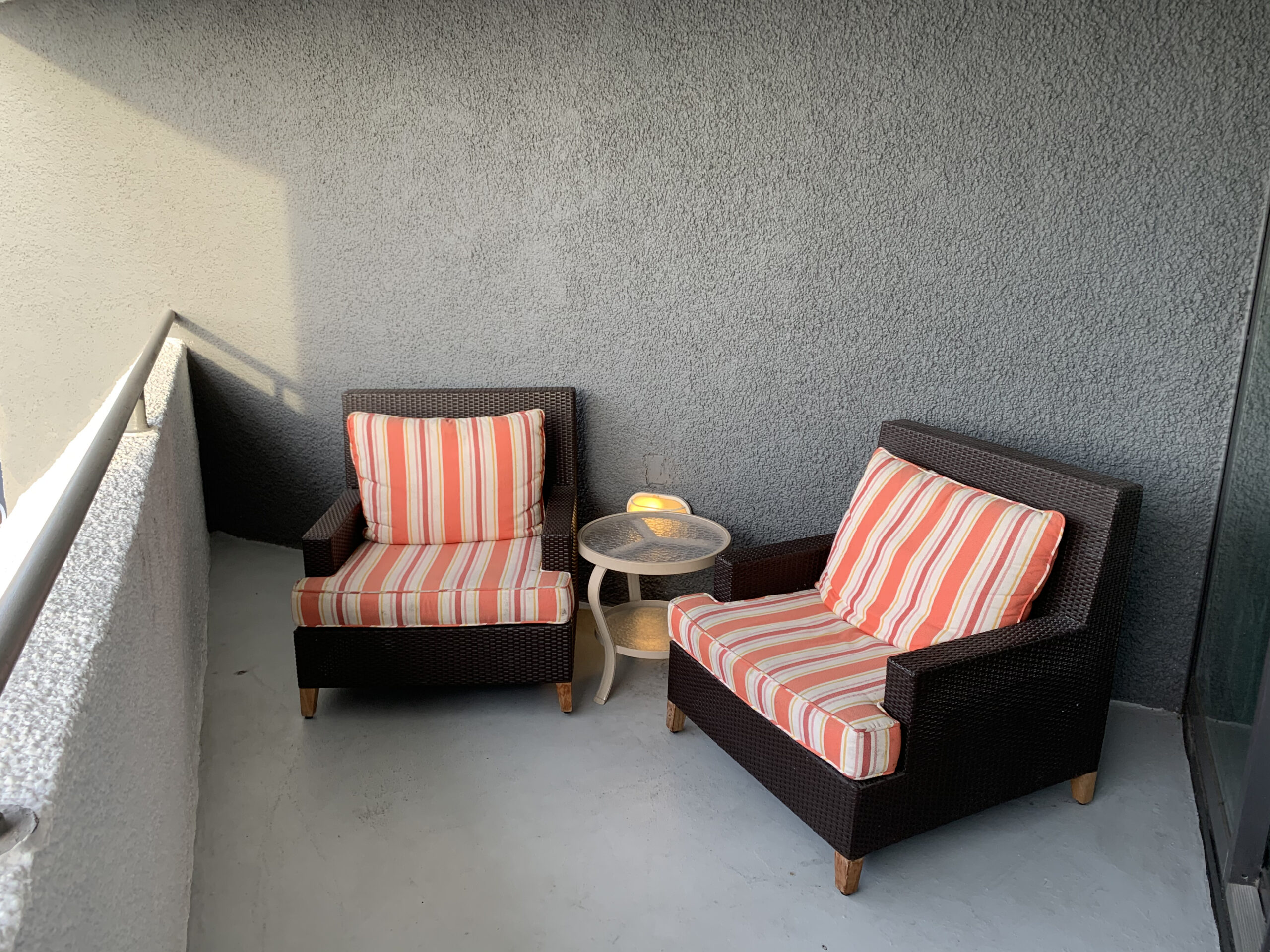 Eine Besonderheit gab es noch, es war der Balkon mit einer doch recht bequemen Sitzecke. Die Aussicht war nicht gerade berauschend (auf ein anderes Hotel), aber dennoch war es eine schöne Abwechslung.