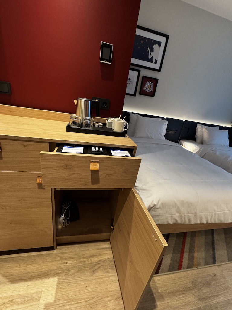 Im Eingangsbereich des Zimmers gibt es wie immer einen Schrank auf denen ein Wasserkocher steht mit dazugehörigen Tee/Kaffee. Eingebaut ist auch ein Safe, Kühlschrank (leer) und Bügeleisen.