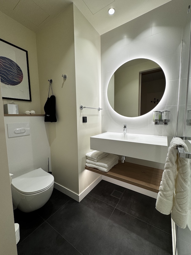 Das Badezimmer ist kompakt aber hat auch alles was es braucht. Dazu hat man hinter der Toilette noch eine kleine Ablagefläche für sonstige Sachen.