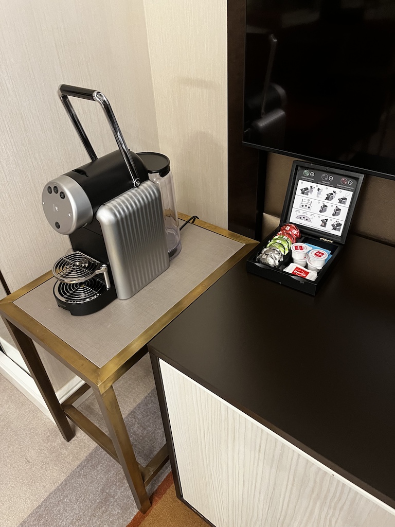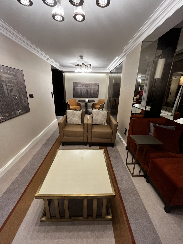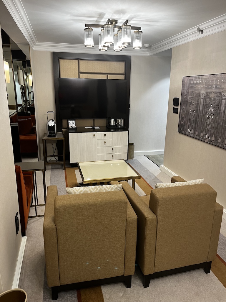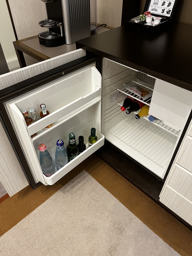 Sobald man in das Zimmer kommt, erwartet einen der Eingangsbereich – gefolgt von einem Wohnbereich. Es hat ebenfalls eine Nespresso Maschine sowie eine gefüllte Minibar.