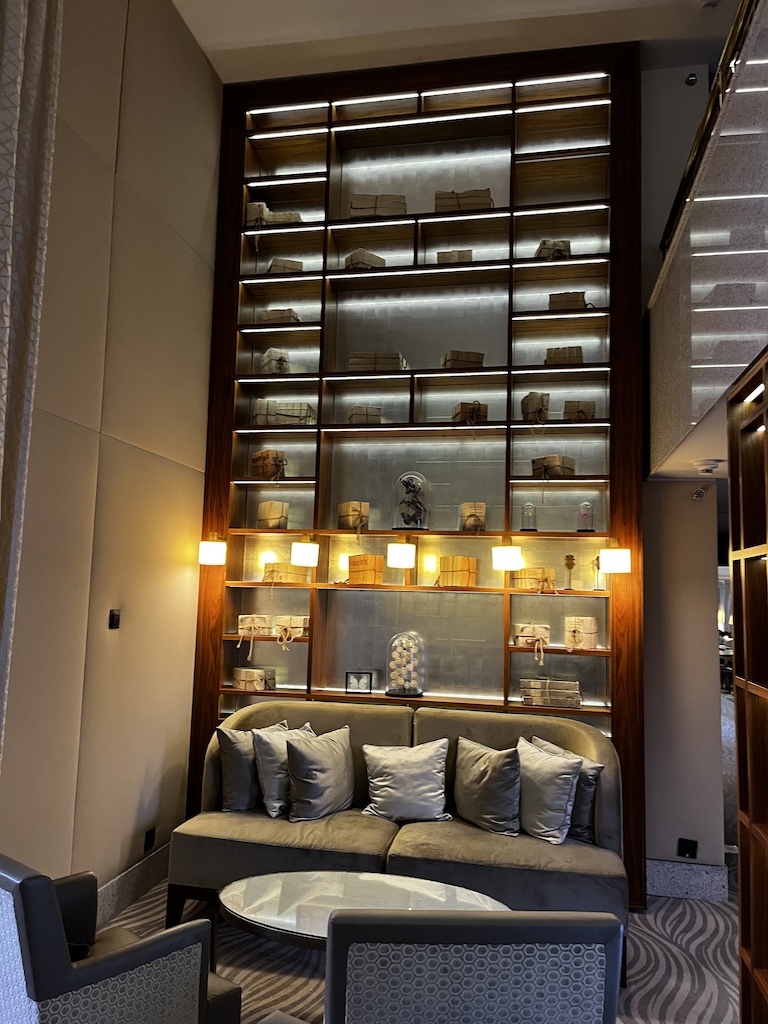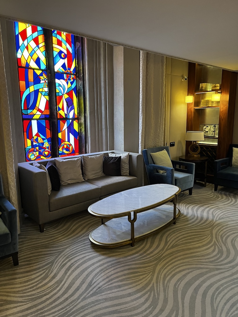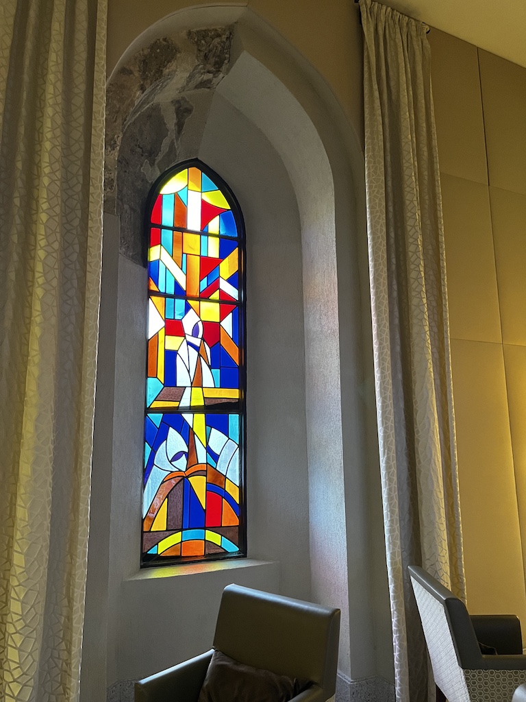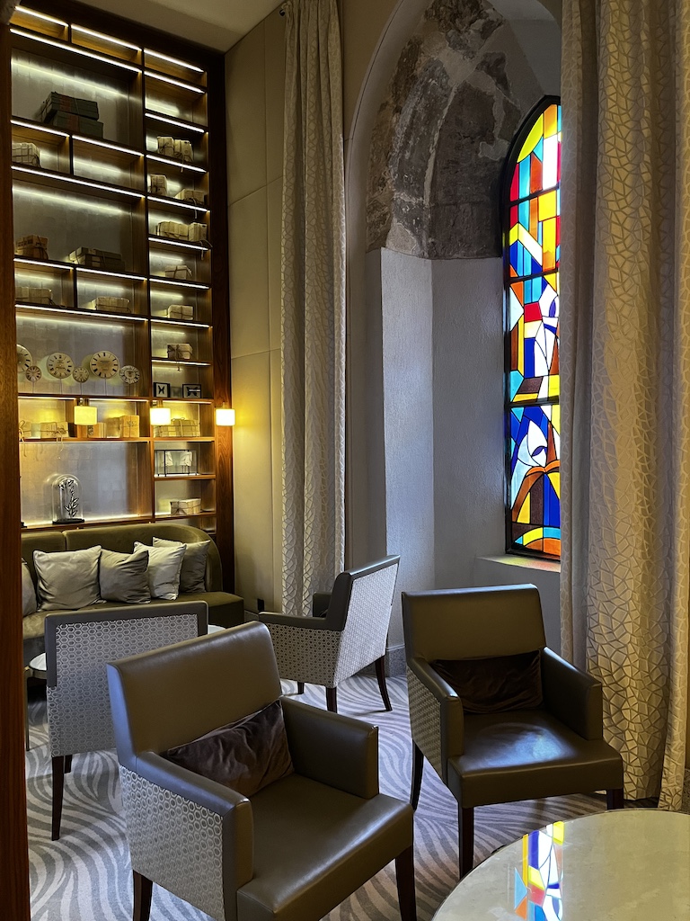 Die Lounge im Hotel ist sehr gross und hat viele verschiedene Sitzbereiche. Dazu kommen noch kleine Nischen die mit den alten Kirchenfenstern daher kommt.