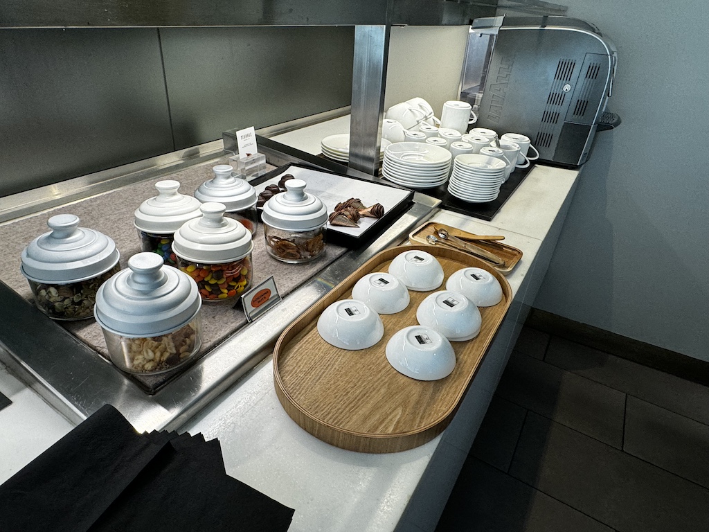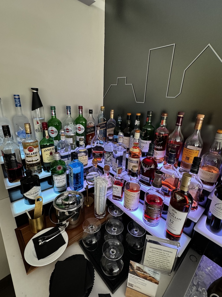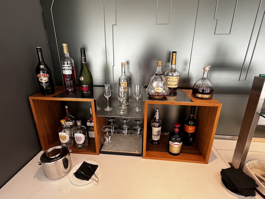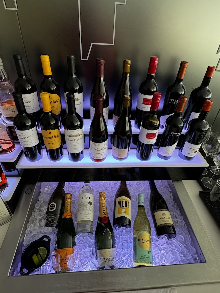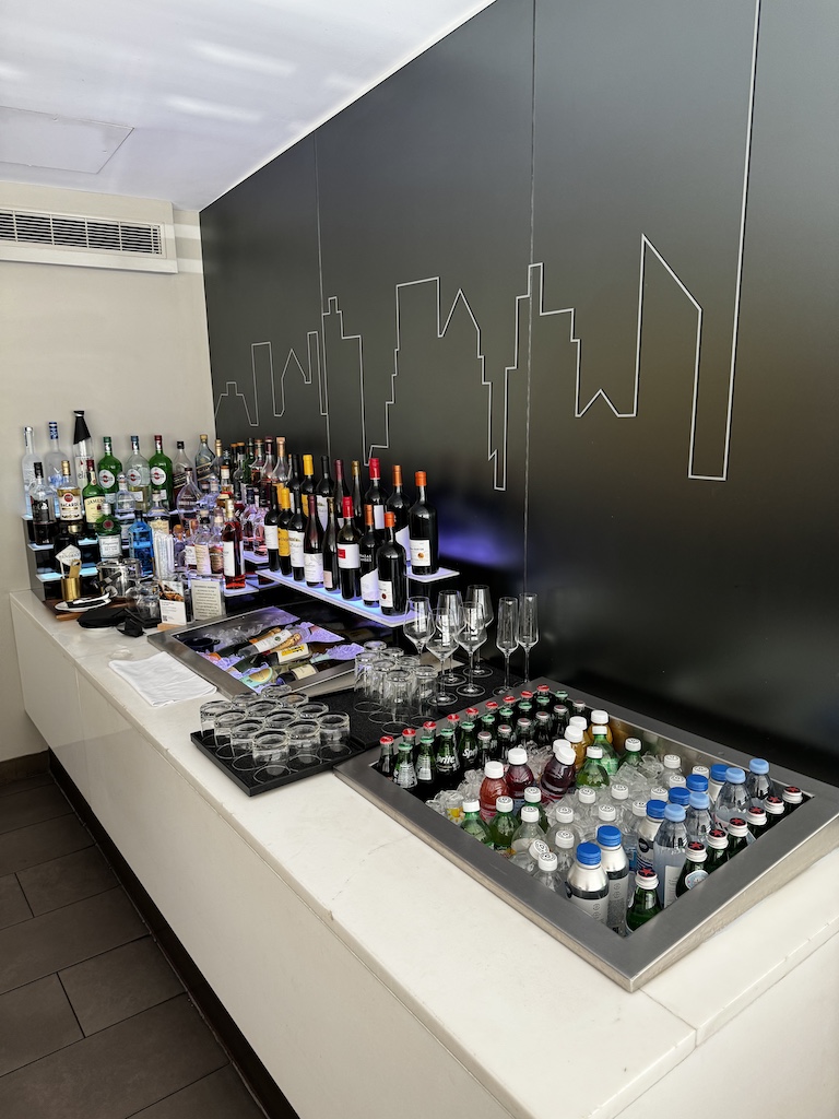 Wenn man in die Lounge kommt hat es auf der linken Seite einige Sitzgelegenheiten und eine Auswahl an Getränken wo man sich selbst bedienen kann.