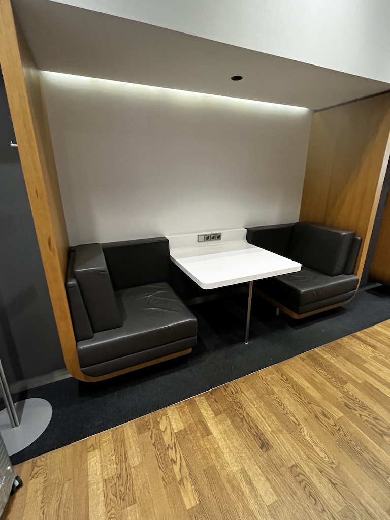 Weiter geht es dann mit verschiedenen Sitzmöglichkeiten. Auf der linken Seite sind es kleinere Boxen”, auf der rechten Seite gibt es einen Bereich mit Arbeitsplätzen und natürlich genügend Platz mit weiteren bequemen Sitzen.