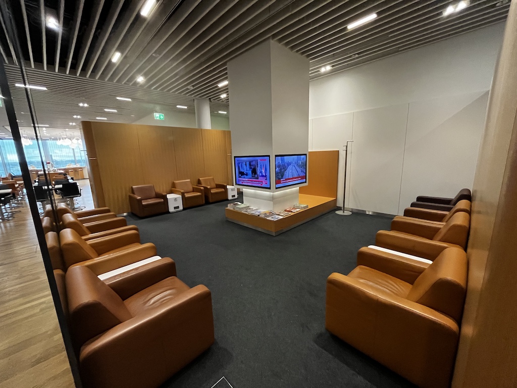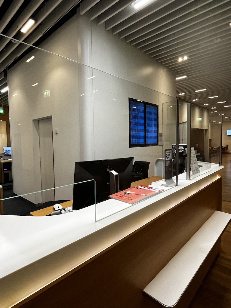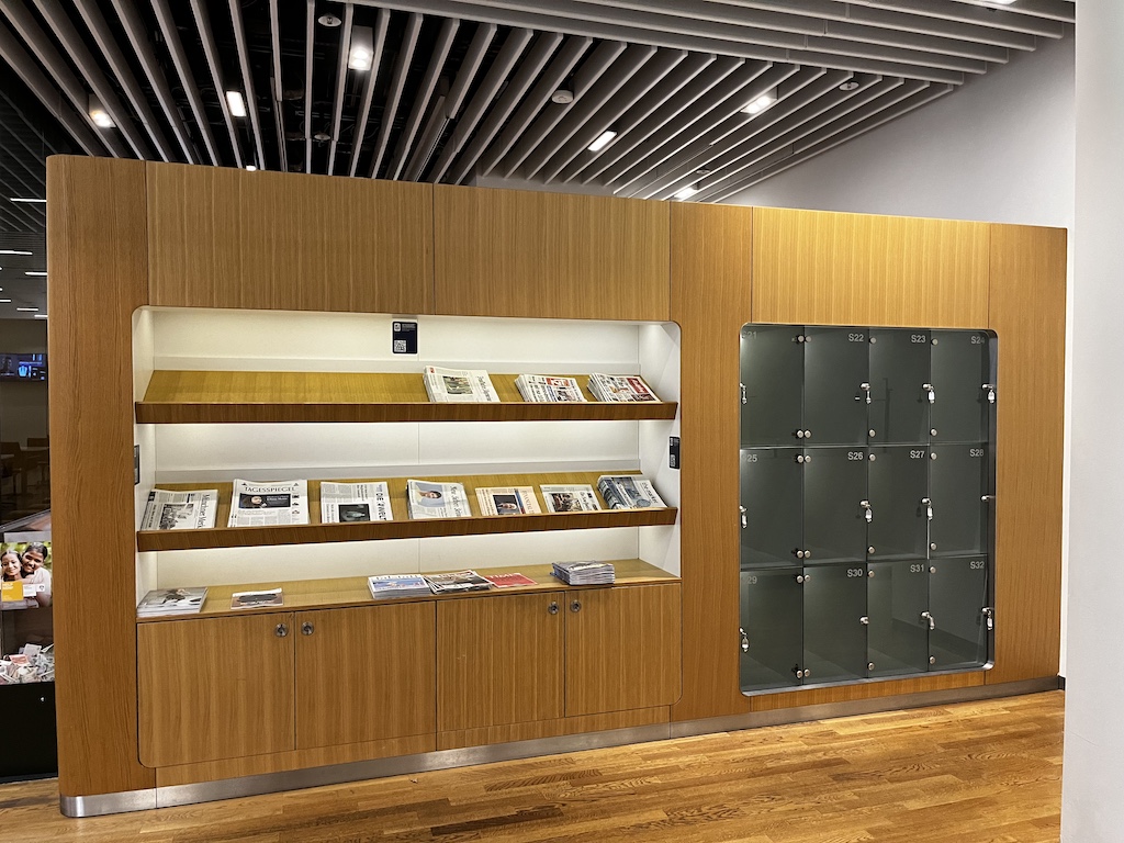 Die Lounge ist wie ein grosses T” aufgebaut. Nach dem Eingangsbereich habt ihr auf der rechten Seite die Möglichkeit Zeitschriften zu nehmen und auch euer Gepäck einzuschliessen.