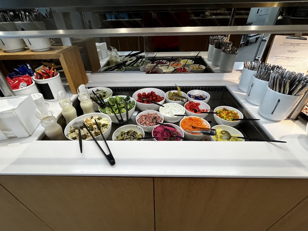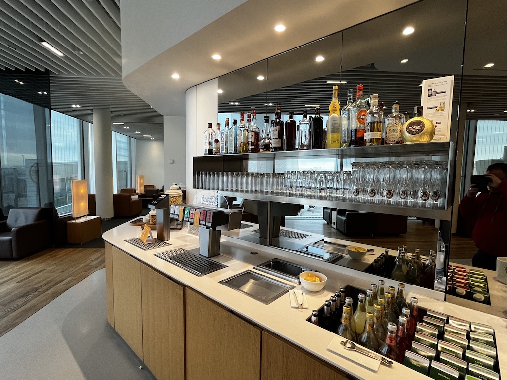 Im hinteren Bereich der Lounge hat es dann die Speisen und Getränkeauswahl. Diese deckt sich mit dem Standart der Lufthansa Lounges und ist meiner Meinung nach sehr ansprechend. Auch an Brezeln hat man hier natürlich gedacht 🙂