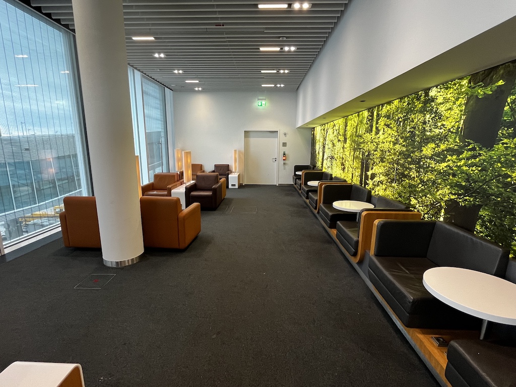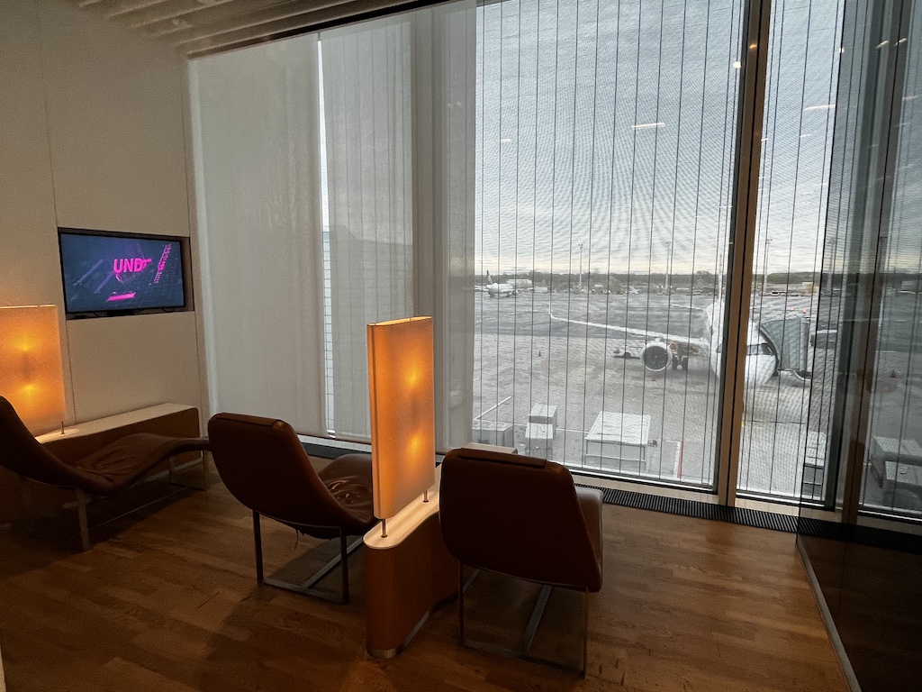 An der Fensterfront hat es dann nochmals auf beiden Seiten einen Sitzbereich. Von hier hat man wiederum einen schönen Ausblick auf den Tarmac.