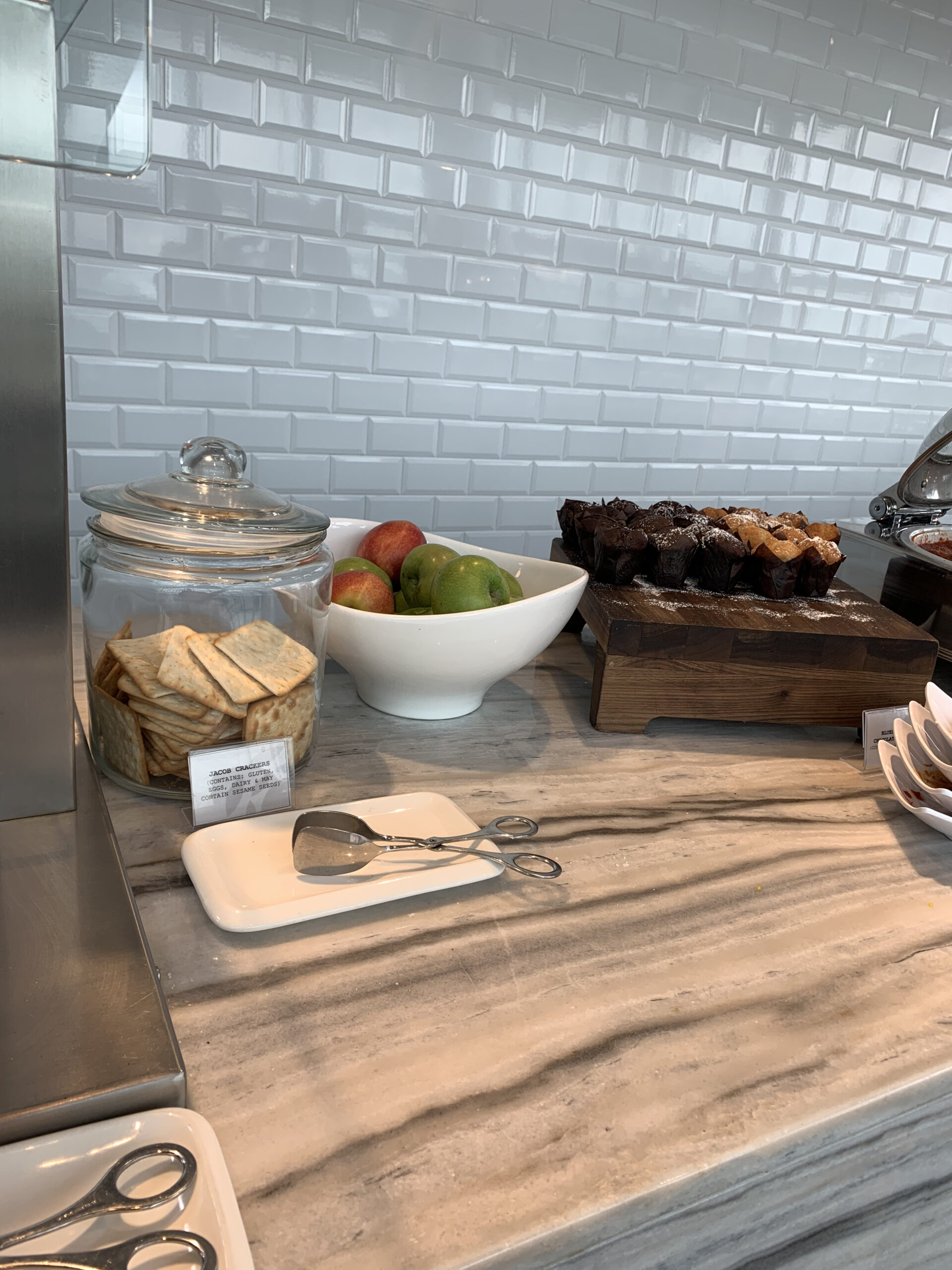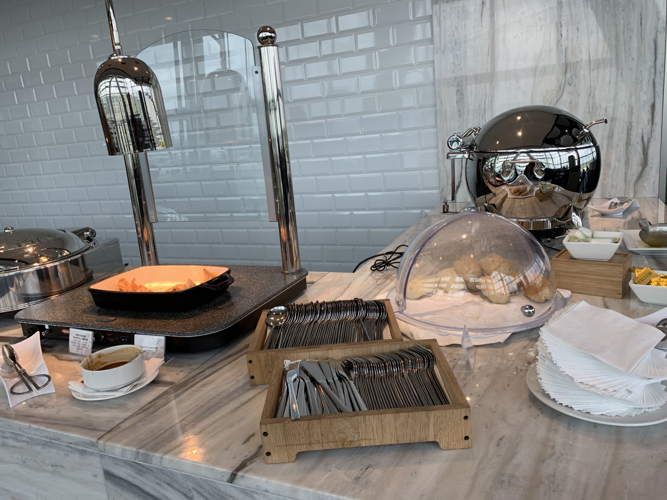 Die Lounge hat das Design wie ein hingelegtes U”, daher kommt ihr dort hinein und müsst euch dann rechts halten um in die eigentlich Lounge zu gelangen. Dort erwartet euch dann neben vielen Einzeltischen (yeaaa mit Steckdosen) auch das Buffet, eine Bar (bedient) sowie Toiletten.