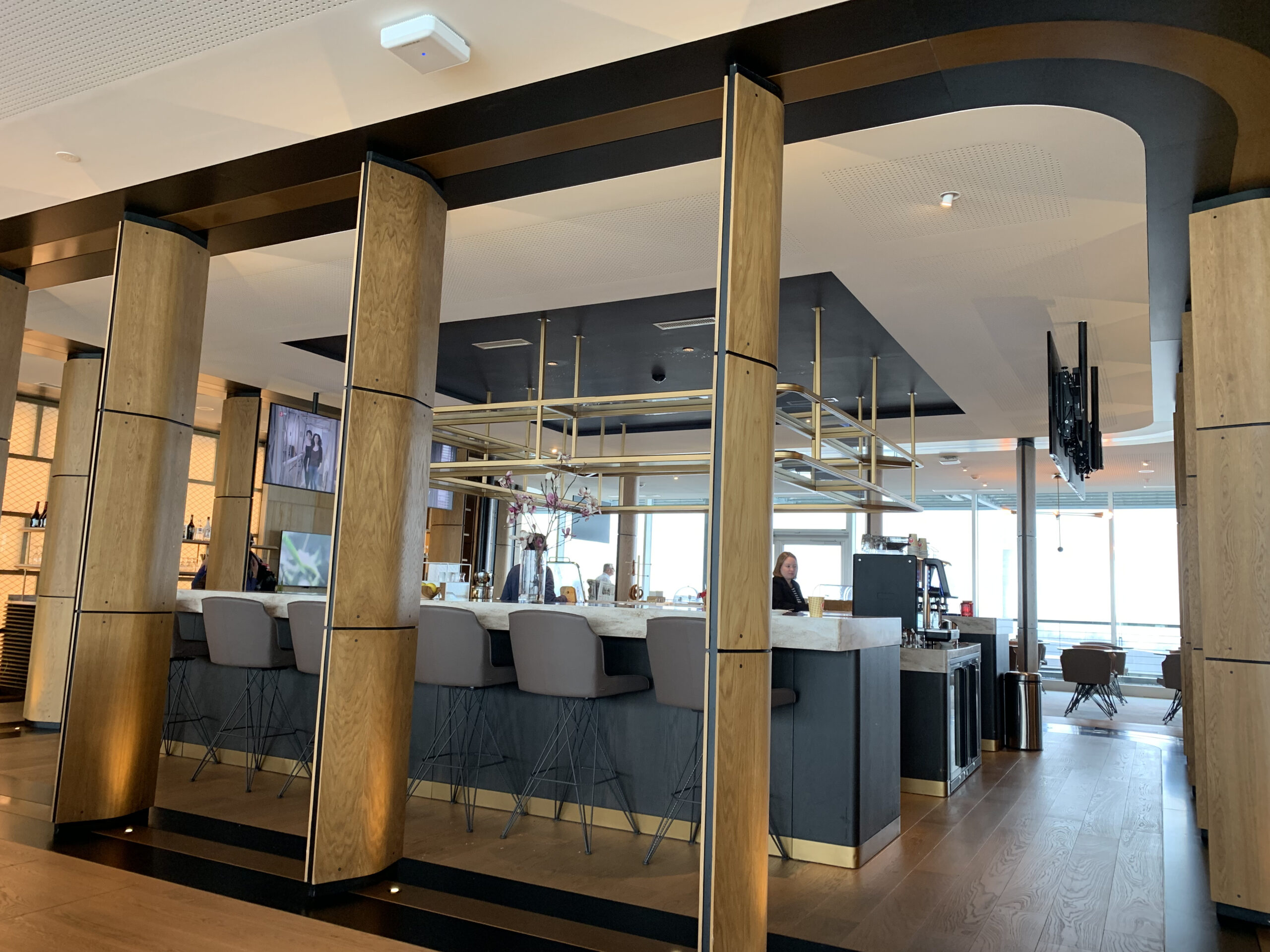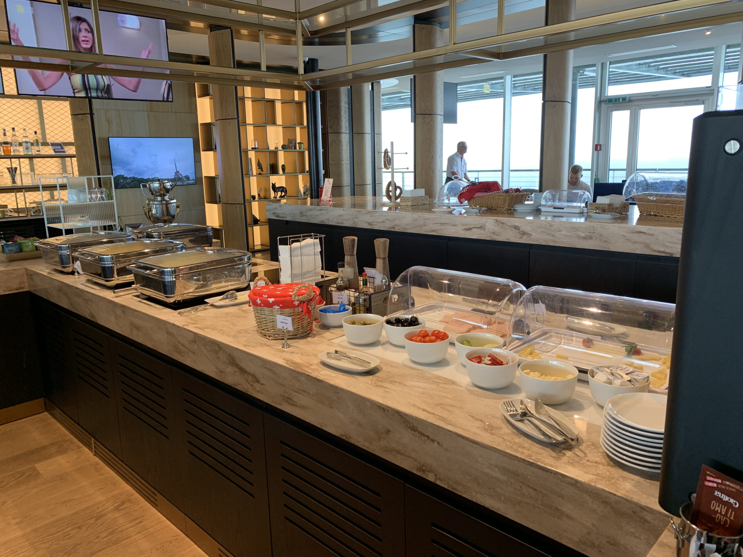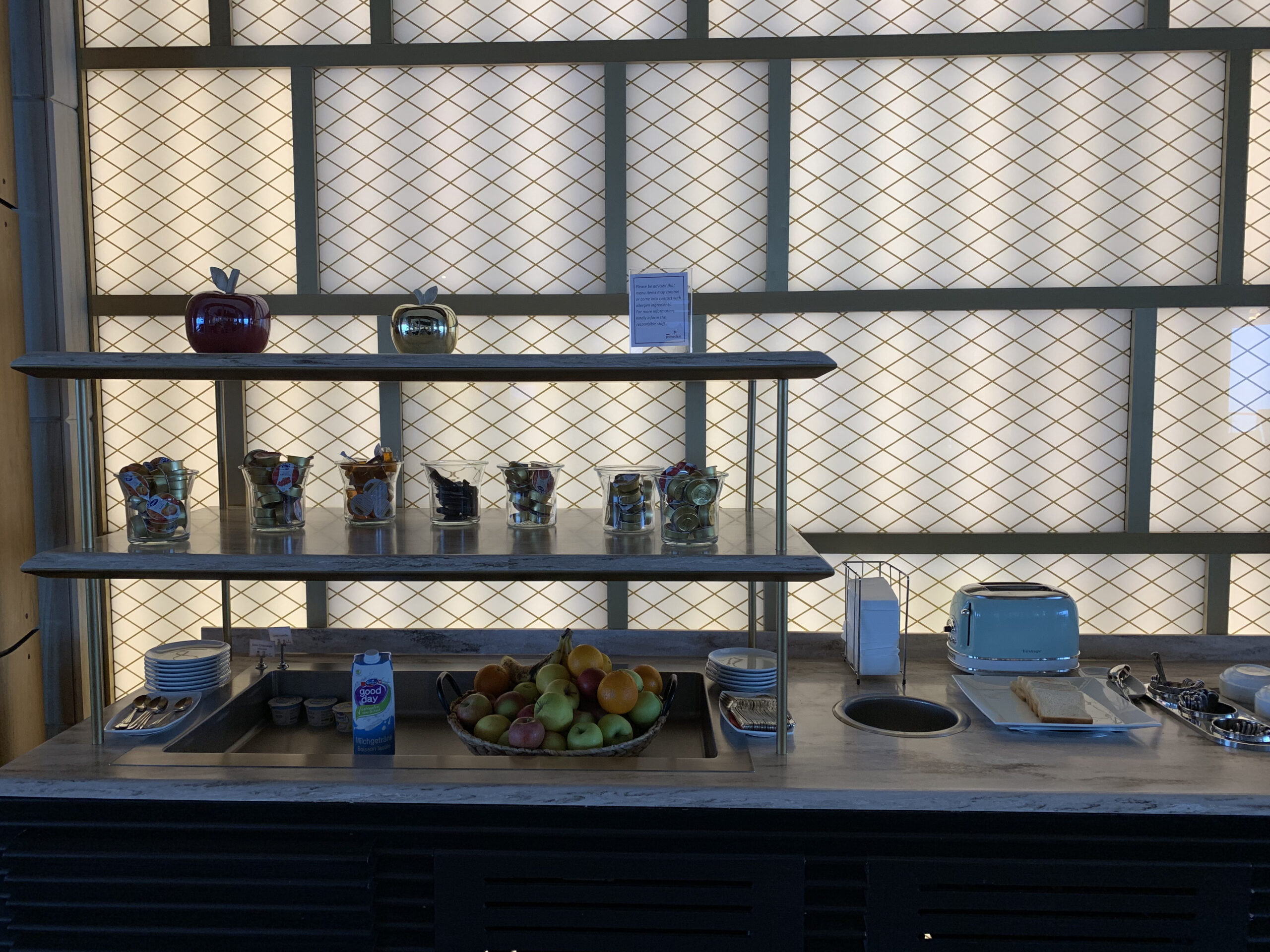 Es fällt einem auf, dass diese Lounge doch recht gross ist (834 QM wie ich gelesen habe) und daher findet man neben einer Bar, auch einen separaten Buffett Bereich sowie Kühlschränke mit Softdrinks wie auch Alkohol. Auch hat man Zutritt zu der Terrasse (bei gutem Wetter). Das Angebot der Speisen variiert je nach Tageszeit, aber ist wirklich sehr ansprechend und gut präsentiert. Auch wirkt alles sehr hell und es hat schöne Raustrennen die sehr modern wirken.