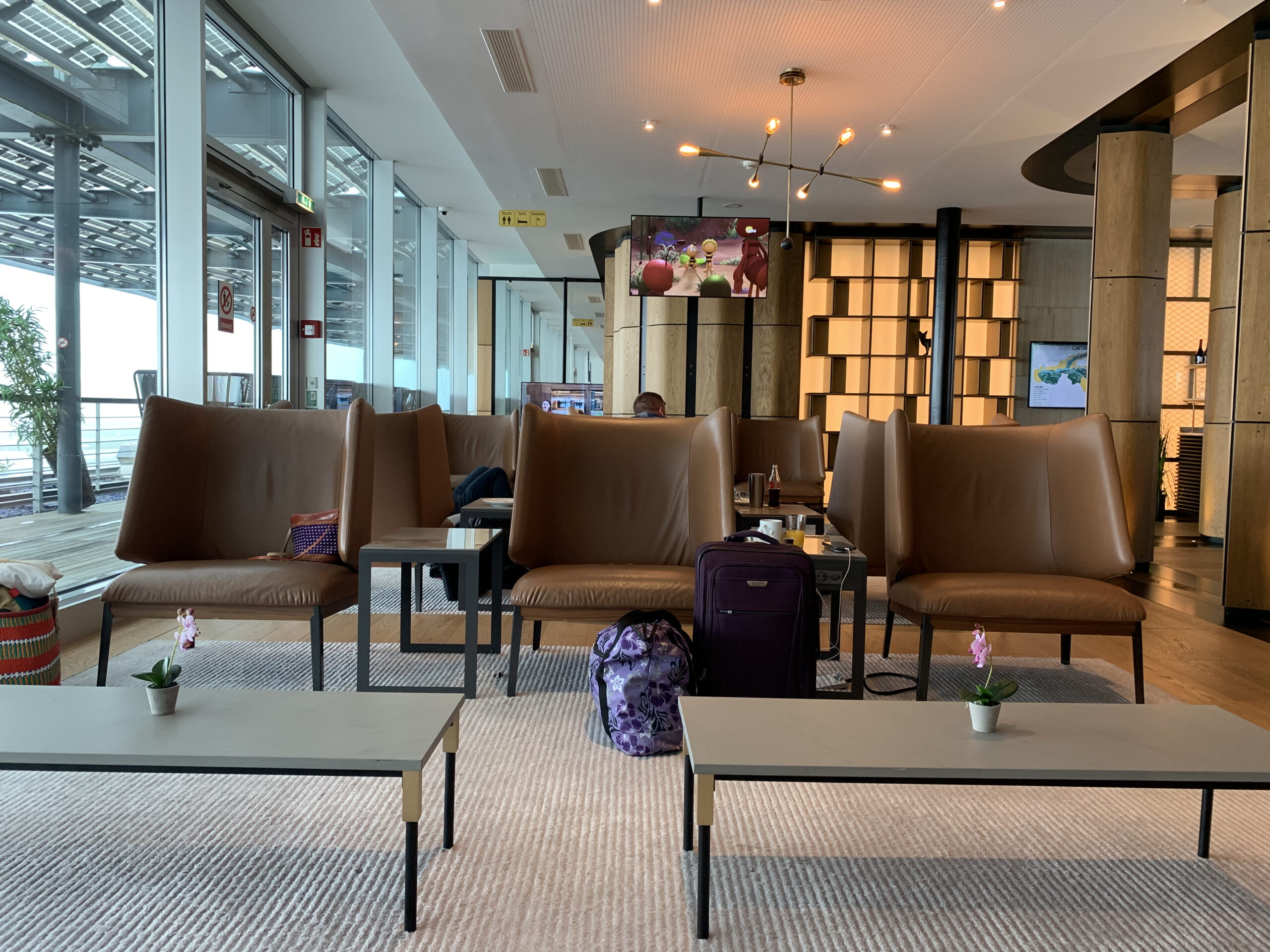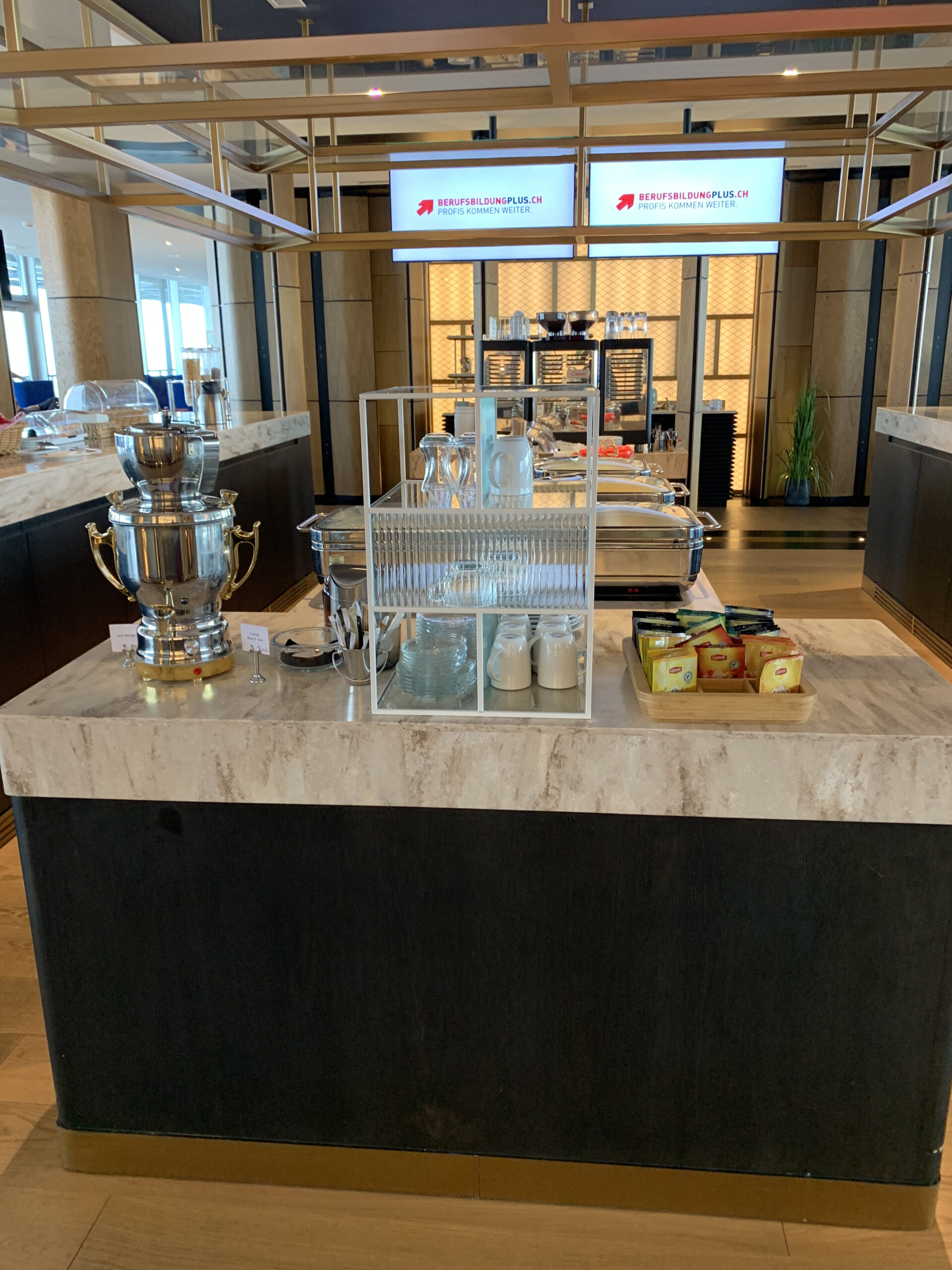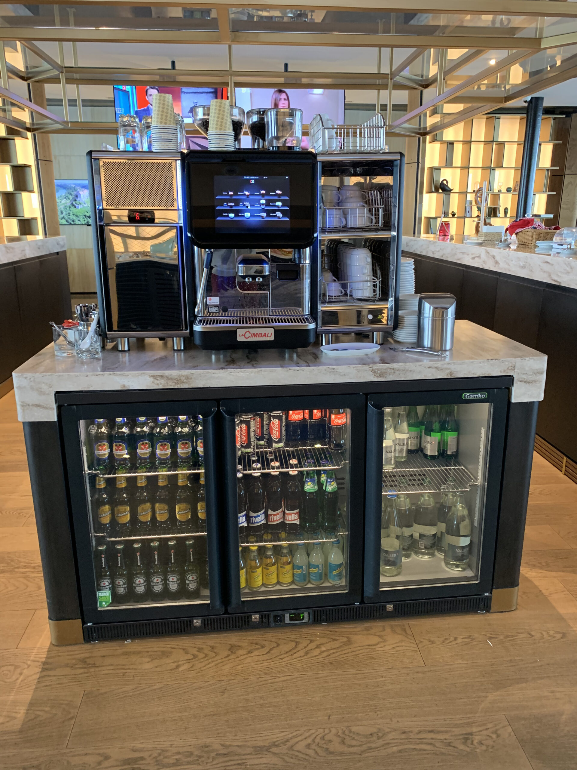Es fällt einem auf, dass diese Lounge doch recht gross ist (834 QM wie ich gelesen habe) und daher findet man neben einer Bar, auch einen separaten Buffett Bereich sowie Kühlschränke mit Softdrinks wie auch Alkohol. Auch hat man Zutritt zu der Terrasse (bei gutem Wetter). Das Angebot der Speisen variiert je nach Tageszeit, aber ist wirklich sehr ansprechend und gut präsentiert. Auch wirkt alles sehr hell und es hat schöne Raustrennen die sehr modern wirken.