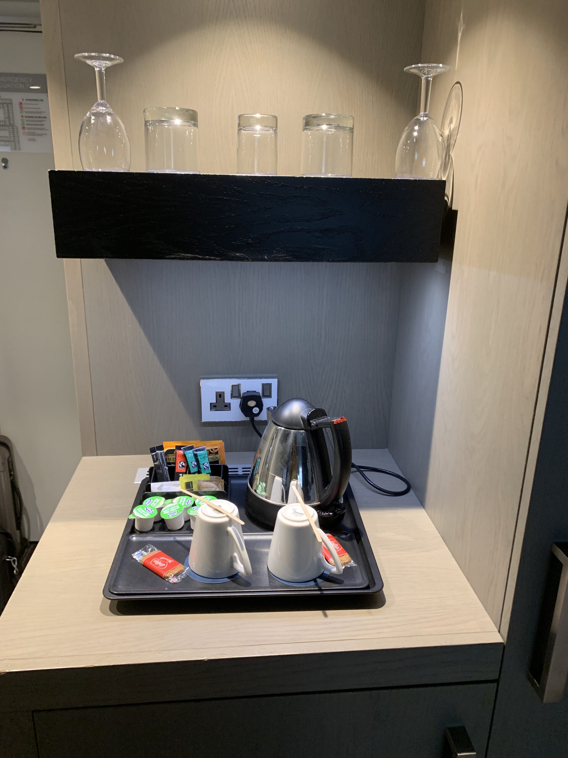 Direkt im Eingangsbereich gibt es eine Möglichkeit sich einen Kaffee oder Tee zu machen. Der Kühlschrank war allerdings leer.