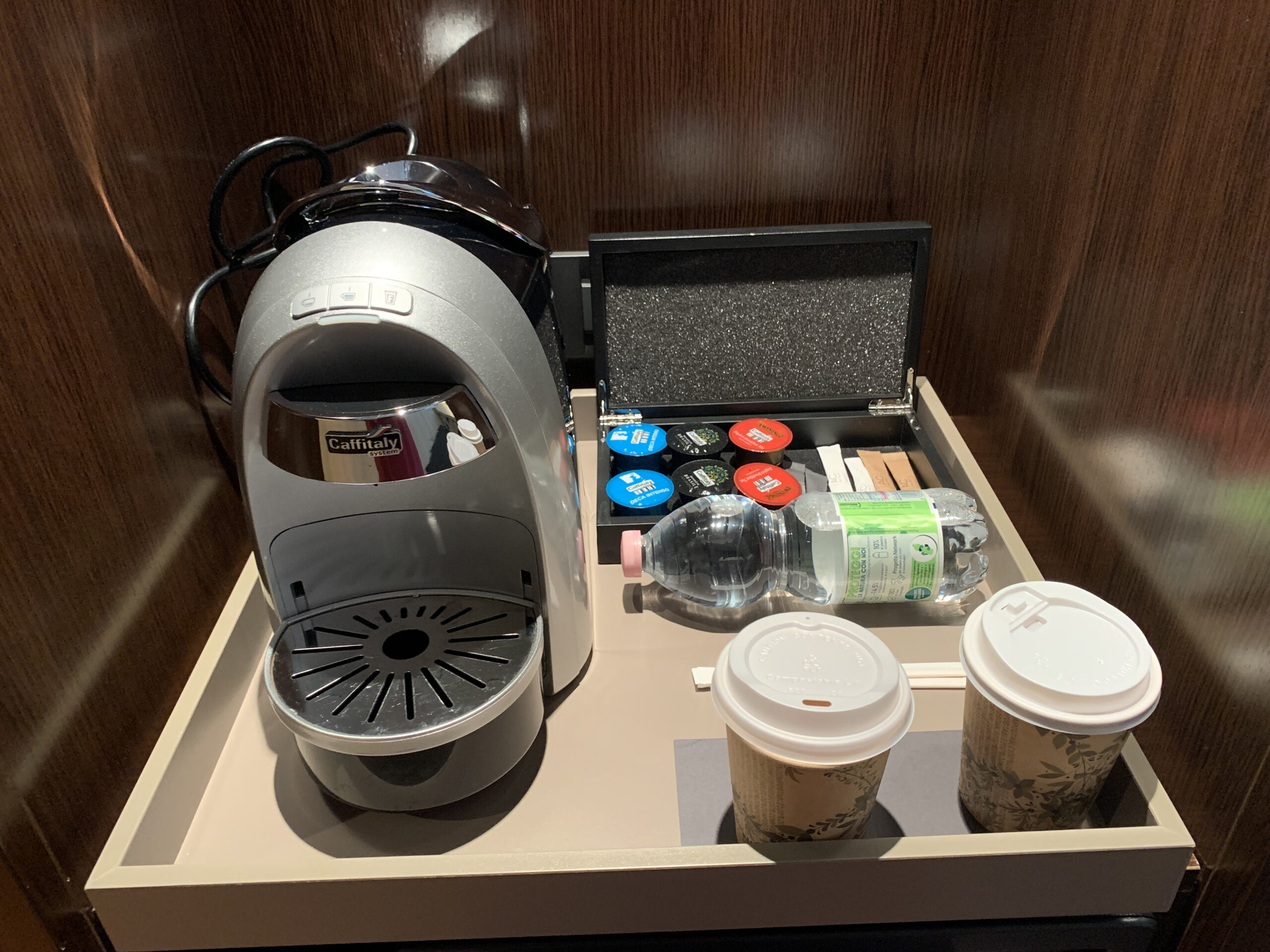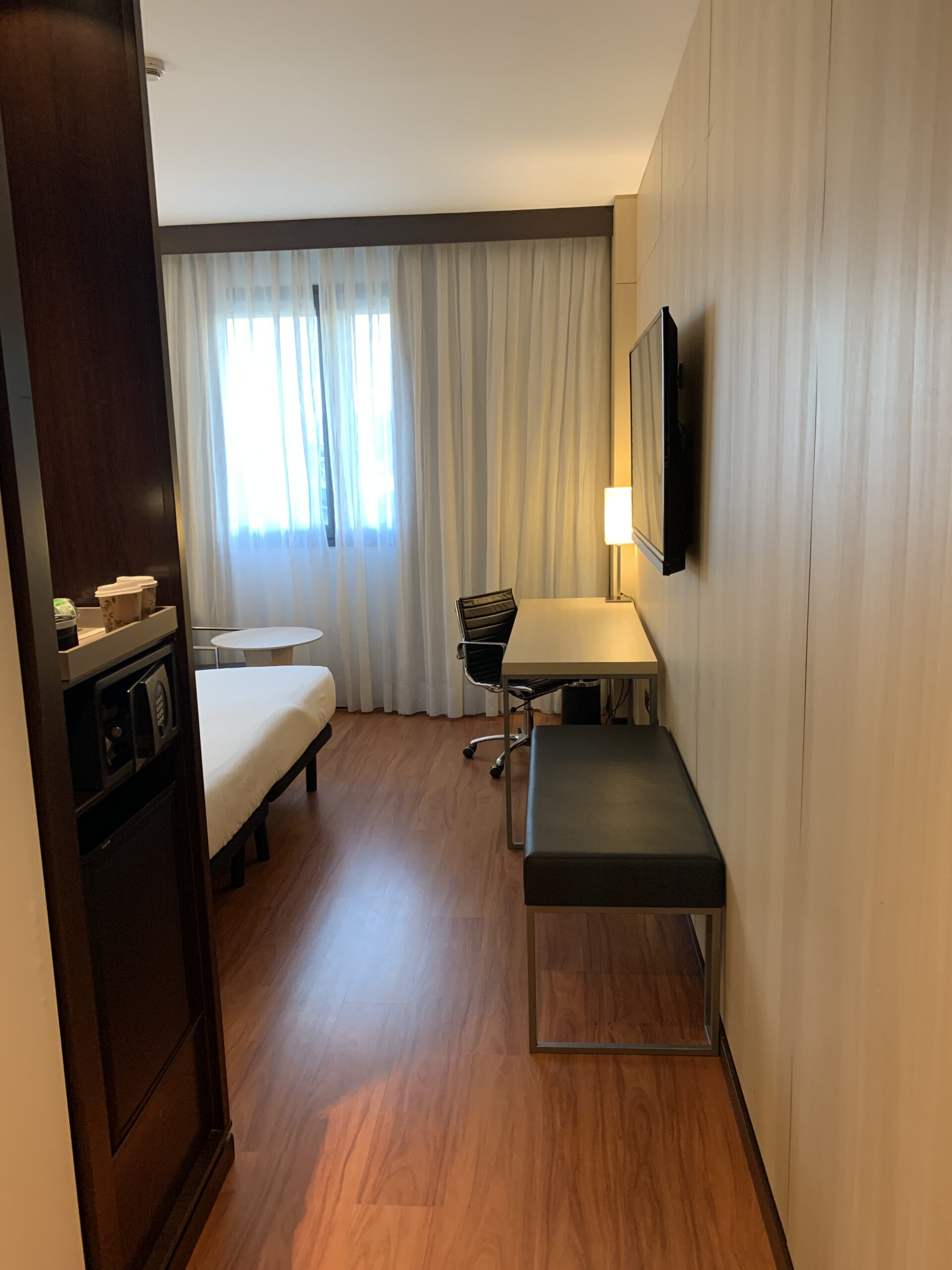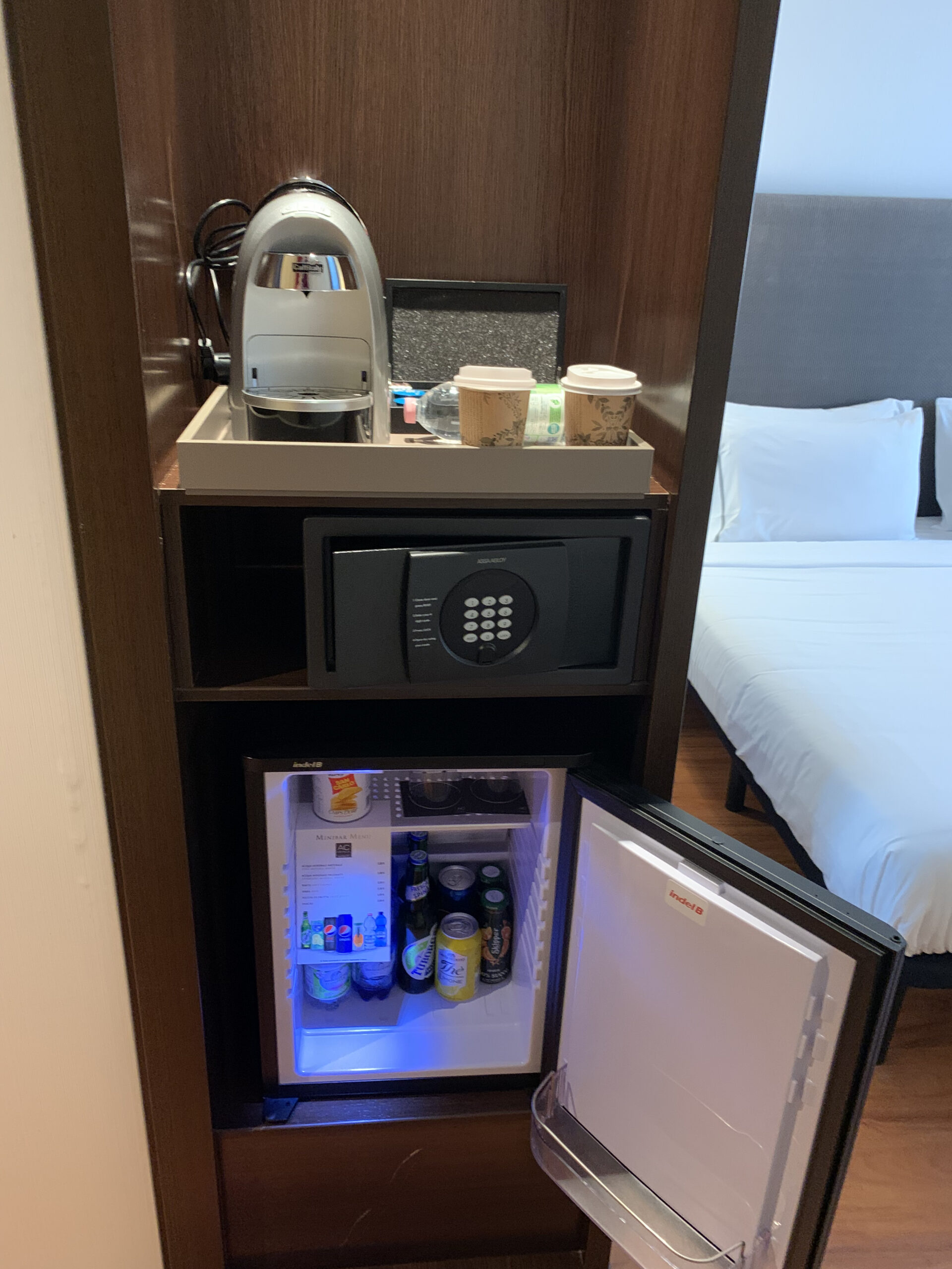 Der erste Eindruck vom Zimmer ist recht gut. Auf der linken Seite hat es das Badezimmer, im Gang dann noch einen Safe und die Kaffee/Teemaschine sowie eine Minibar.