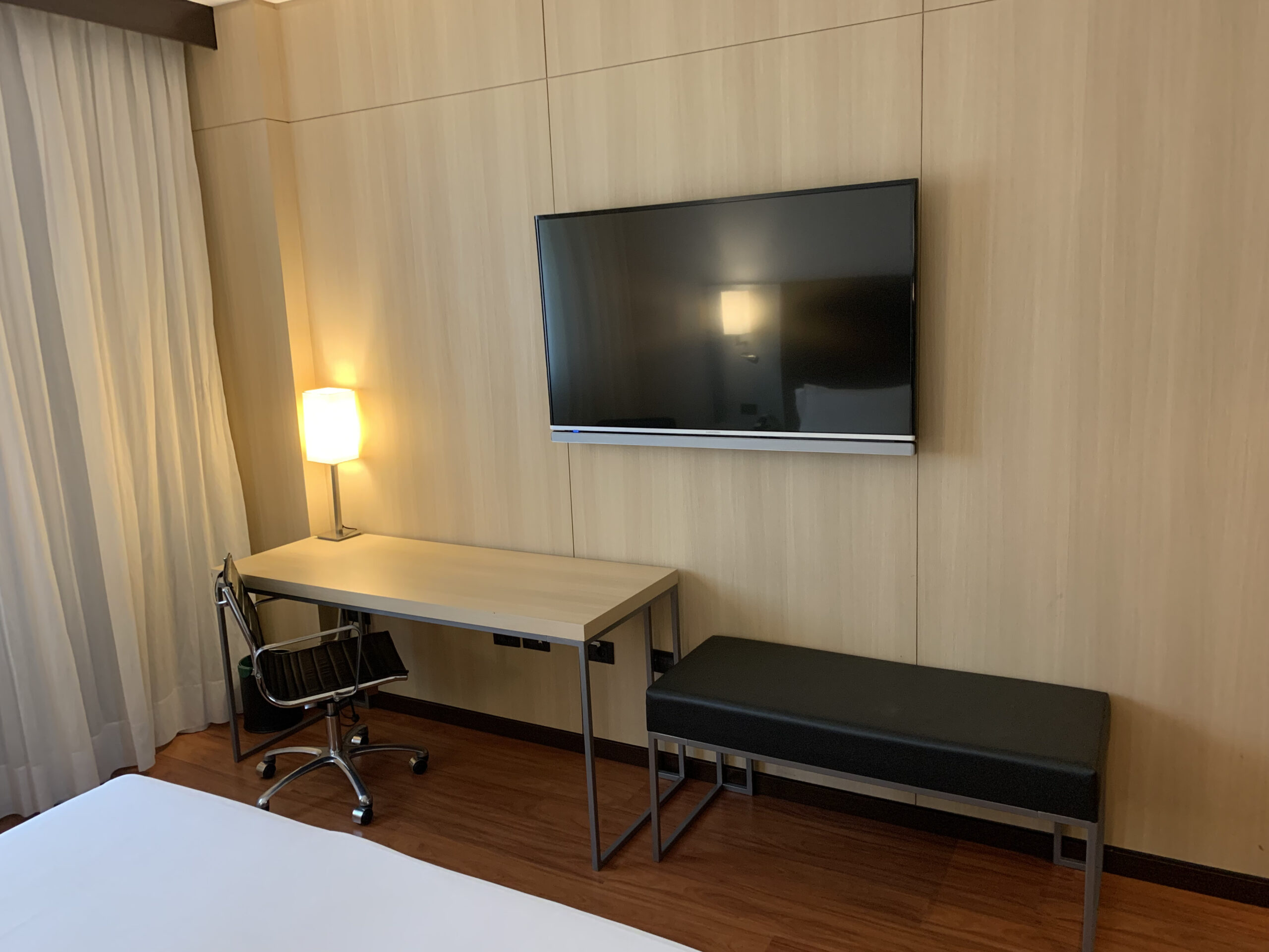 Der grösste Teil des Zimmers wird durch das Bett eingenommen, es hat einen Schreibtisch mit einem guten Stuhl sowie eine gute Ablagemöglichkeit für das Gepäck. Leider verstehe ich nicht warum alle Steckdosen am Schreibtisch unter dem Schreibtisch angebracht sind. Dies ist einfach nicht zeitgemäss, auch gibt es am Bett insgesamt lediglich eine Steckdose. Auf der anderen Seite hat es noch einen doch recht grossen Fernseher.