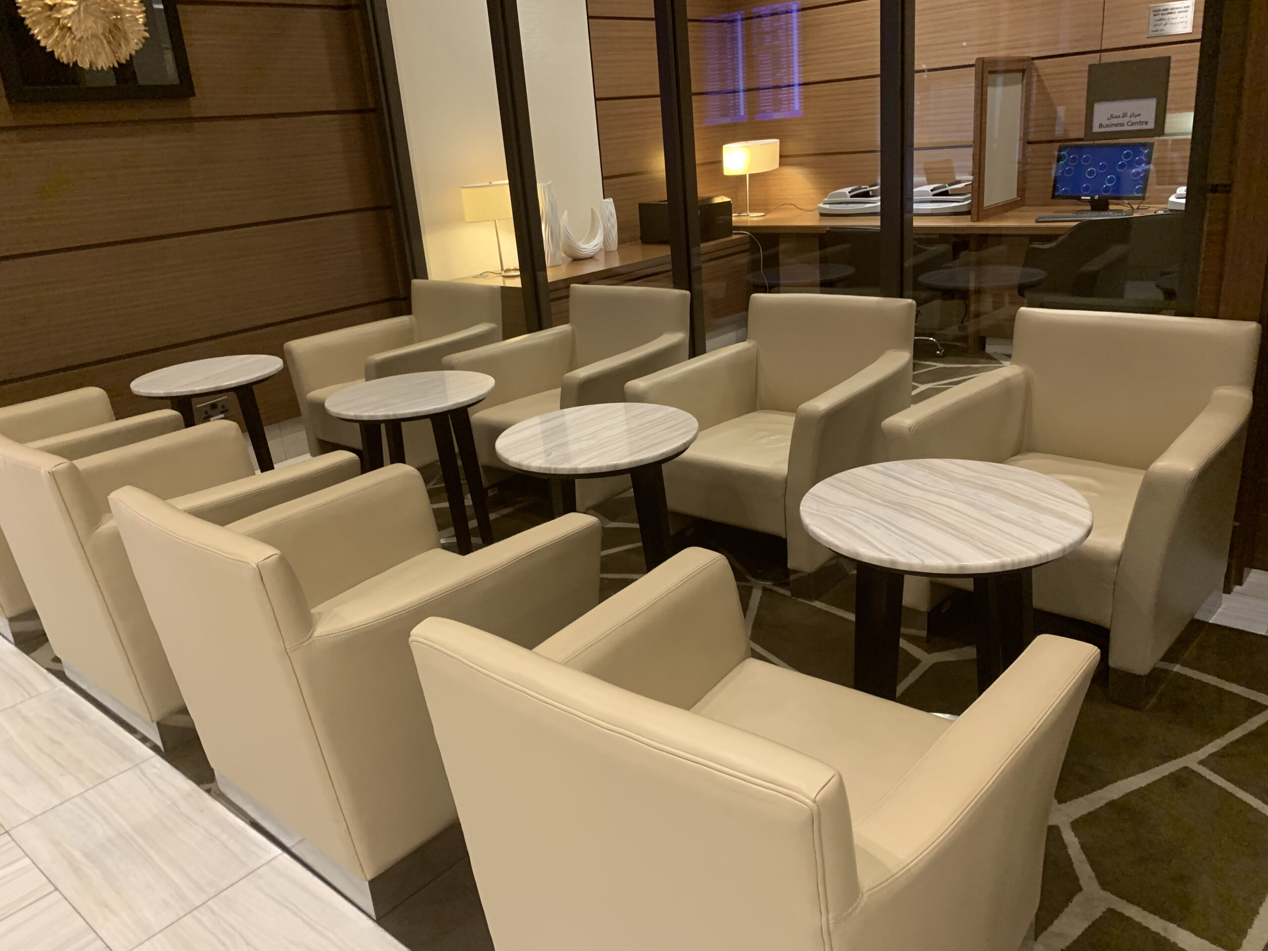 Die Lounge wirkt ein wenig steril. Es hat verschiedene Sitzmöglichkeiten, und war zu keinem Zeitpunkt überfüllt.