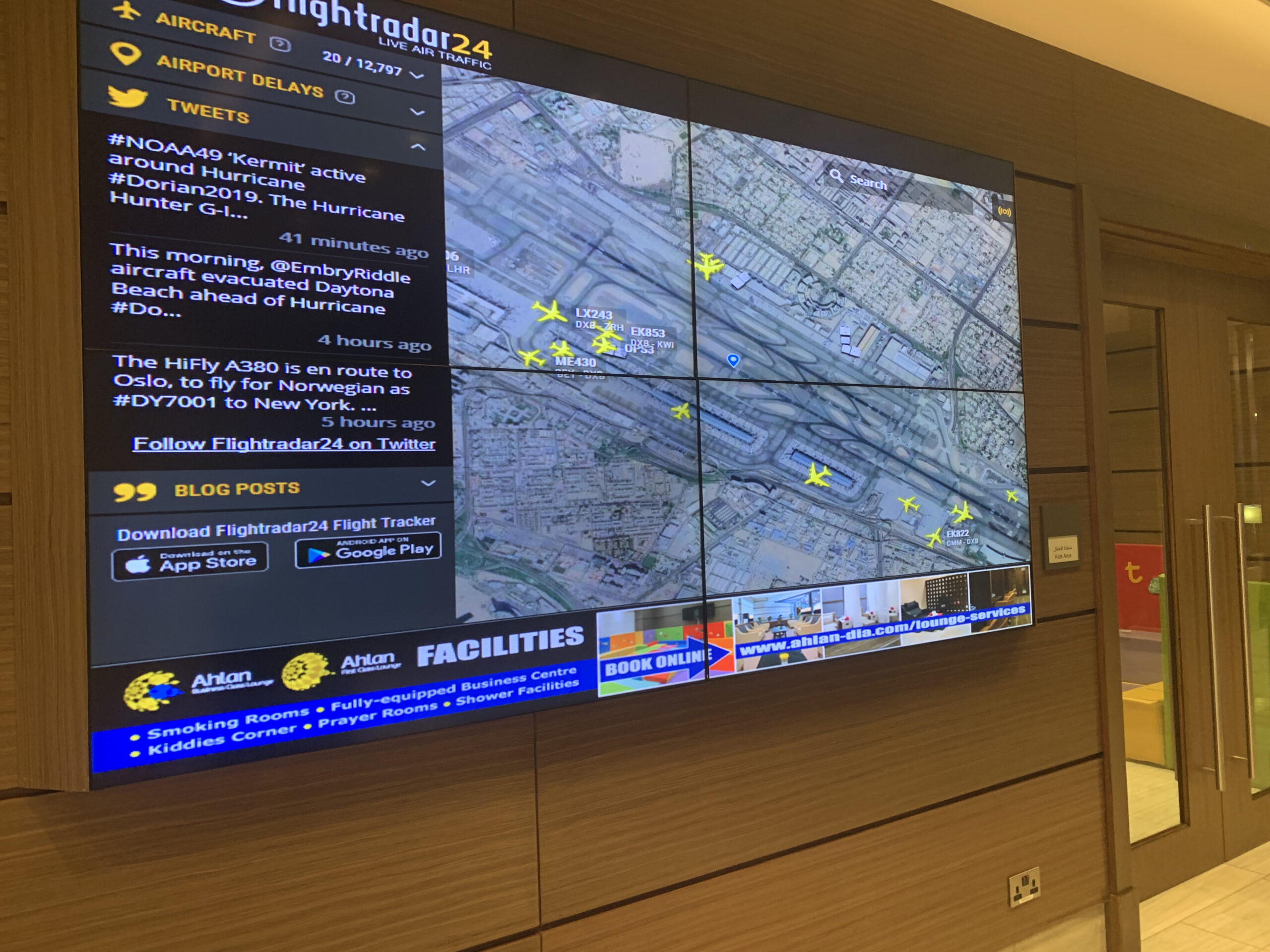 Ein kleines Highlight ist vielleicht noch die grosse Übersicht von Flightradar 24 welche auf einem übergrossen TV gezeigt wird. Hier kann man auch alle Starts/Landungen verfolgen.