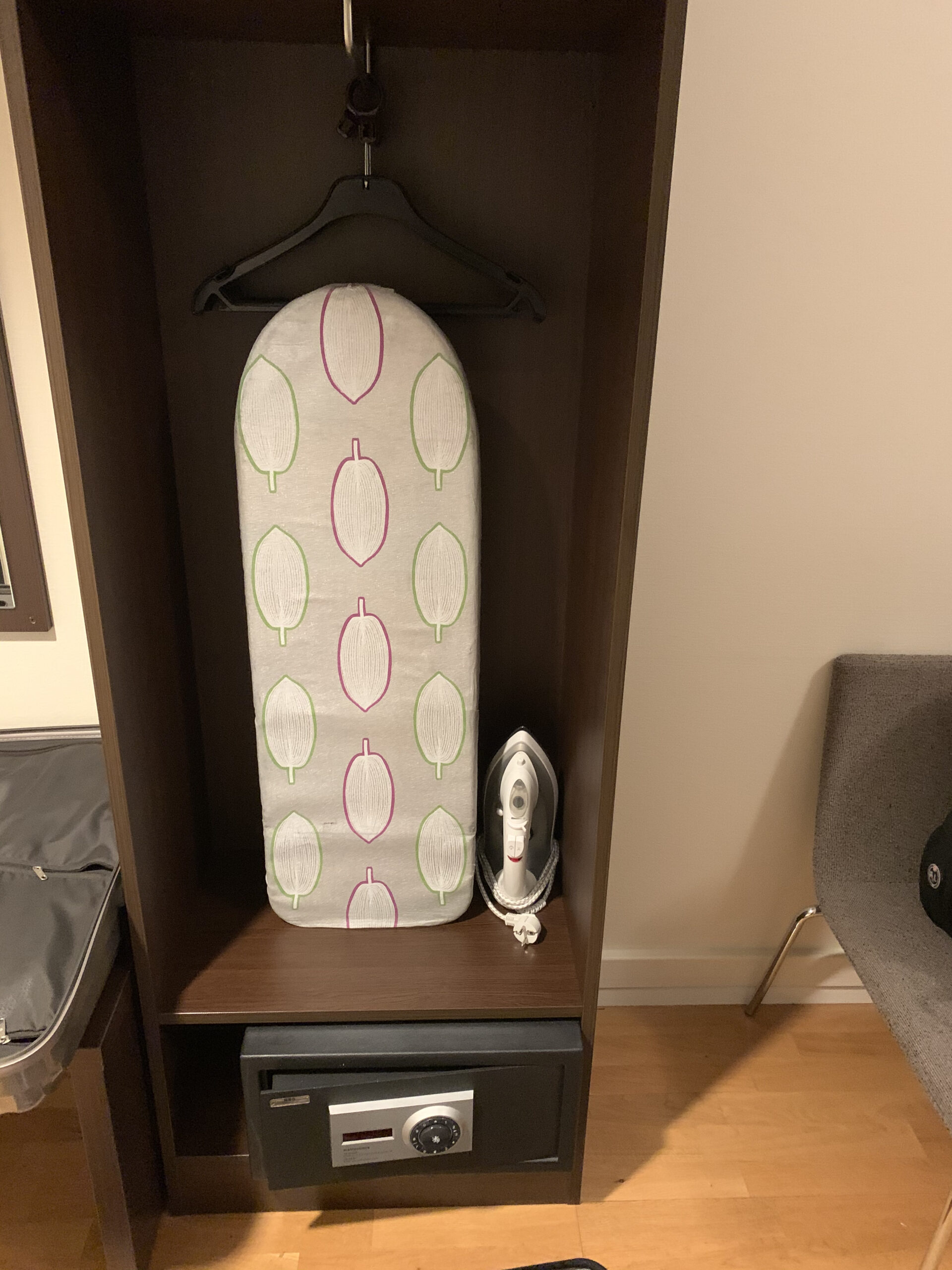 Im 8. Stock befand sich dann mein Zimmer. Nicht wirklich gross aber zumindest funktionell ausgestattet. Beim Betreten des Zimmers hat es rechts einen kleinen Schrank, Kofferablage, Bügelbrett und Safe.