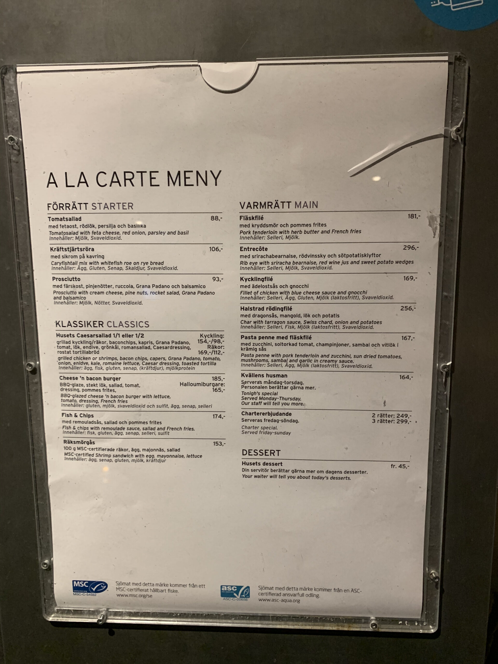 An der Bar konnte ich Abend noch ein Getränk einnehmen (dafür habe ich den Gutschein in Höhe von SEK 125 verwendet). Das Essen am Abend sah nicht schlecht aus, ich habe hier noch die Speisekarte mit den Preisen.