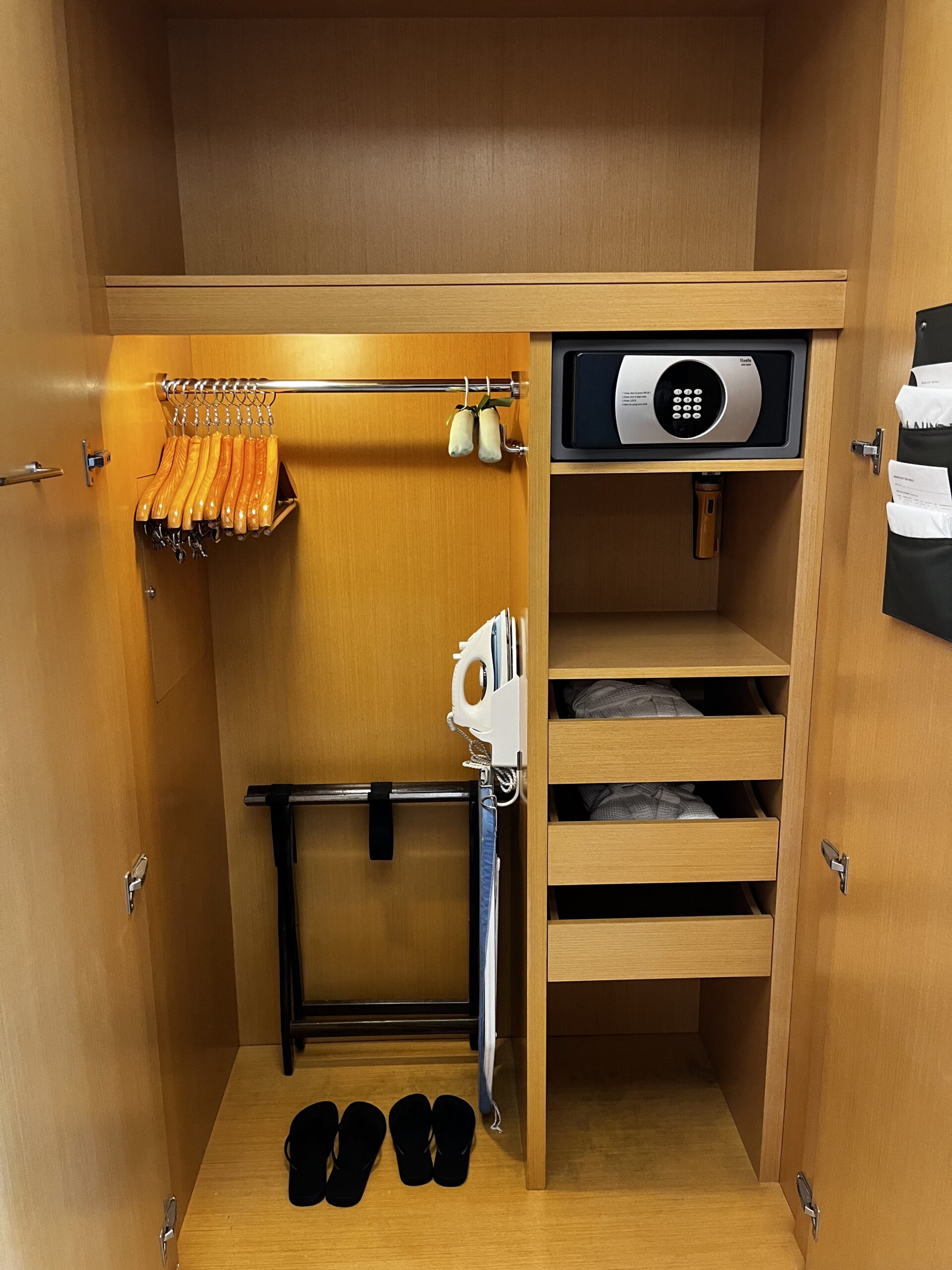 Auf dem Weg zum Badezimmer hat es noch einen ausreichend grossen Kleiderschrank mit Bügelbrett, Schlappen wie auch einem Safe.