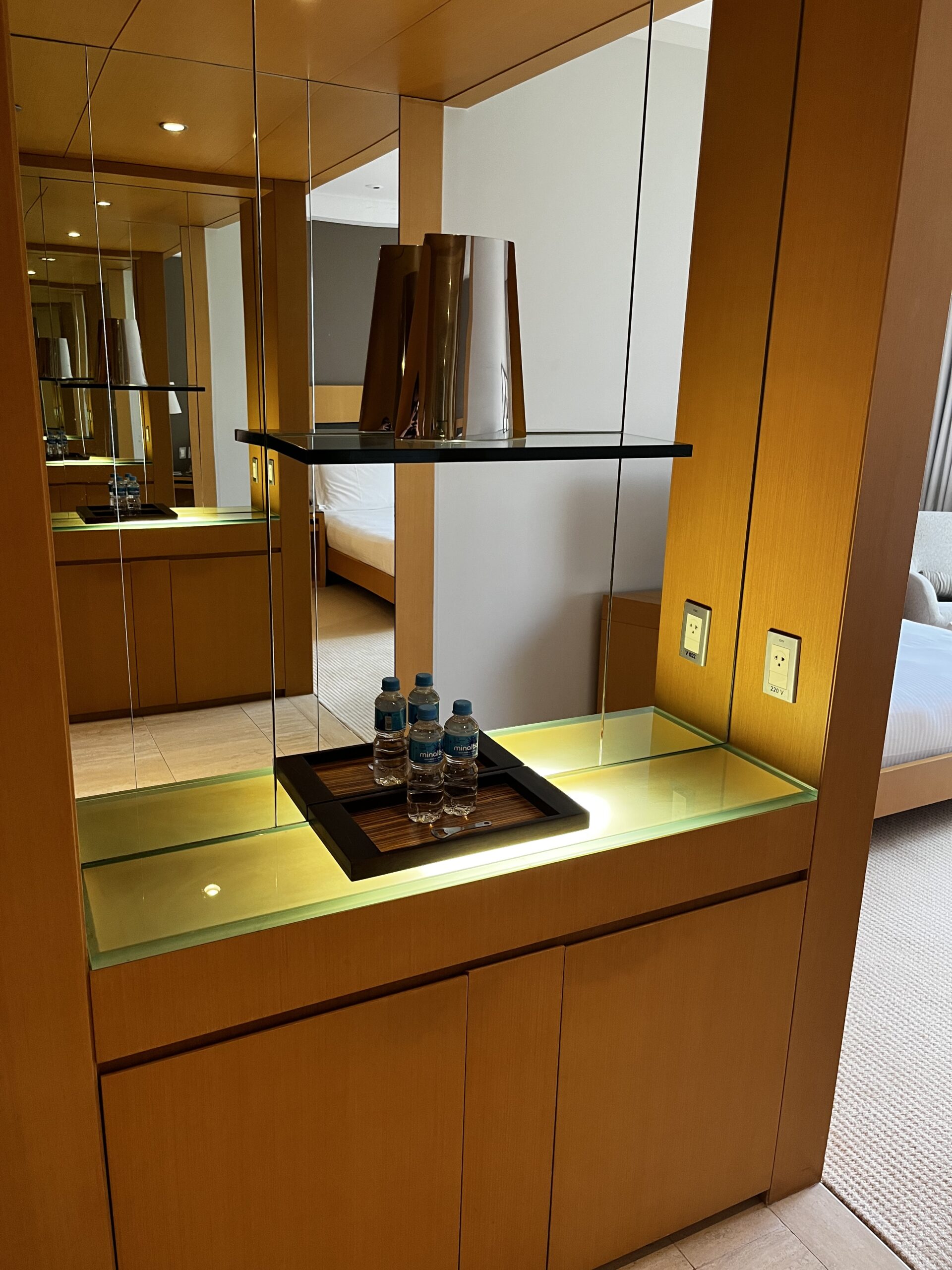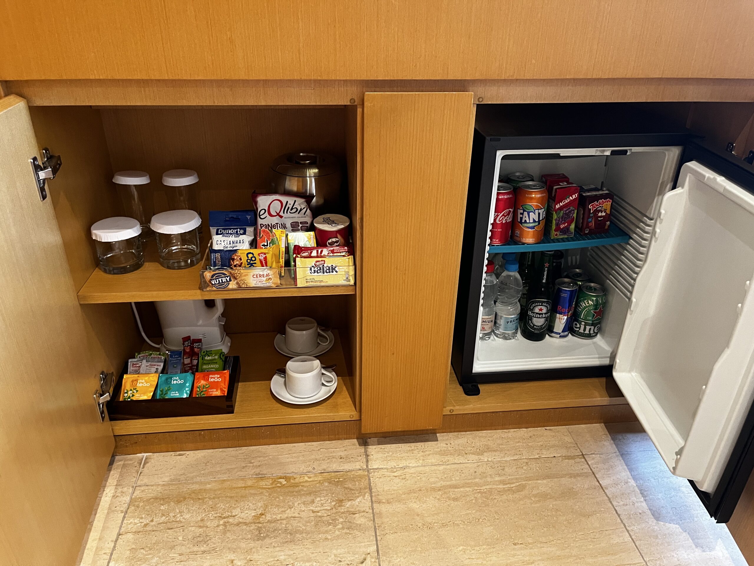 Auf der linken Seite befand eine (gefüllte) Minibar inklusive Kaffeemaschine, sowie die Möglichkeit seinen Koffer abzustellen.
