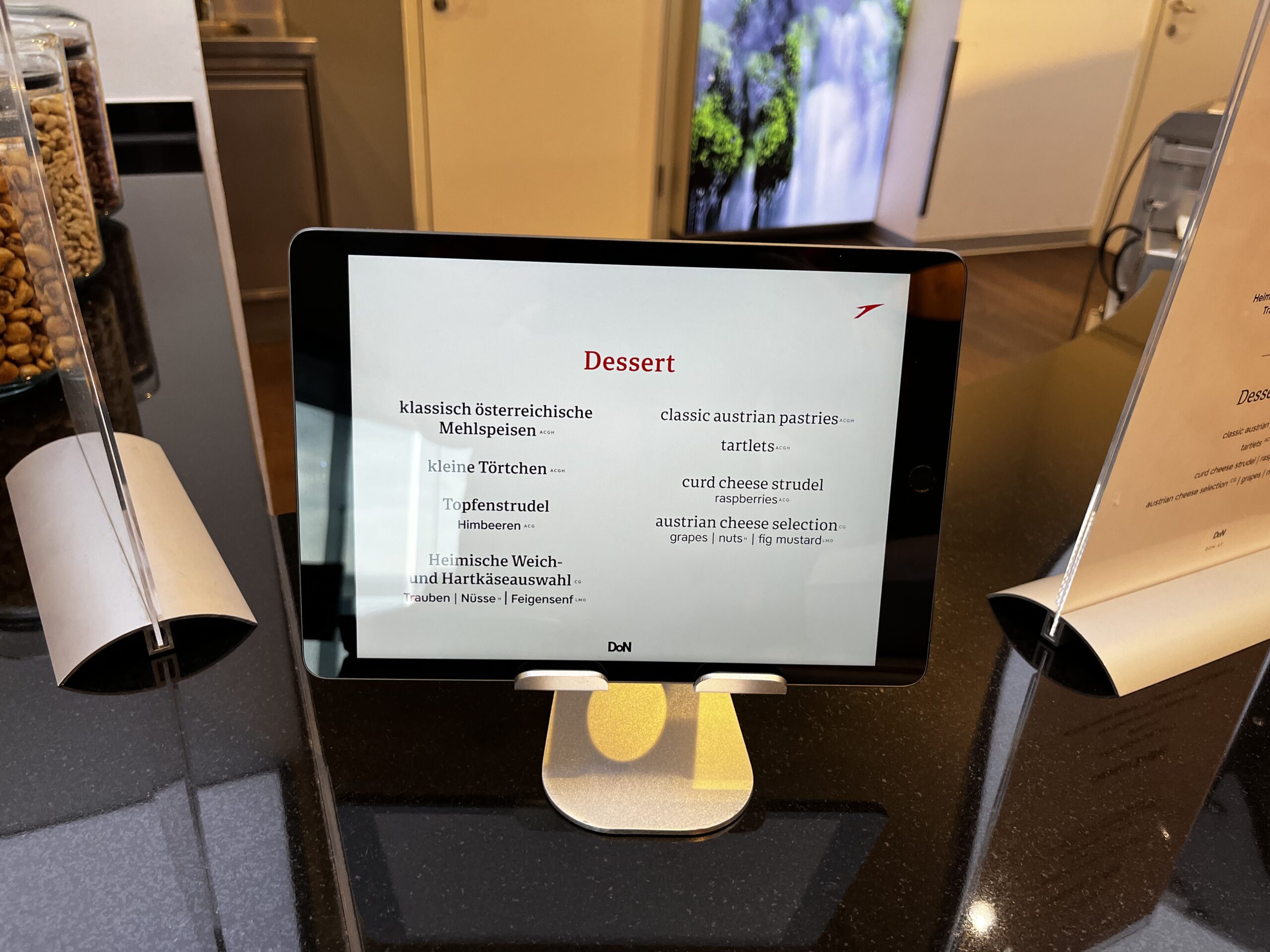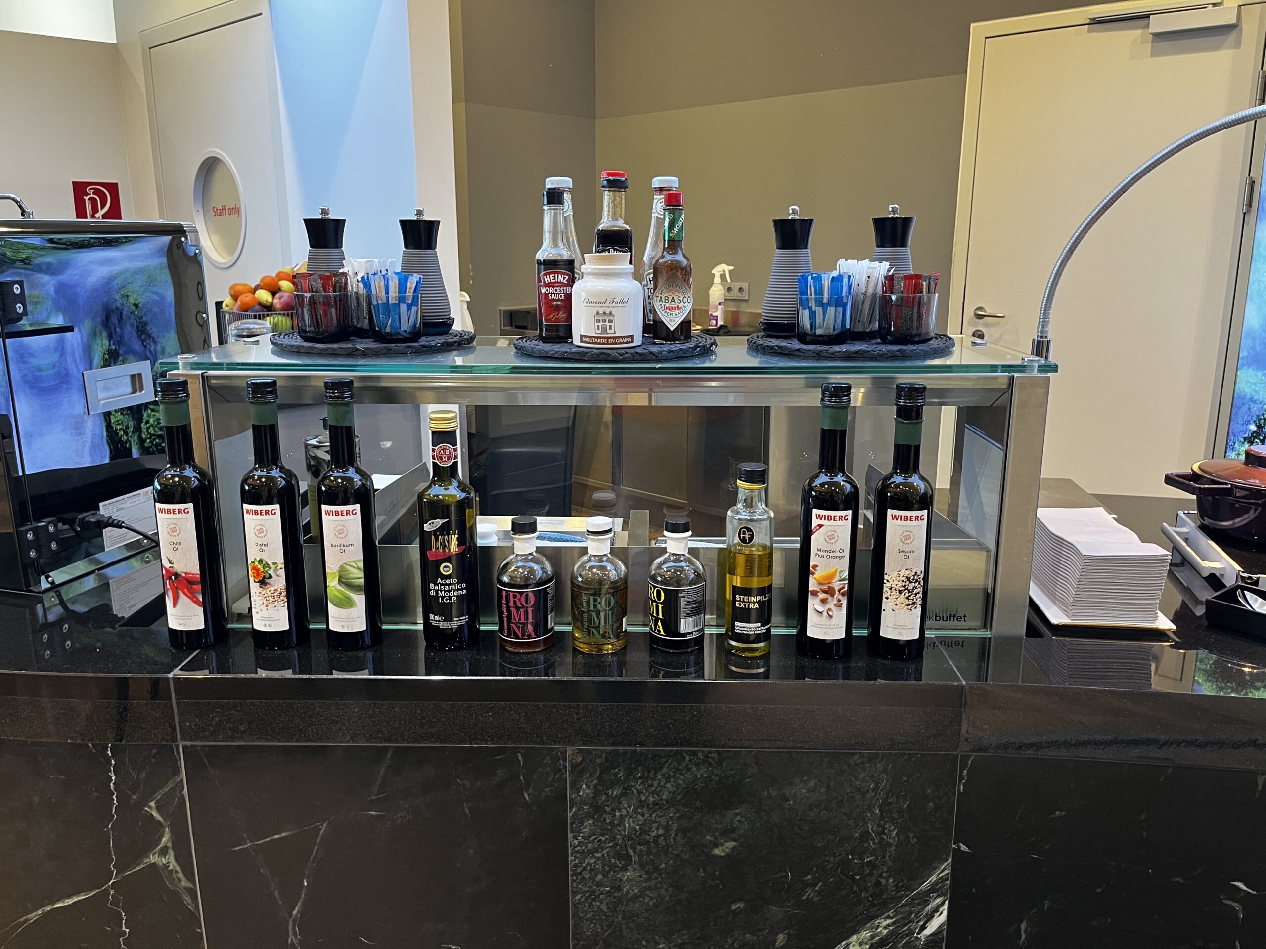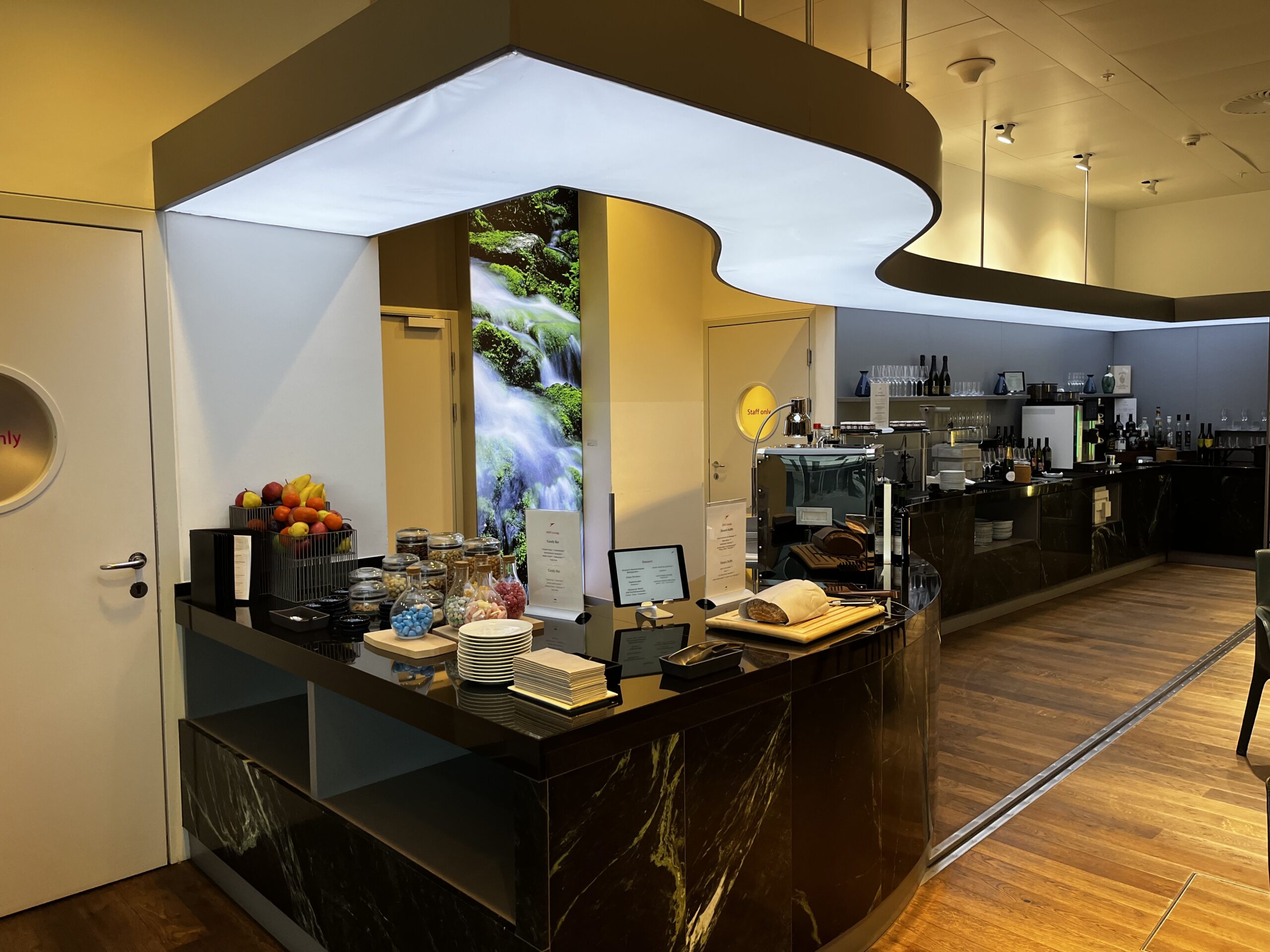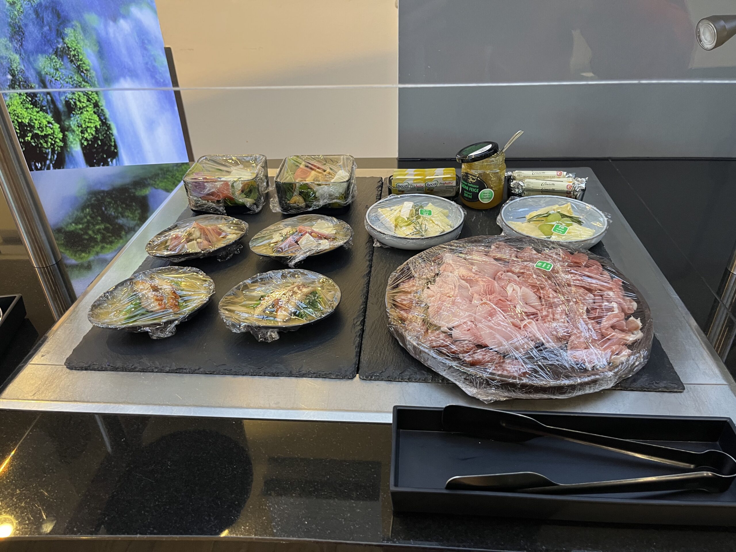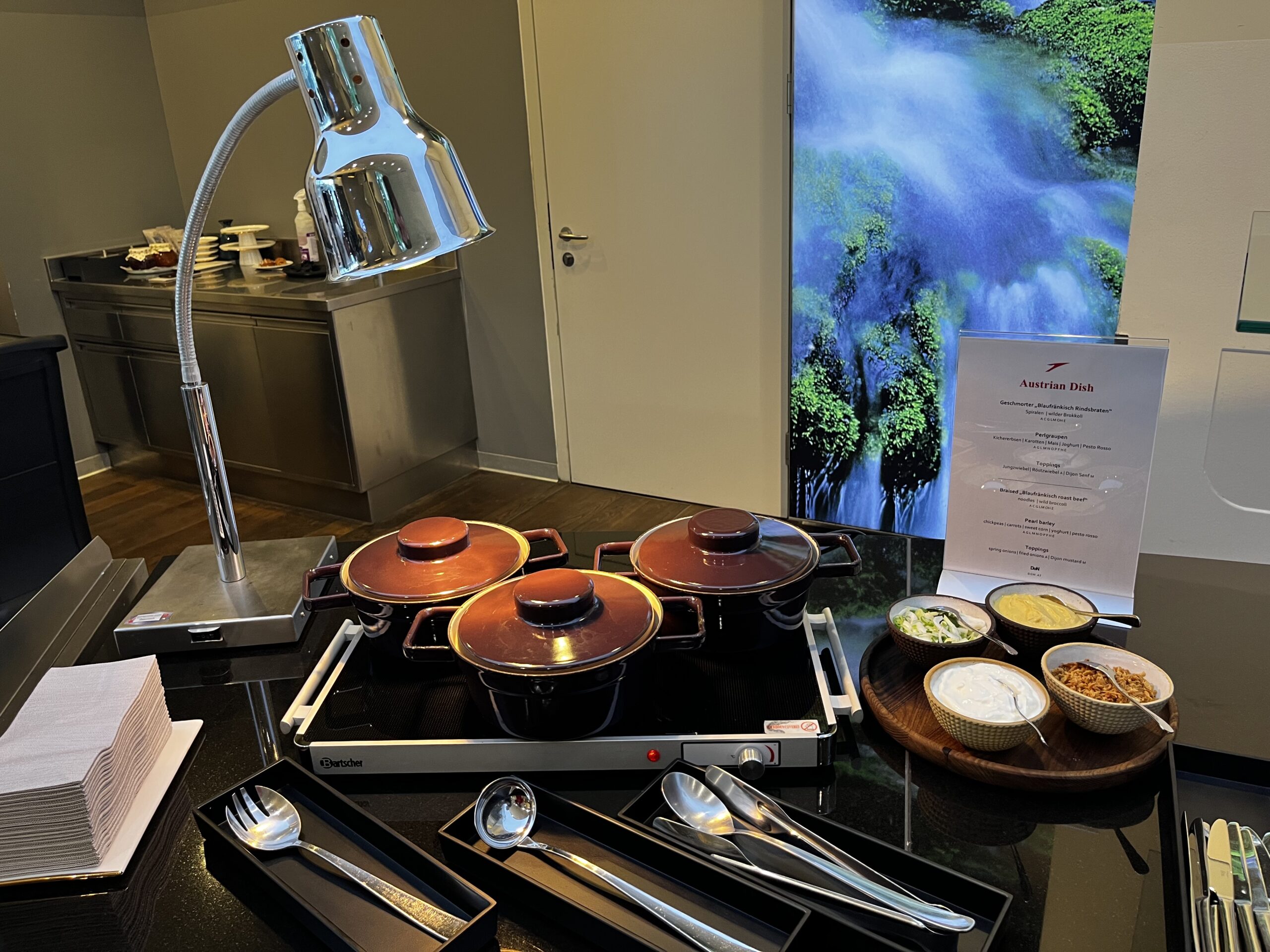 Hier gibt es ein kleines Buffett, man kann aber auch aus der ausliegenden Speisekarte wählen. Von der Qualität her gab es nichts auszusetzen. Es sind auch genügend Getränke (alkoholisch und nicht alkoholisch) vorhanden. Da es kaum Besucher in der Lounge gibt, ist das warme Essen nach einiger Zeit dann auch nicht mehr so frisch. Allerdings ist dies meiner Meinung nach mehr als verständlich.