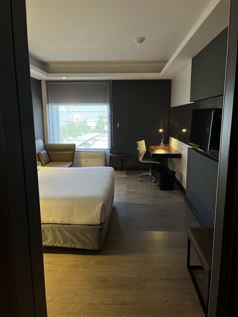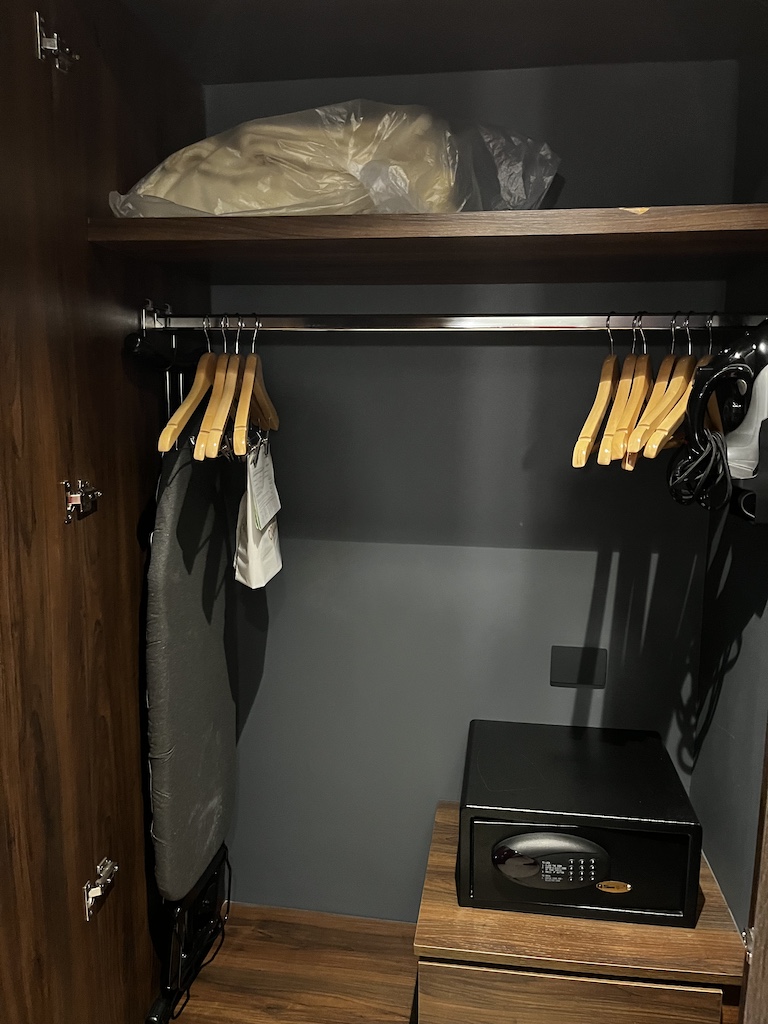 Es ist sehr schlicht gehalten, aber für meine Zwecke geeignet. Wenn ihr ins Zimmer kommt, dann ist auf der linken Seite das Badezimmer und vis a vis noch ein Schrank mit Safe und Bügelbrett.