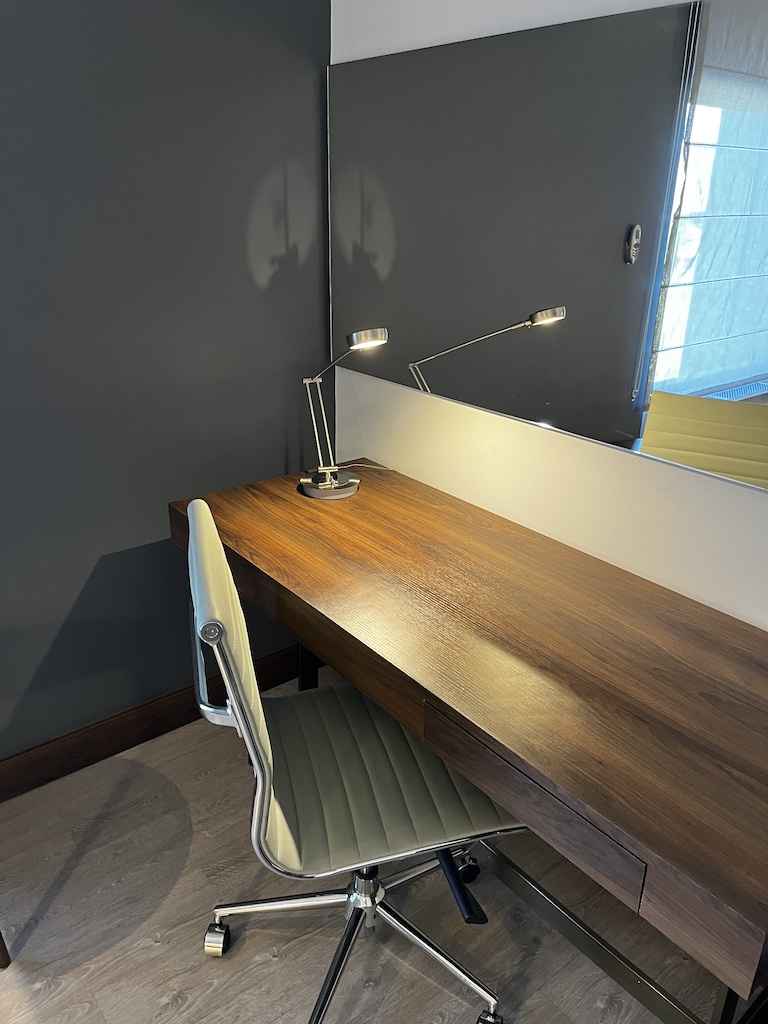 Auf der anderen Seite befindet sich der grosse Fernseher und ein Arbeitsplatz an dem man wirklich arbeiten kann.