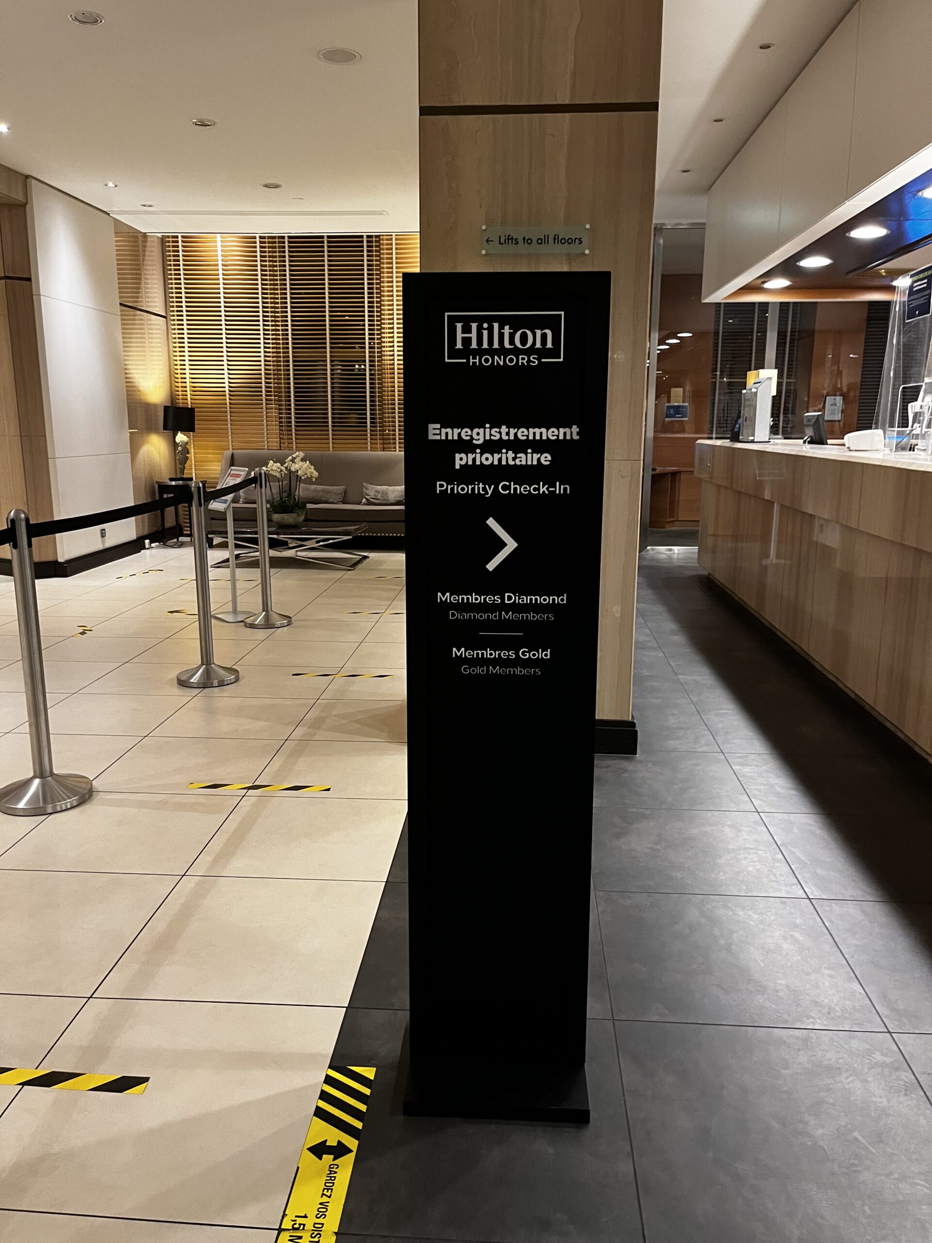 Gutes Hilton-Upgrade, netter Keks beim Check-in — für eine Nacht vor dem Flug völlig ausreichend.