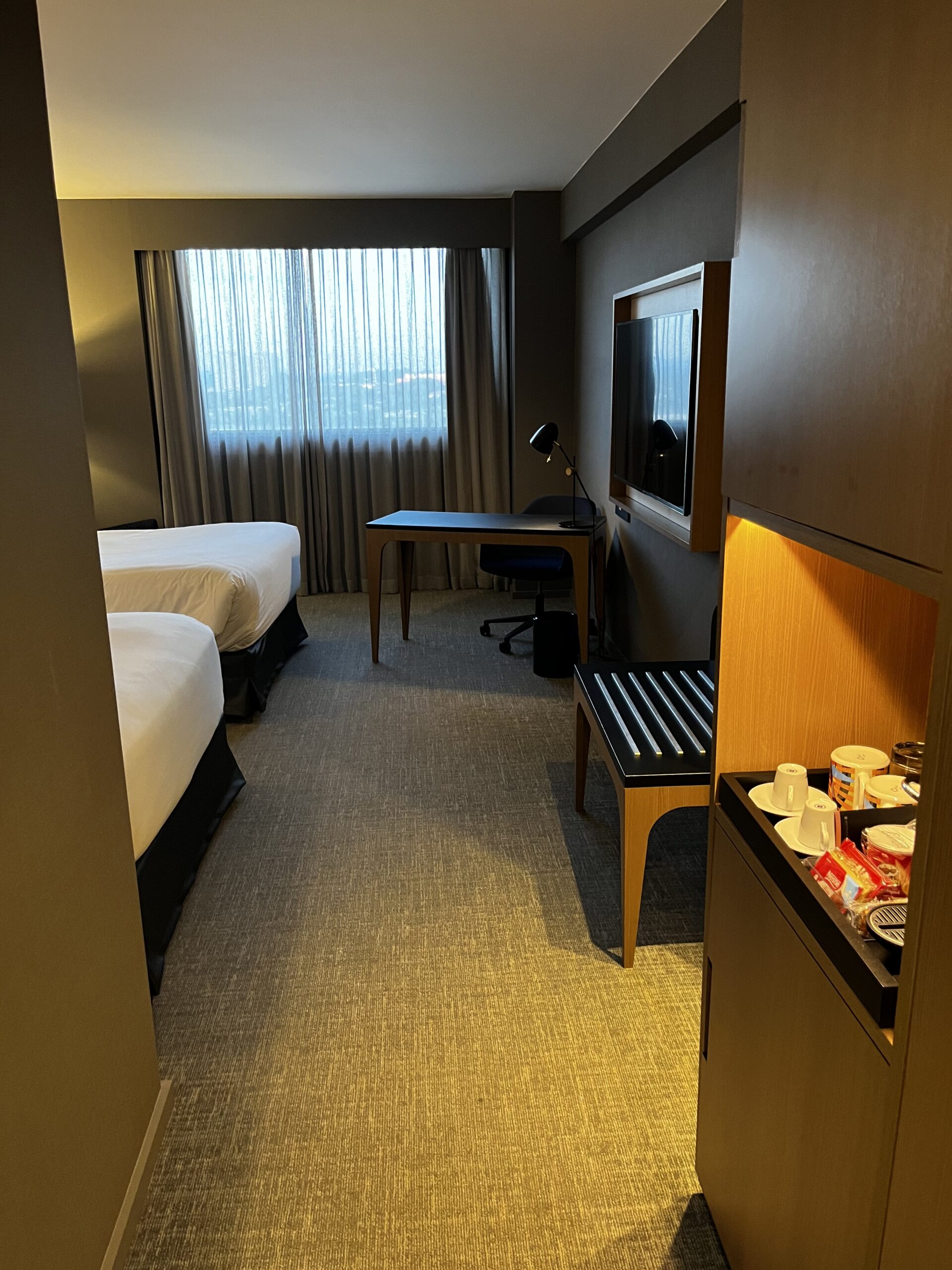 Wenn man das Zimmer betriff ist auf der linken Seite direkt das Badezimmer (Bilder unten) und dann wir das Zimmer vor allem durch die Betten und den Schreibtisch eingenommen. Auch eine Kofferablage ist vorhanden, wie auch die Möglichkeit sich Kaffee/Tee zuzubereiten.