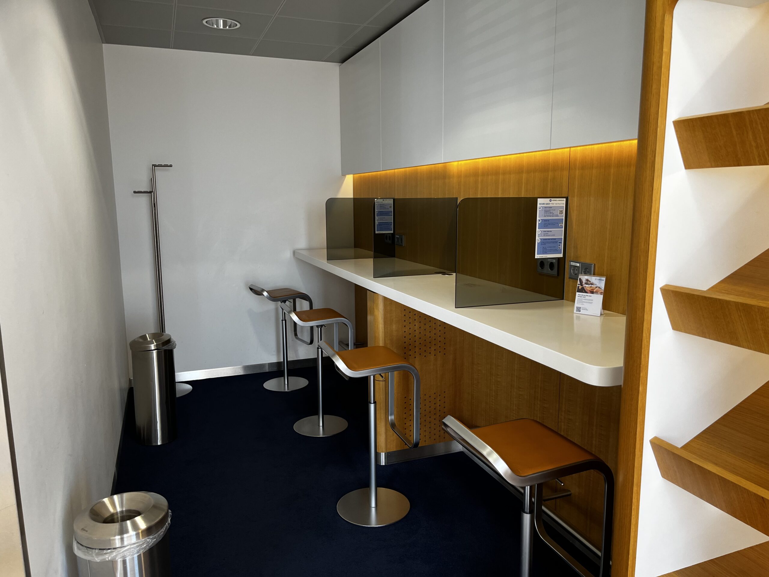 Die Sitzmöglichkeiten sind im typischen Lufthansa Design gehalten. Bis auf die Plätze am Fenster hat es auch überall ausreichend Steckdosen.