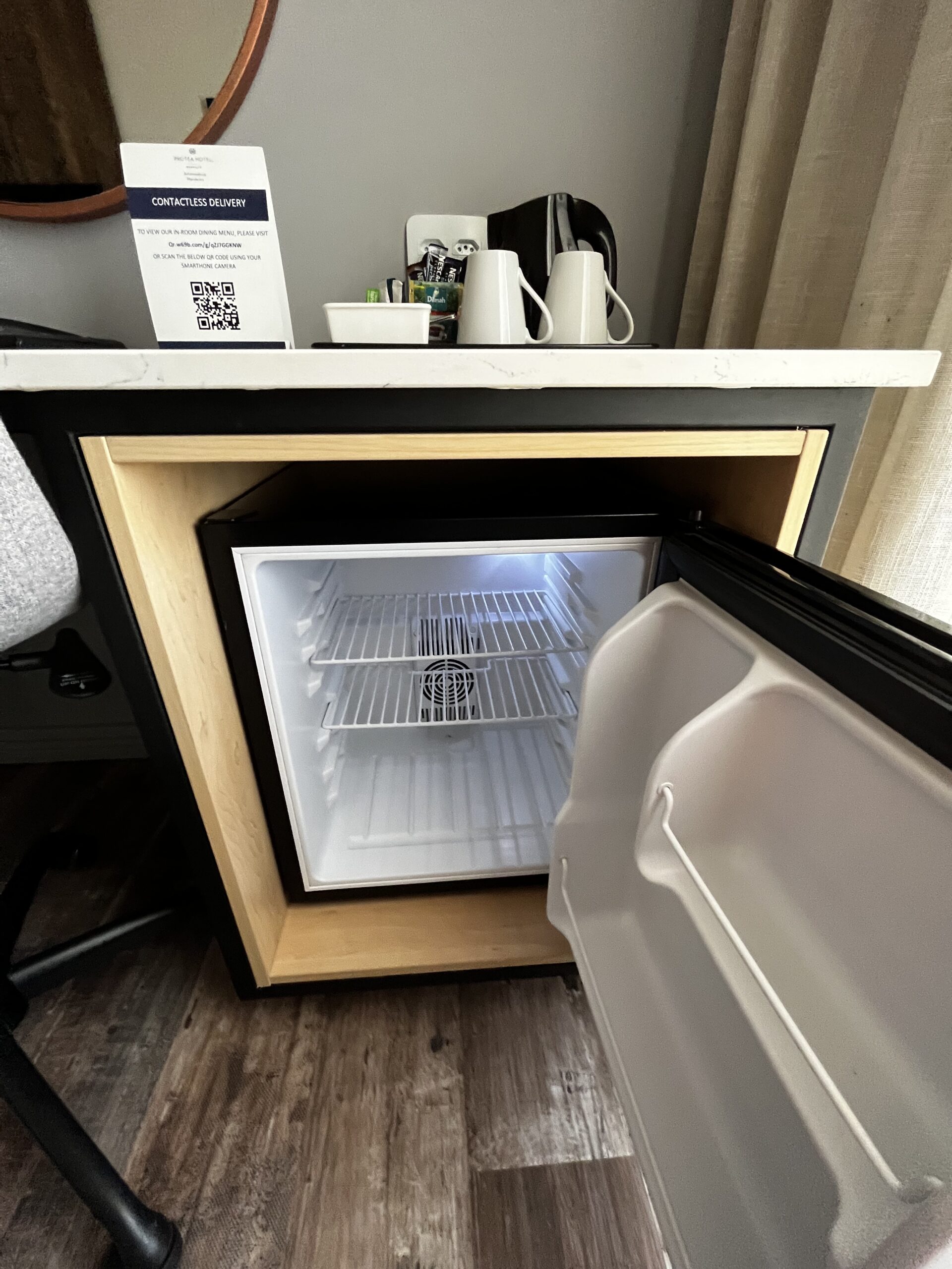 Den grössten Teil des Zimmers nahm das bequeme Bett ein. Daneben hatte es noch eine kleine Sitzecke und einen (leeren) Kühlschrank.