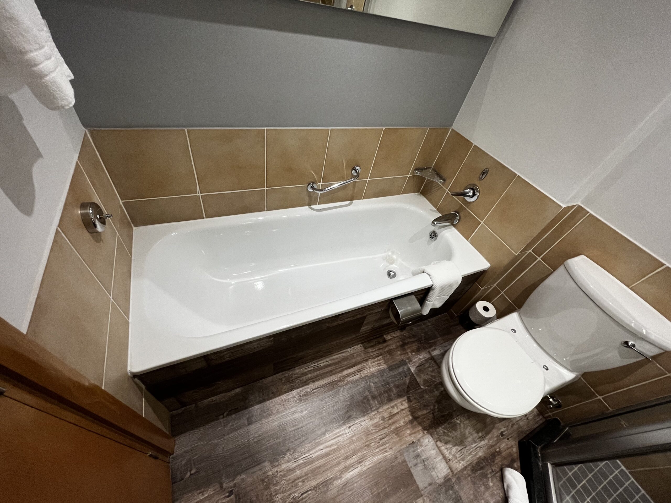 Auf der linken Seite vom Zimmer hat es das Badezimmer mit einer Dusche und Badewanne, auch war ausreichend Shampoos etc vorhanden. Für mich reichte für mich auf jeden Fall.