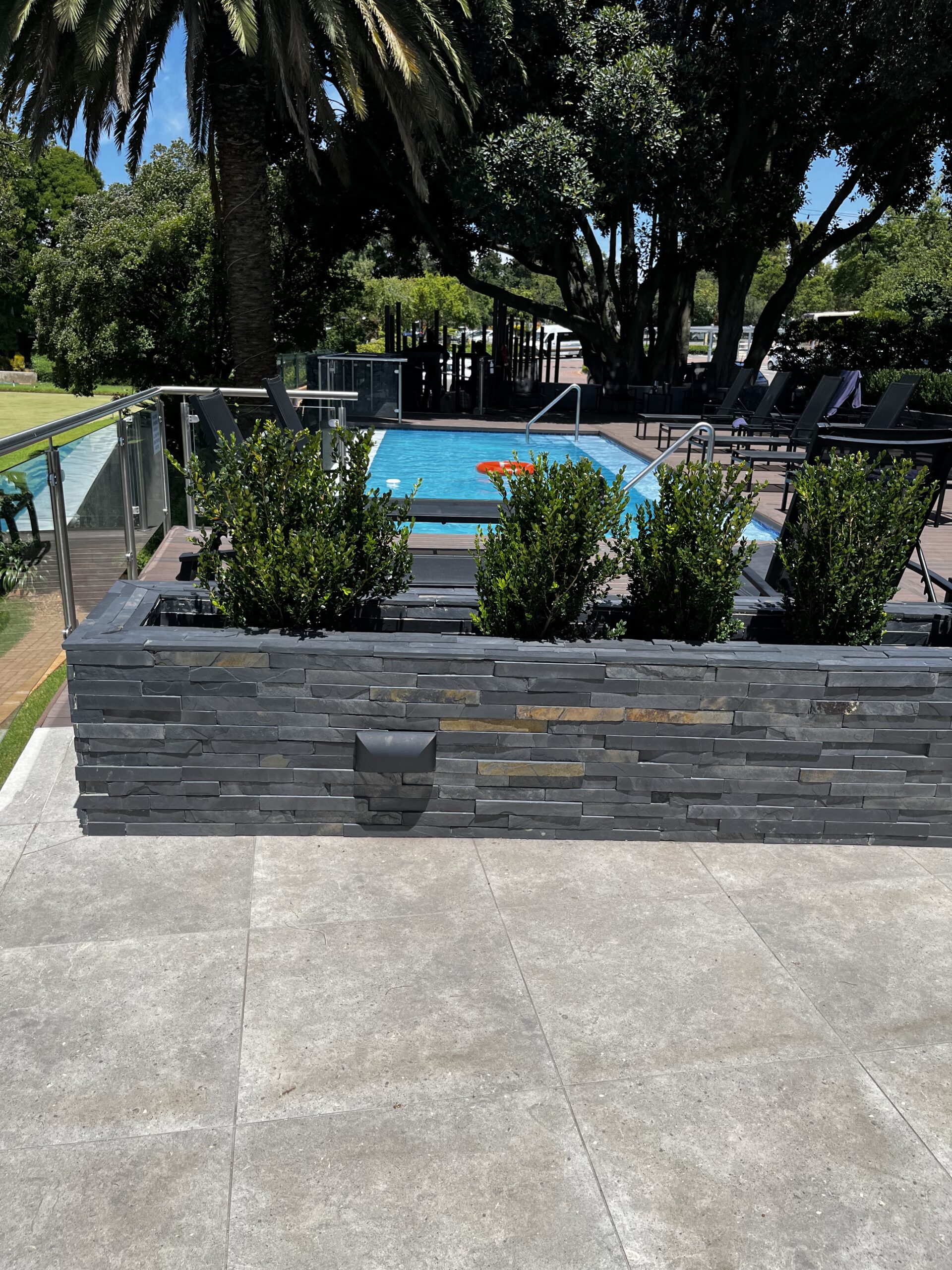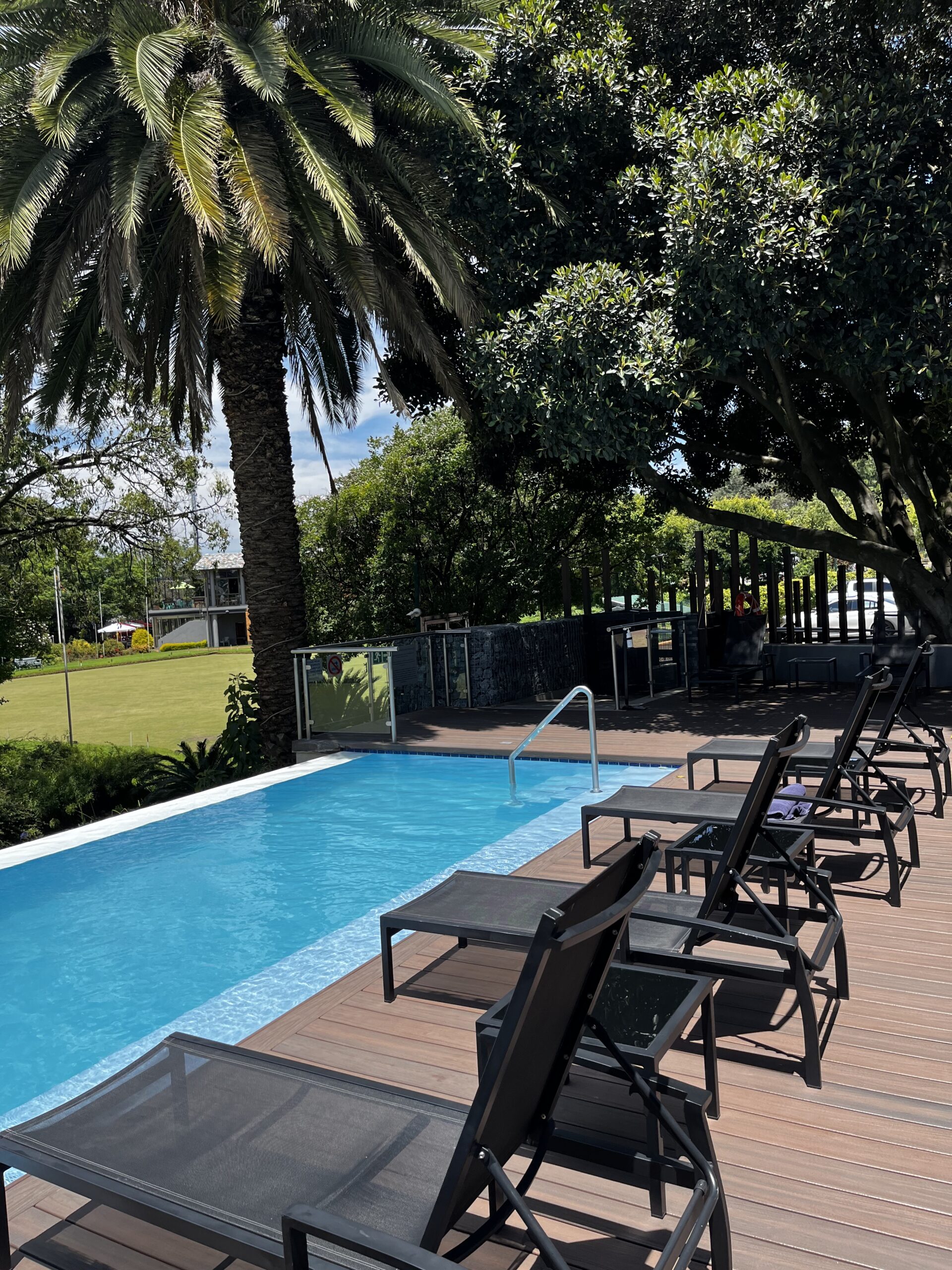 Wenn man draussen auf der Terrasse essen möchte, hat man einen Überblick über die Hotelanlage, dazu gehört auch ein Pool.