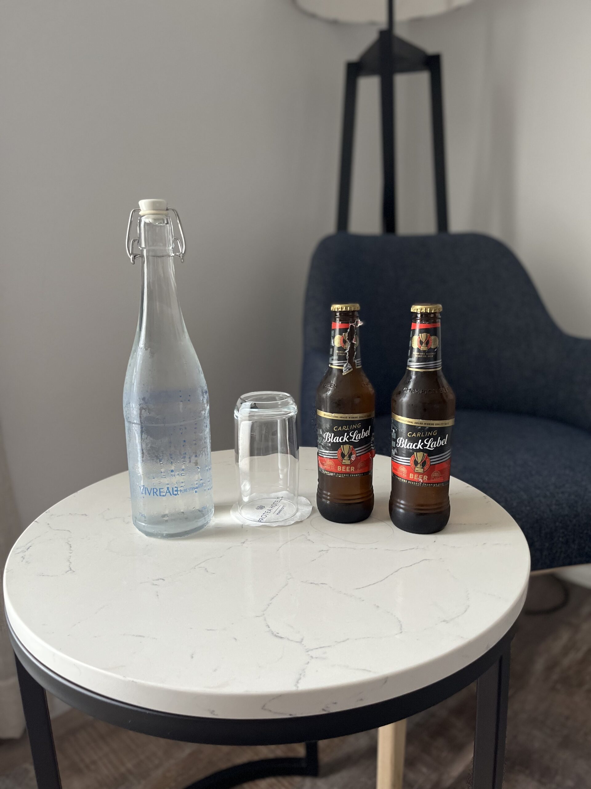 Insgesamt wirkte das Zimmer recht hell und modern. Das Internet funktionierte ebenfalls einwandfrei. Nach einer kurzen Zeit gab es noch zwei Bier auf das Zimmer als Willkommensgeschenk. Eine sehr nette Geste. Eine Möglichkeit sich Tee/Kaffee zuzubereiten hat es ebenfalls, genauso wie eine Flasche mit Wasser die jeden Tag ausgetauscht wird.