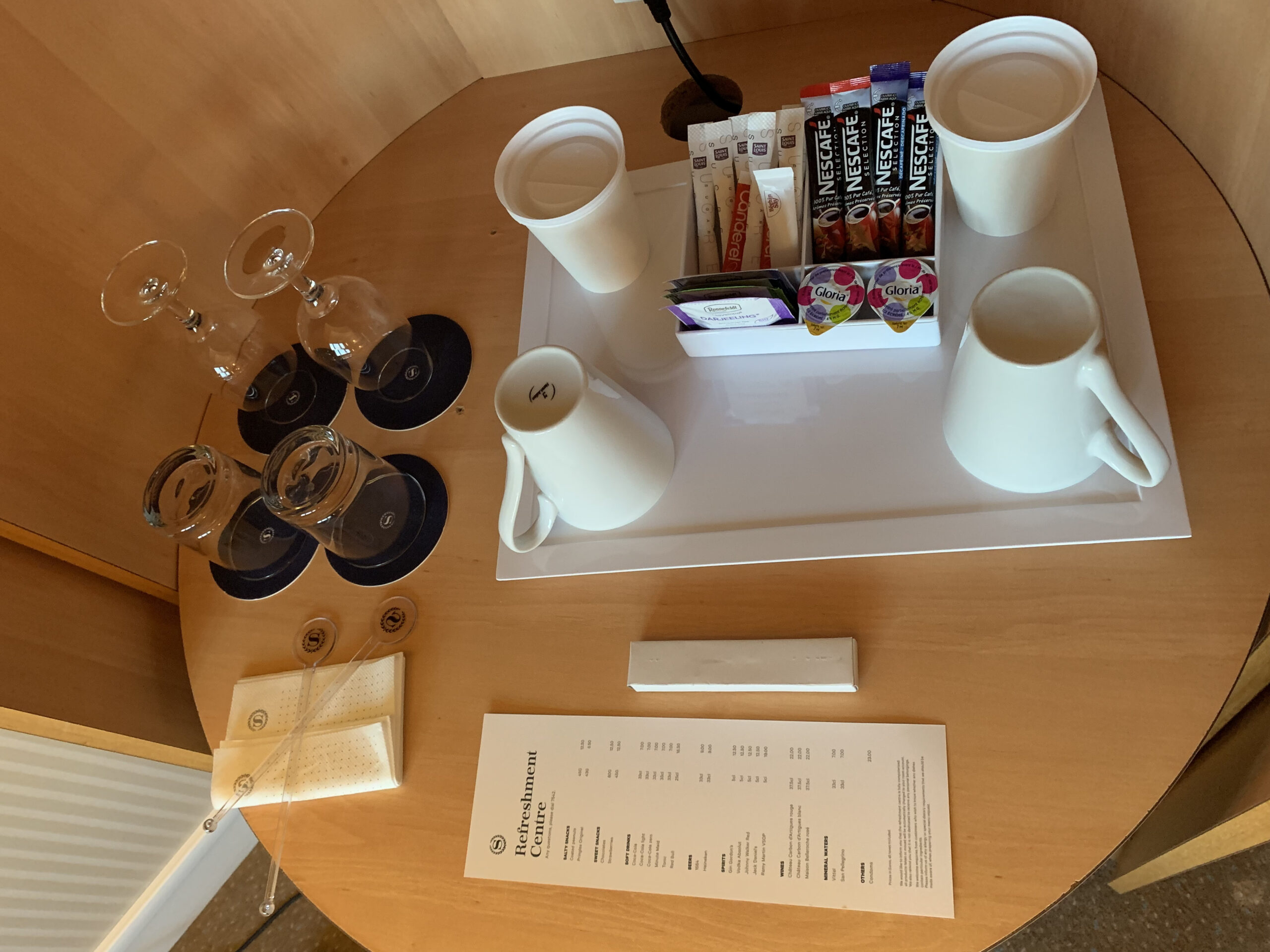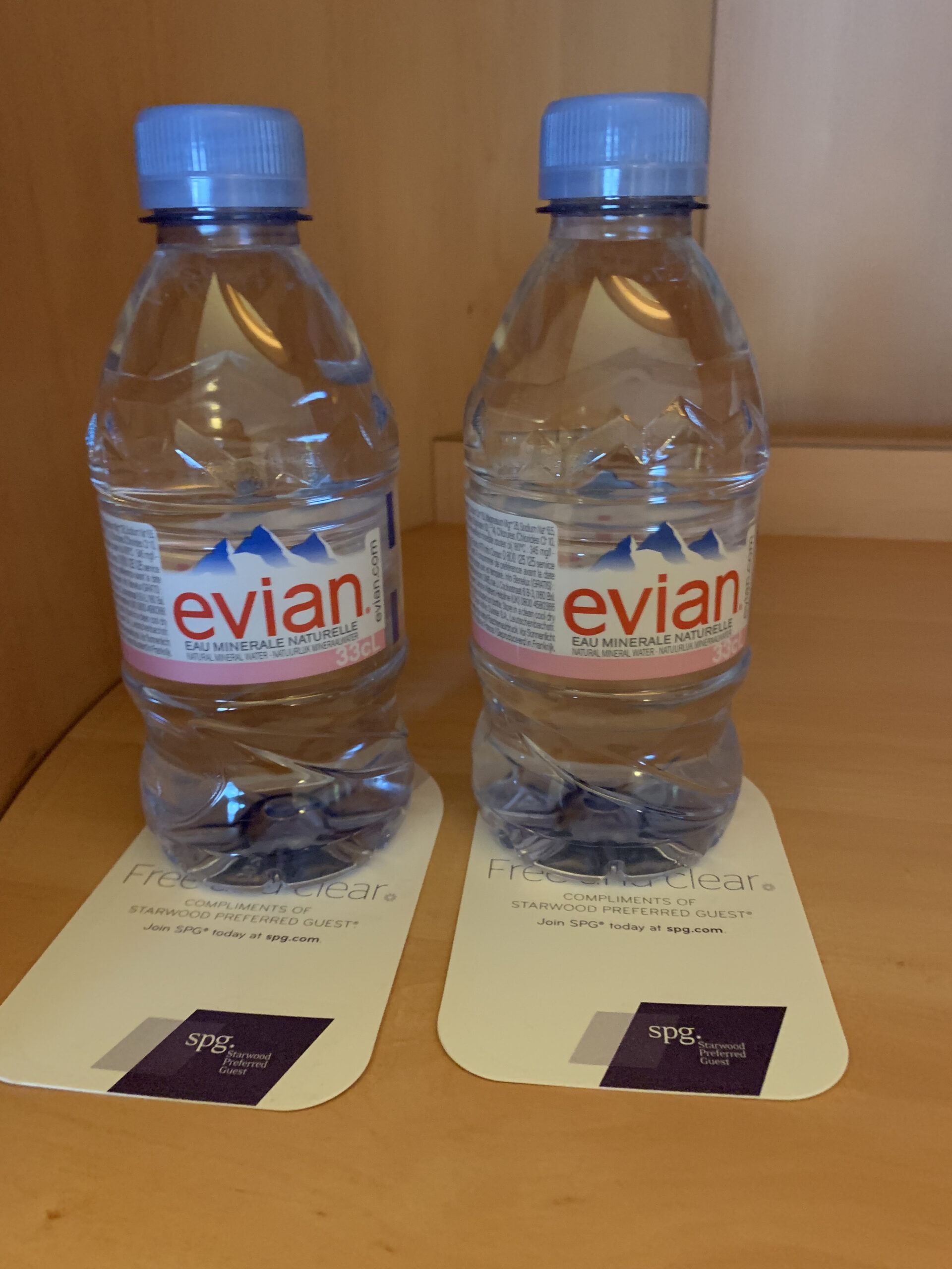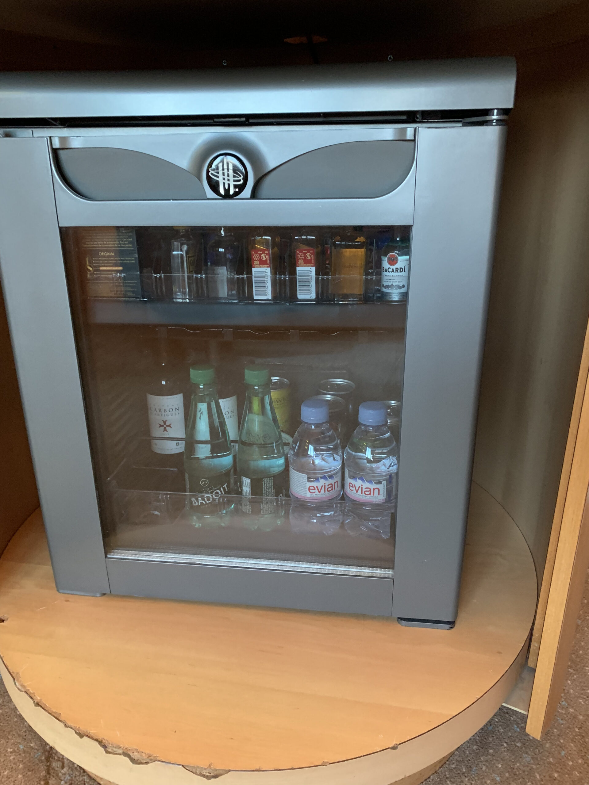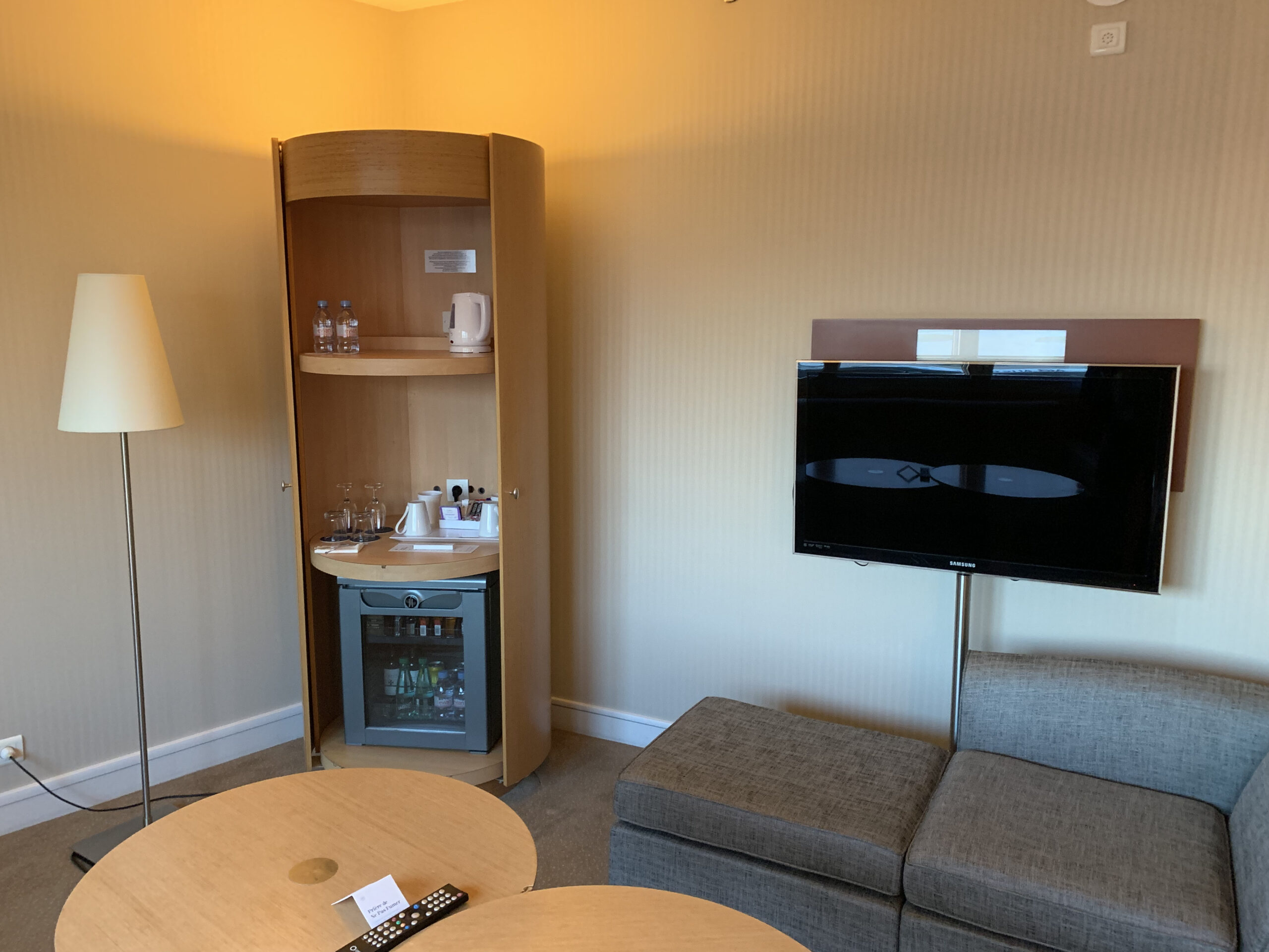 Dazu hatte es auf der anderen Seite noch eine kleine Minibar und zwei kleine Evian Flaschen die gratis waren. Eine Möglichkeit noch Kaffee und Tee zuzubereiten gab es ebenfalls, leider keine richtige Kaffeemaschine.