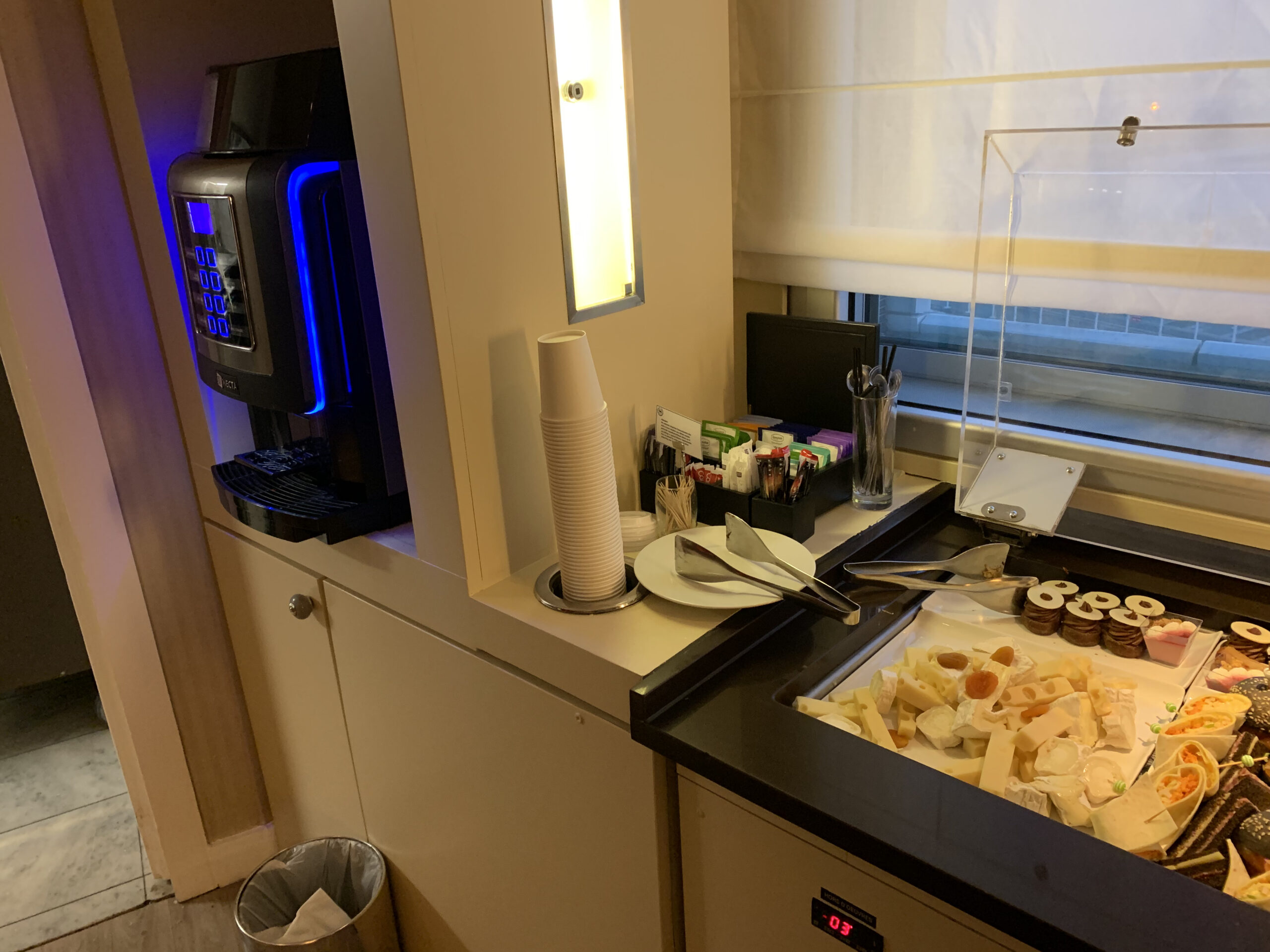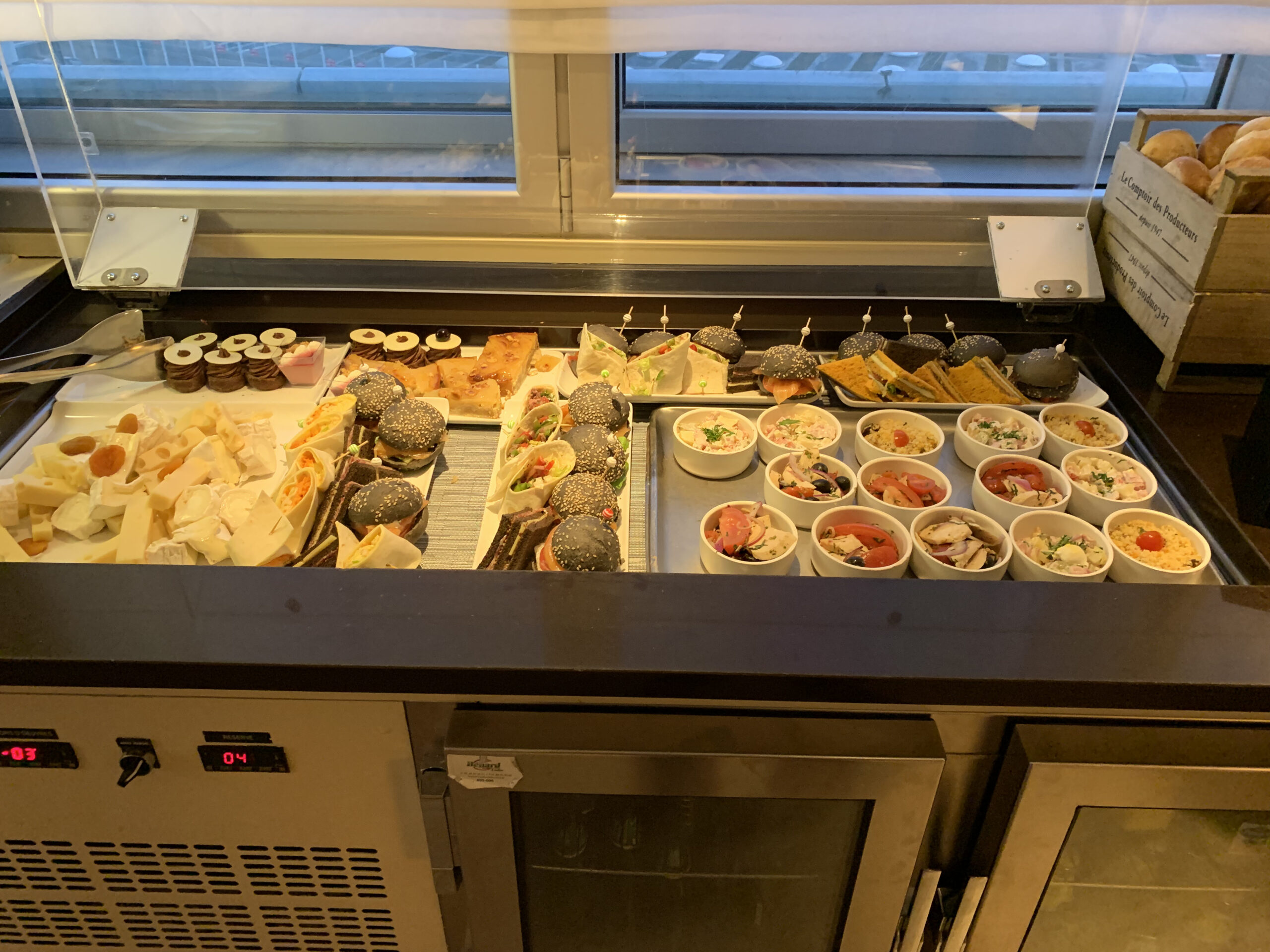 Die Lounge bietet den ganzen Tag über Softdrinks, Kaffee, Tee etc. und (sehr kleine) Snacks an. Morgens kann man hier auch frühstücken was ich allerdings aufgrund der frühen Abflugszeit nicht genutzt habe. Am Abend gibt es eine Happy Hour bei der es dann noch alkoholische Getränke gibt wie auch eine durchaus gute Auswahl an Salaten, Bagels, Käse und zwei warmen Speisen. Hier kann man durchaus satt werden. Wer allerdings nicht so viele Kohlenhydrate mag, der ist natürlich im Restaurant schon besser aufgehoben.