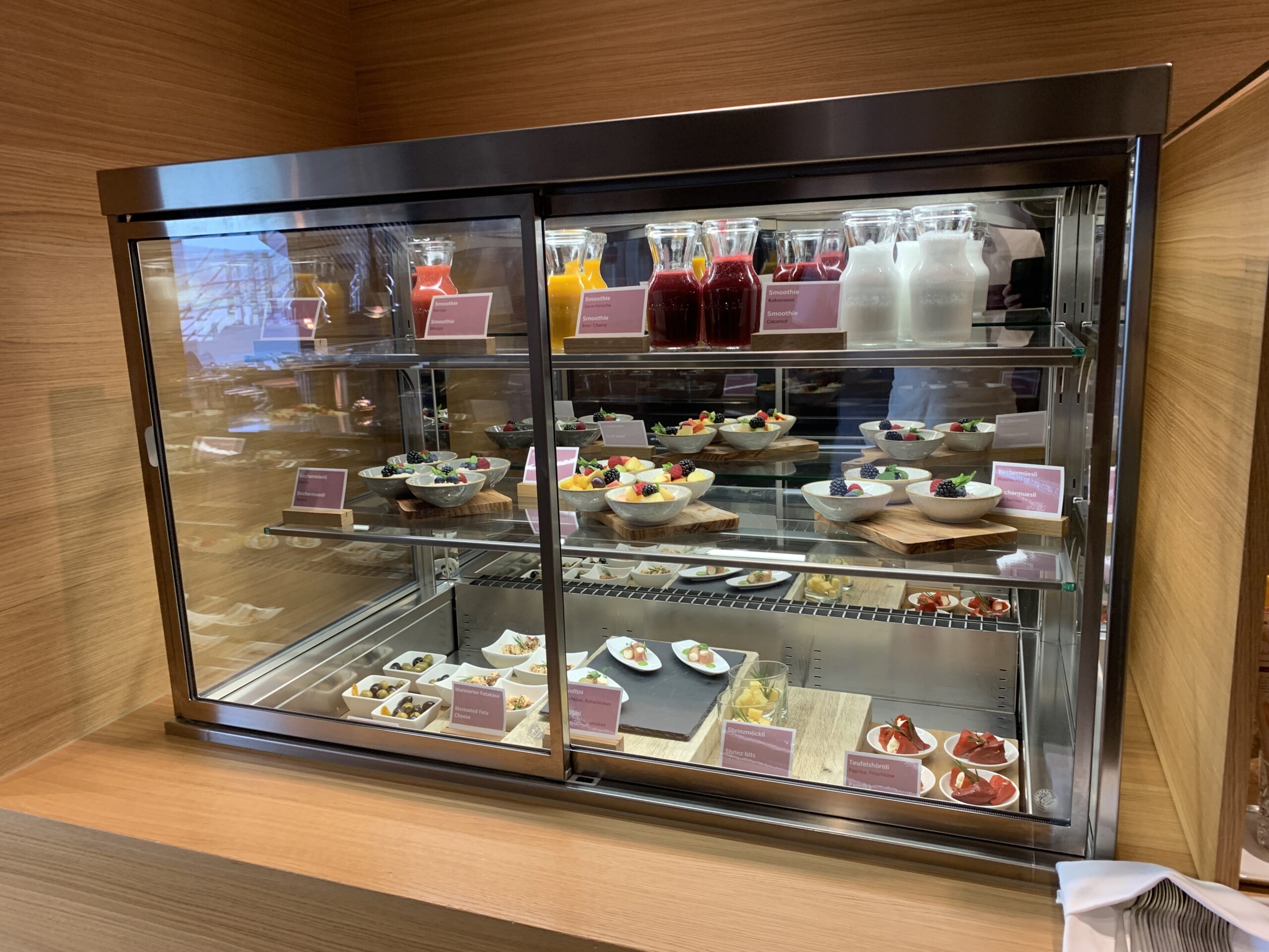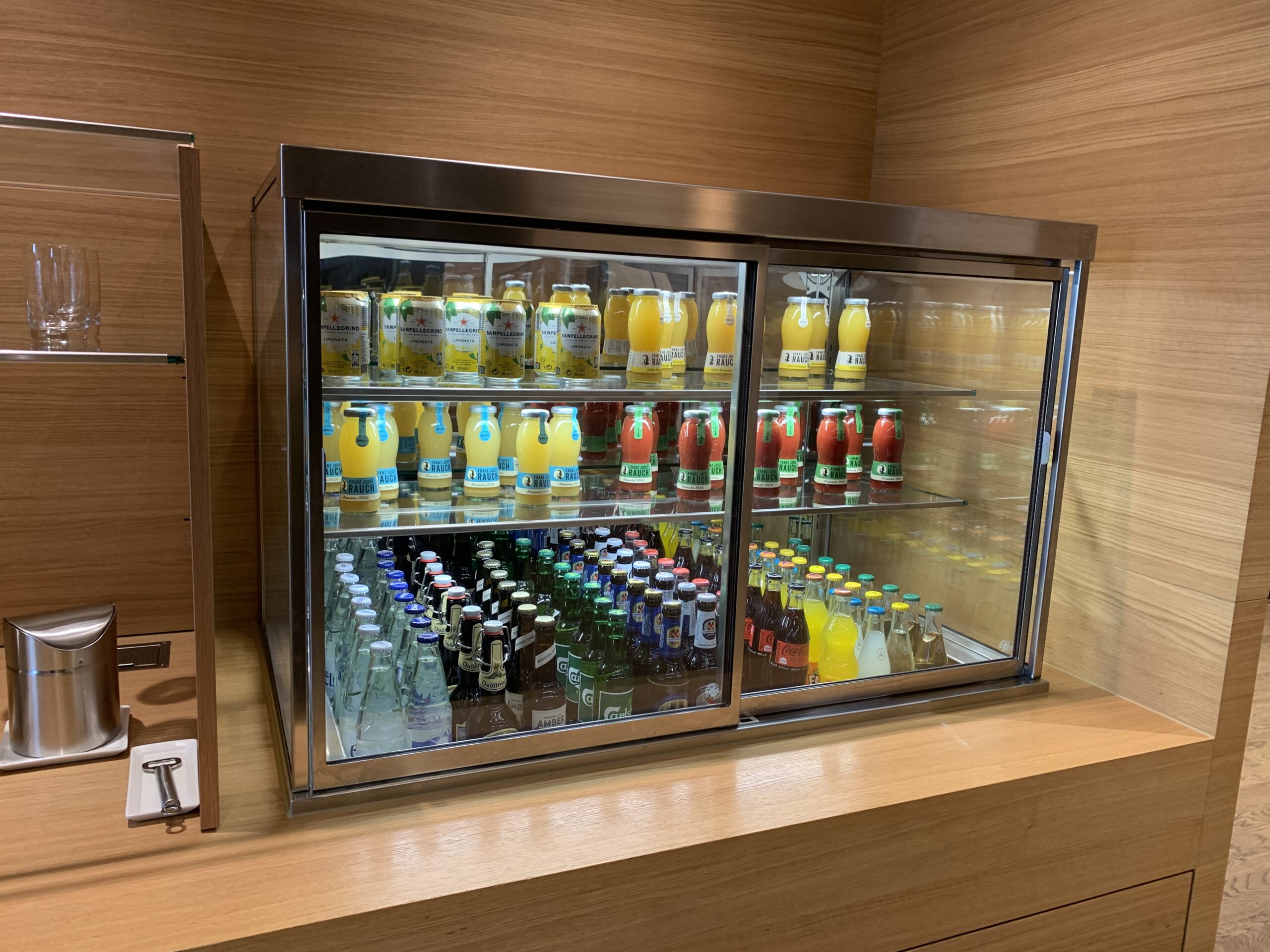 Wie zu sehen ist, ist die Küche so gestaltet, dass man auch sieht was dort vor sich geht. Daneben hat es dann noch Kühlschränke mit kleinen Snacks und verschiedenen Getränke zur Selbstbedienung.