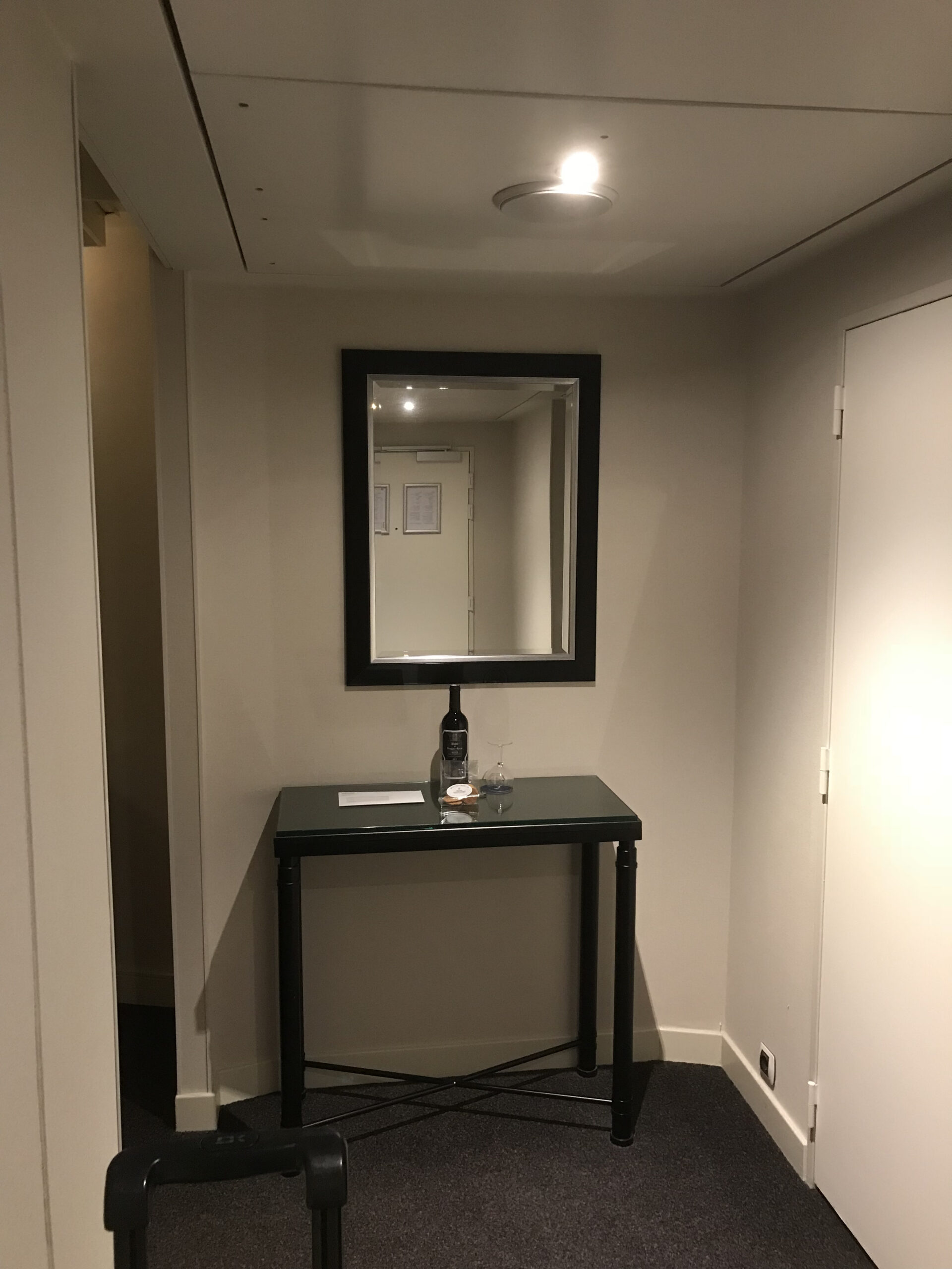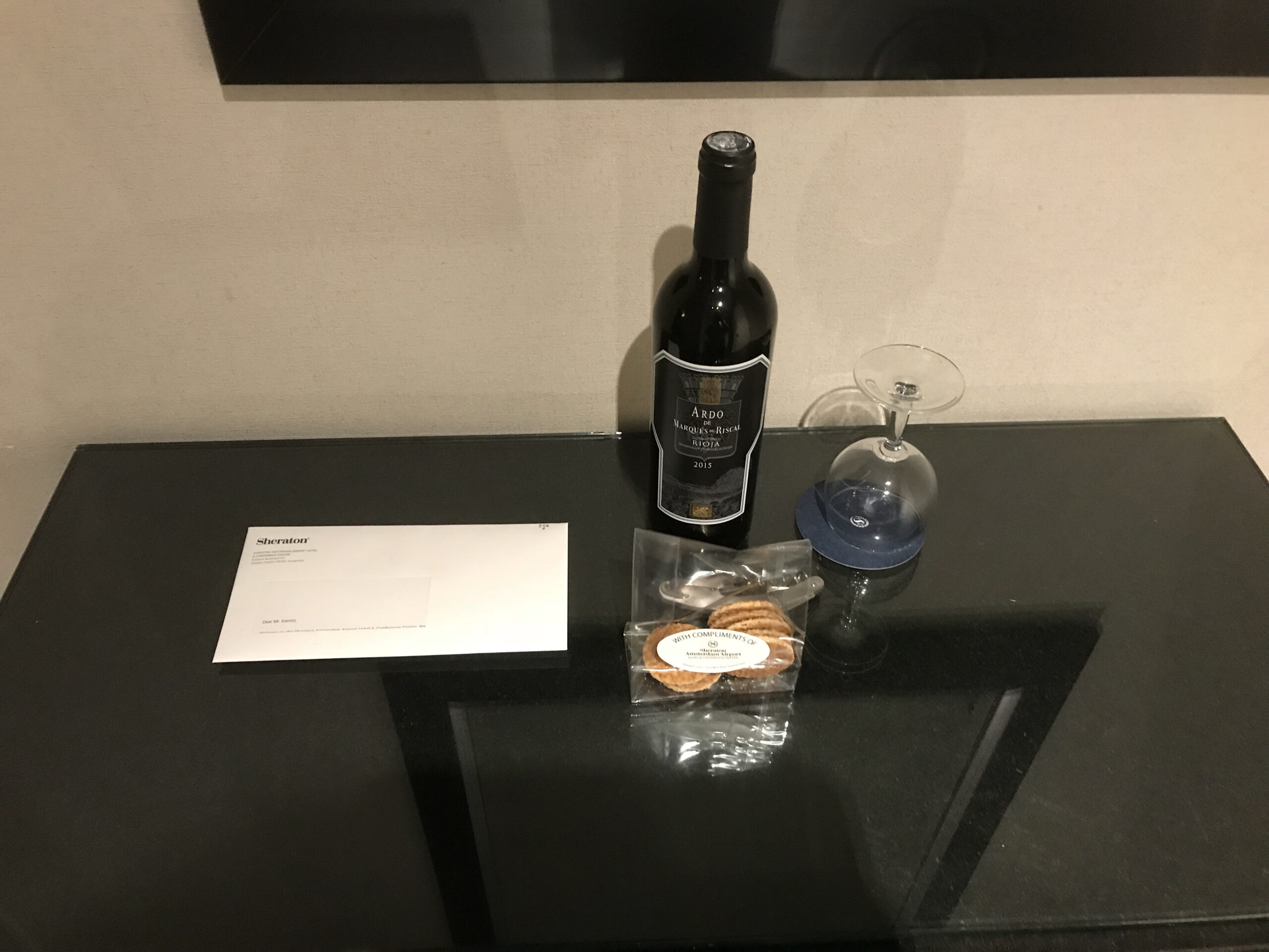 Als ich das Zimmer betrag erwartete mich ein kleines Willkommensgeschenk in Form einer Flasche Rotweit (die gleiche die es auch in der Lounge gibt) sowie Strobwaffeln und gratis Wasser (mit und ohne Kohlensäure) sowie eine Karte. Eine immer wieder schöne Überraschung und Geste die ich schätze.