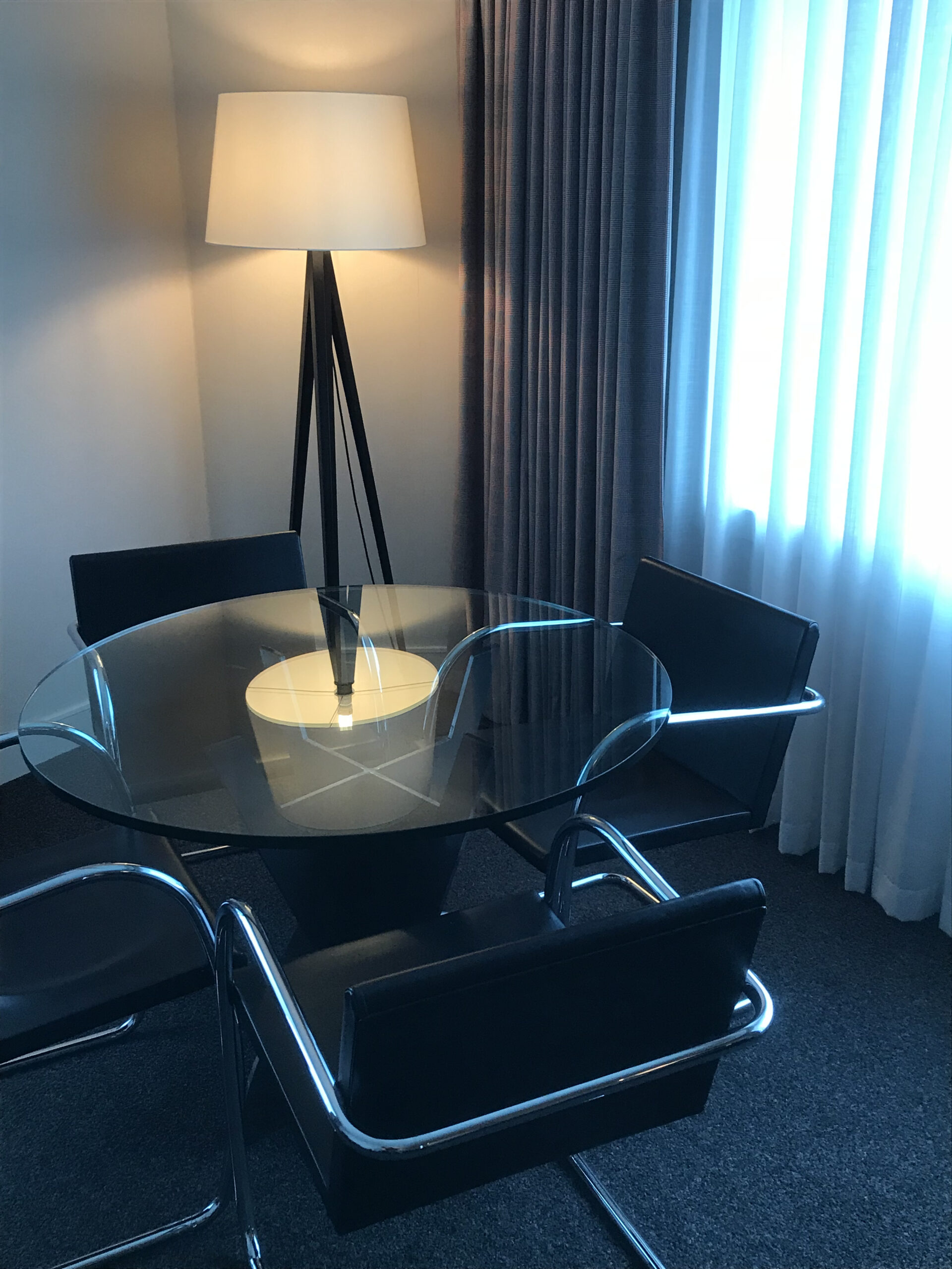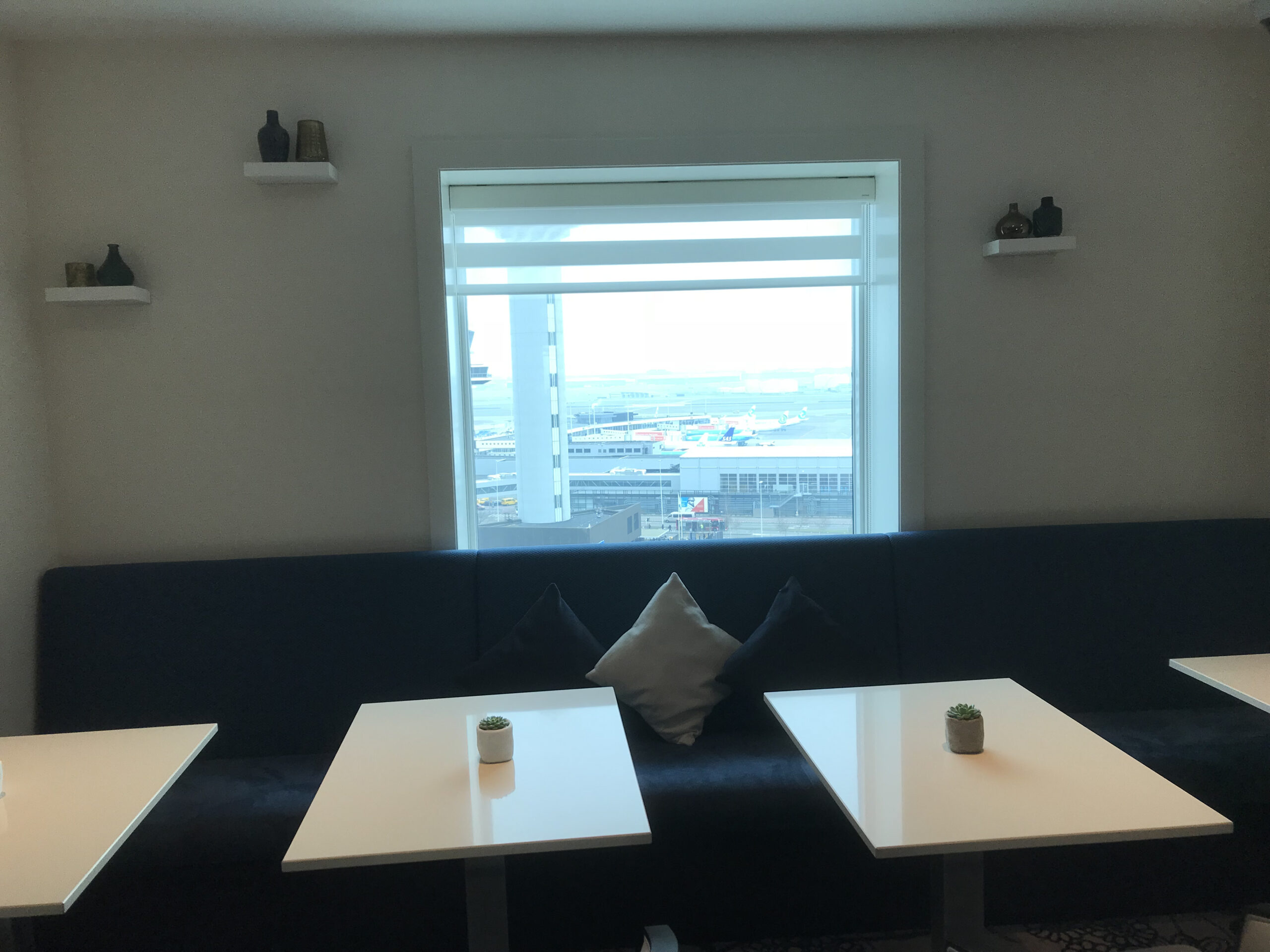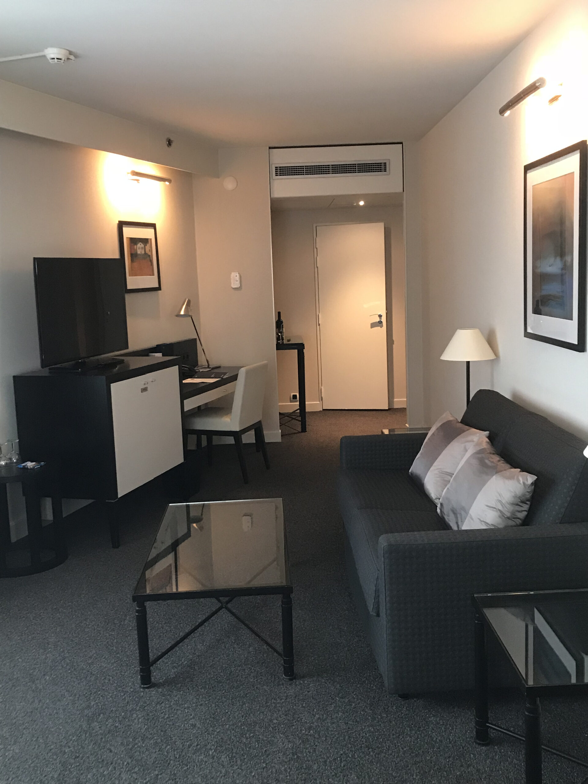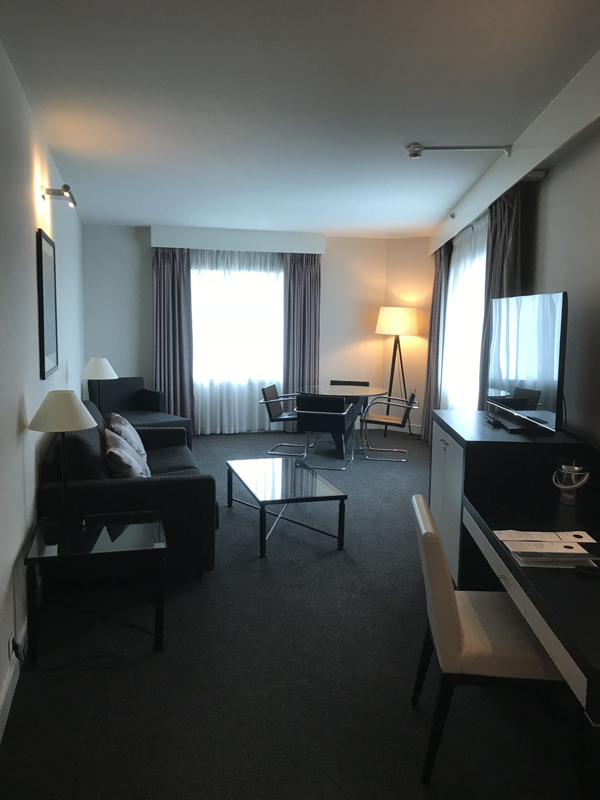 Im Wohnbereich befindet sich eine Couch, Tisch mit vier Stühlen, TV, Minibar (leer) sowie ein Loungesessel. Vor allem wenn man als Aviation Geek einen Blick durch die Fenster zum Flughafen wird ist dies alles doch schon sehr nett. Bei den Steckdosen ist man nicht mehr so zeitgemäss, zwar hat es im Arbeitsbereich alle gängigen Steckdosen, wenn man aber woanders sitzt muss man hier schon eine Lampe ausstecken um Strom zu bekommen.