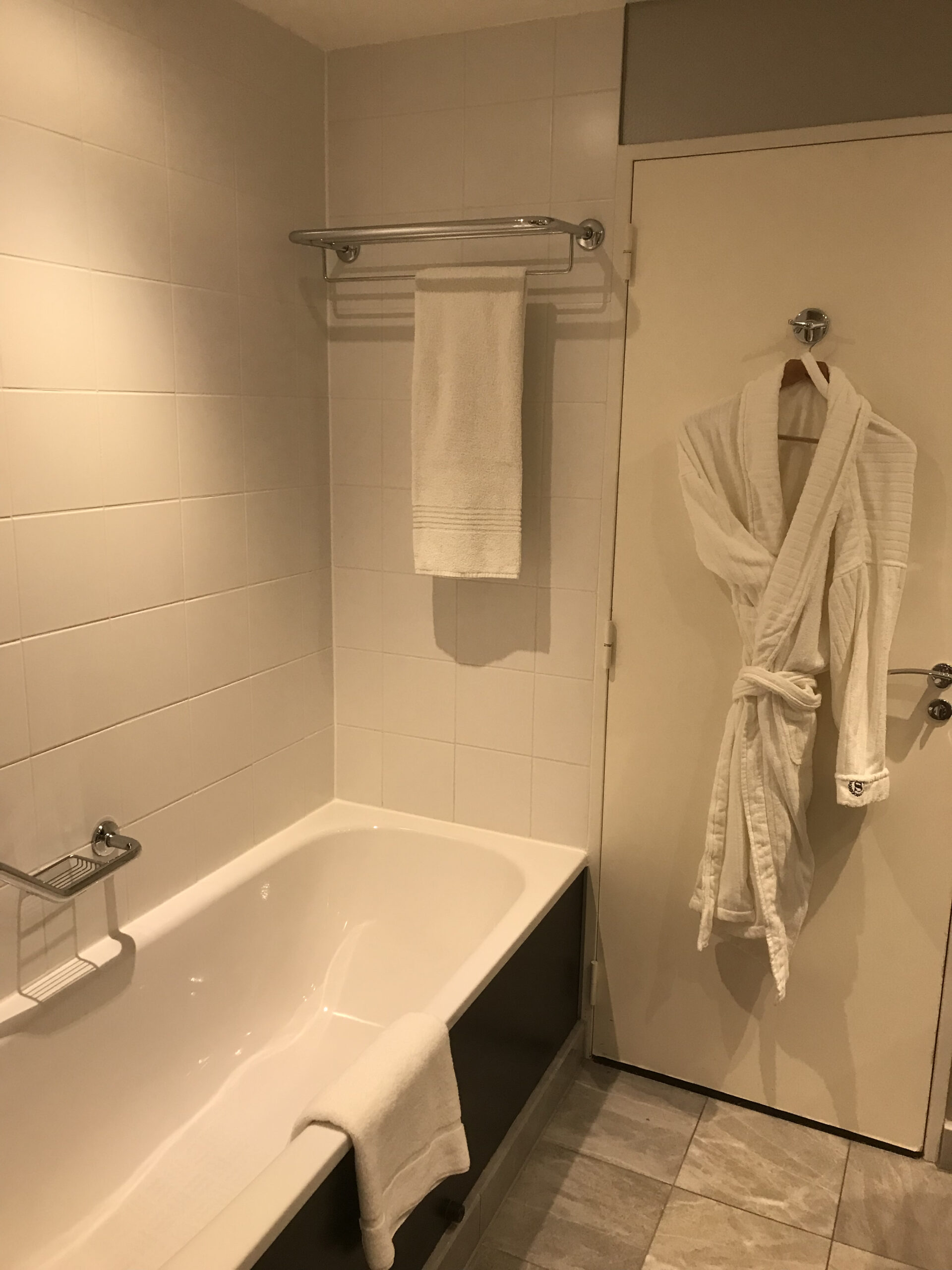 Das Badezimmer ist ausreichend gross und nicht nur eine Dusche sondern auch eine Badewanne sowie Bademäntel. Shampoo etc hat es ebenfalls ausreichend vorhanden, dazu noch einen Rasierer sowie eine Zahnbürste. Die Sauberkeit war tadellos auch wenn man dem Zimmer hier und da gewisse Abnutzungserscheinungen anmerkt.