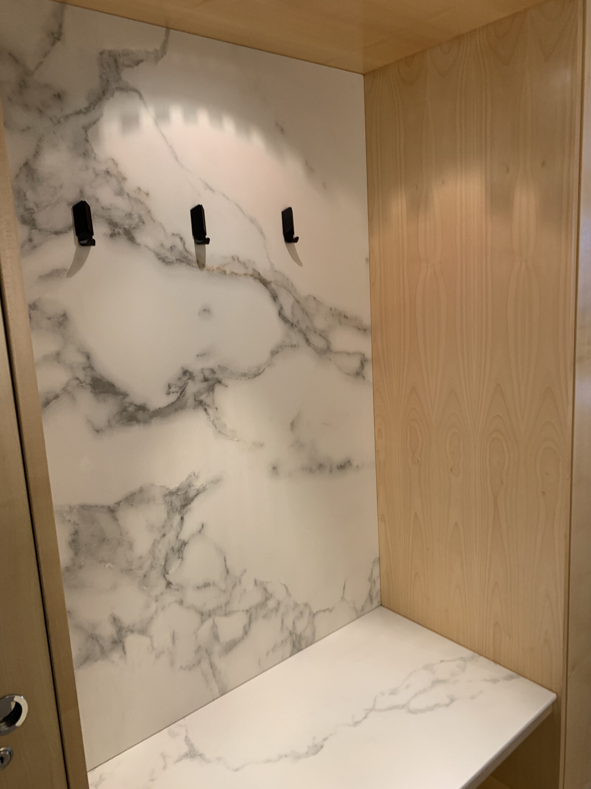 Aufgefallen ist das Zimmer vor allem durch das sehr helle Ambiente. Im Eingangsbereich befindet sich neben der Kofferablage auch ein Schrank, rechts davon befindet sich dann das Badezimmer.