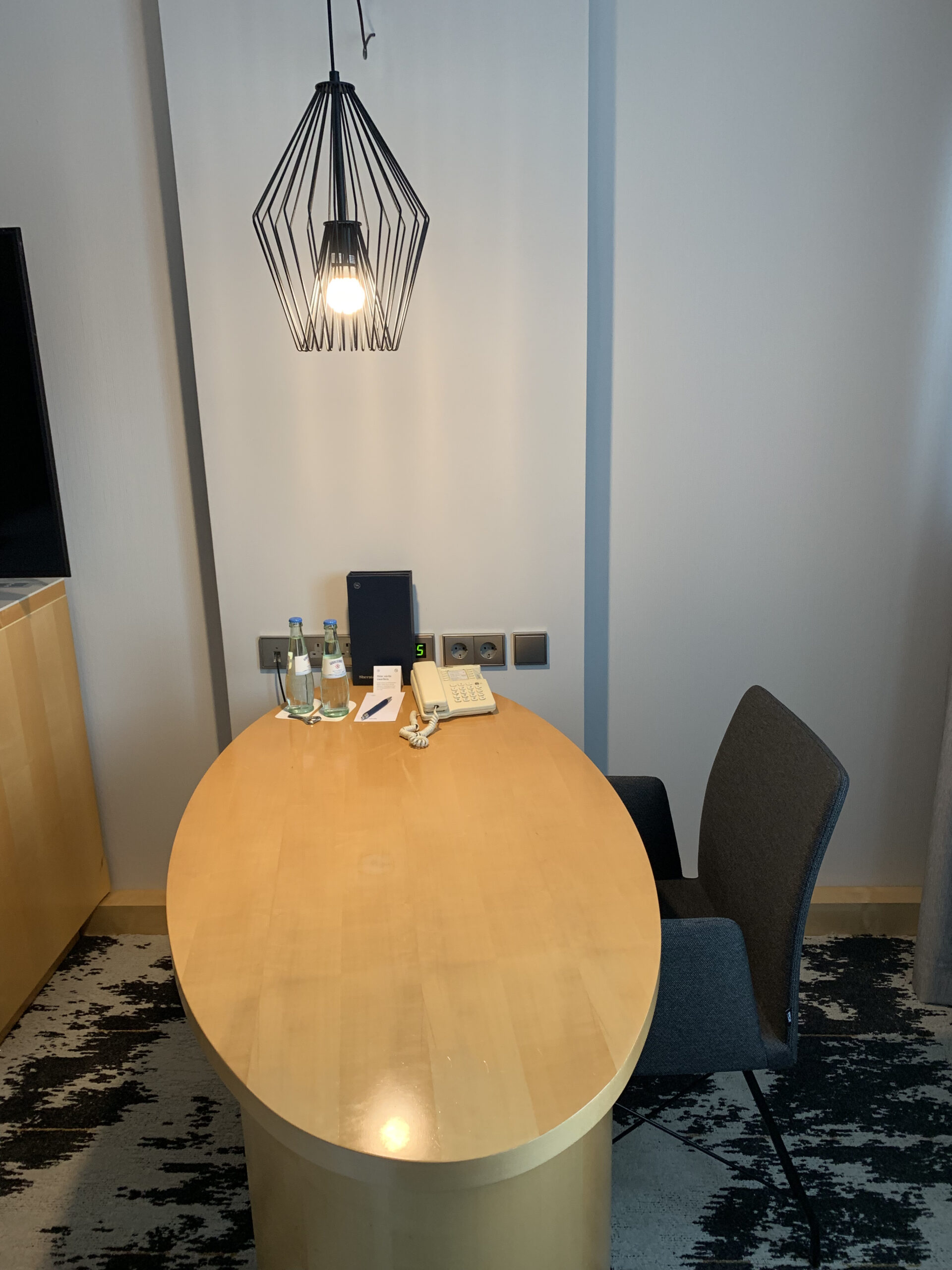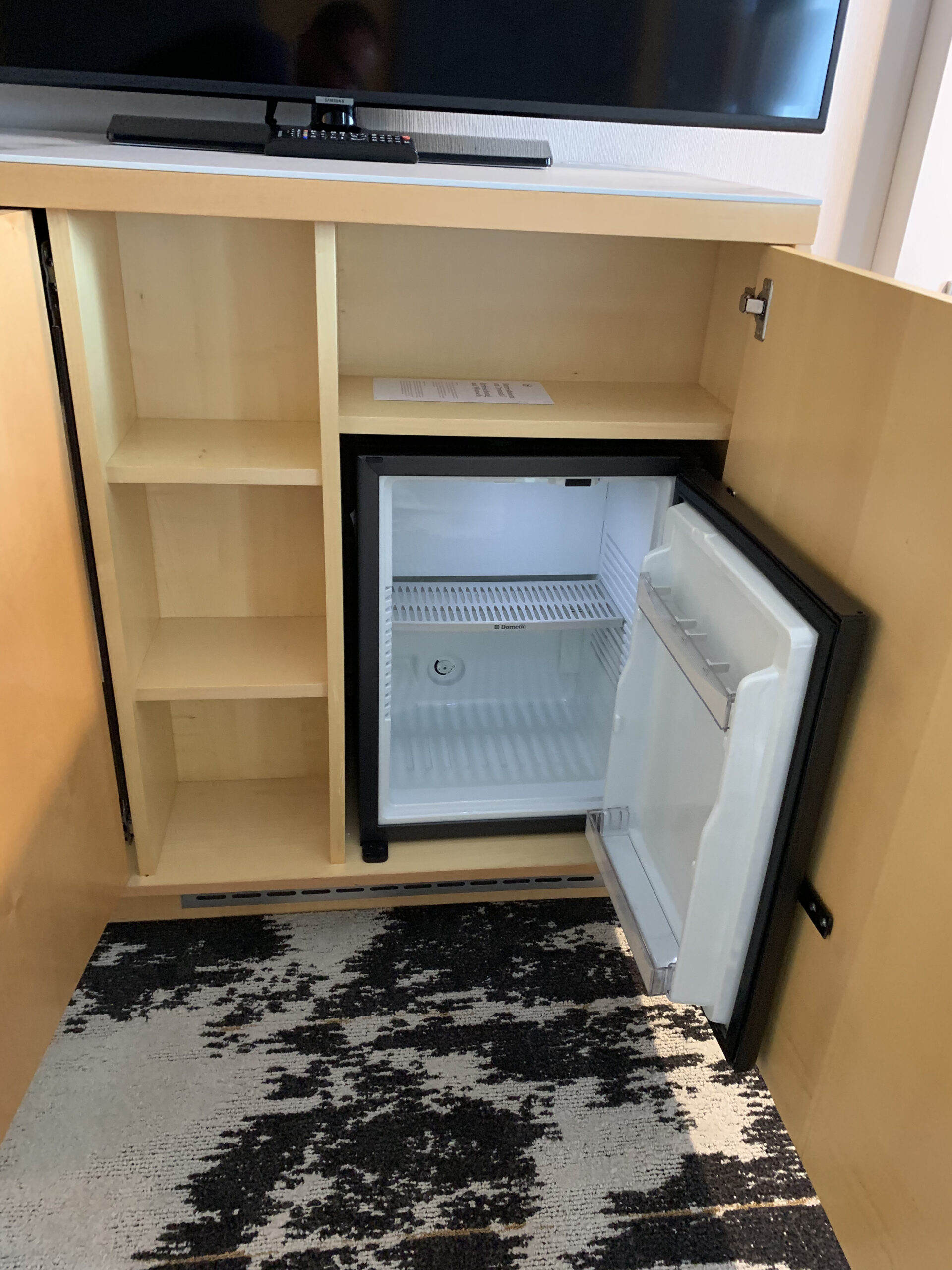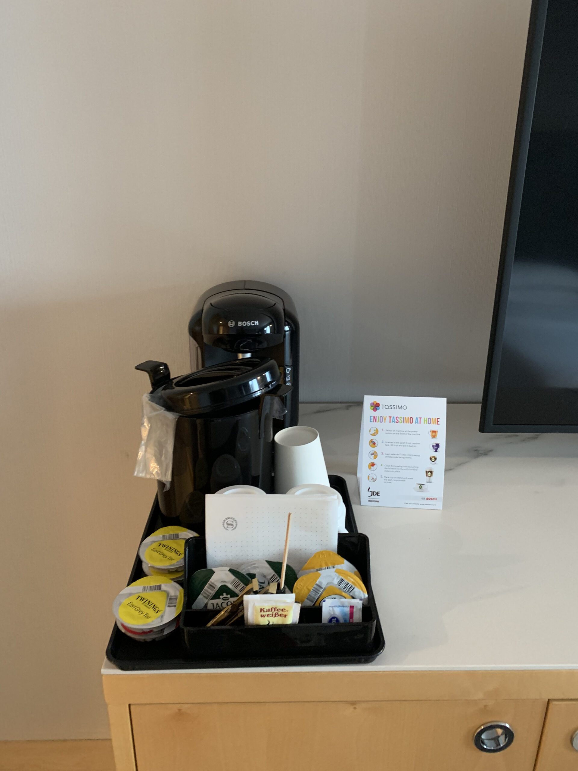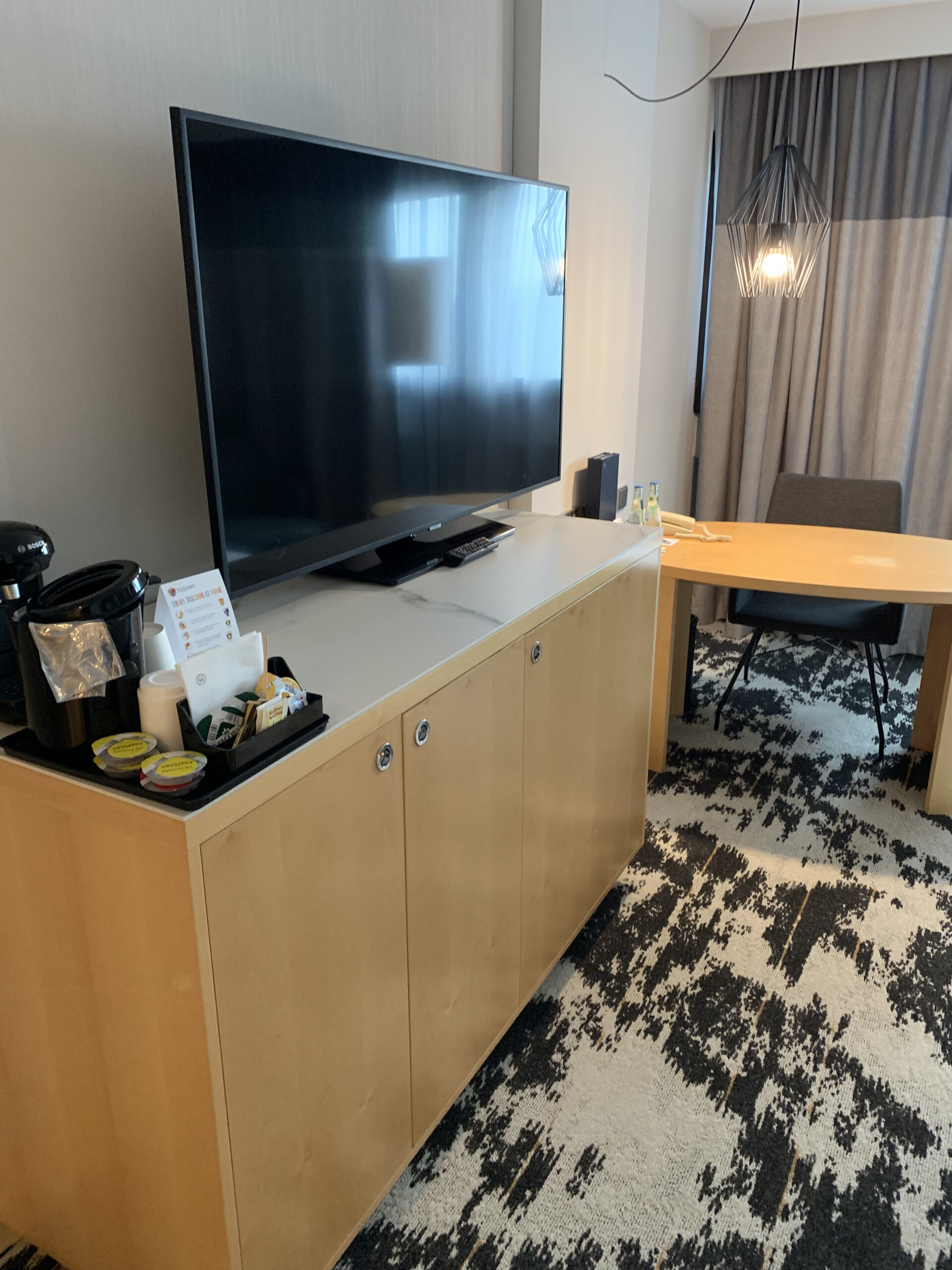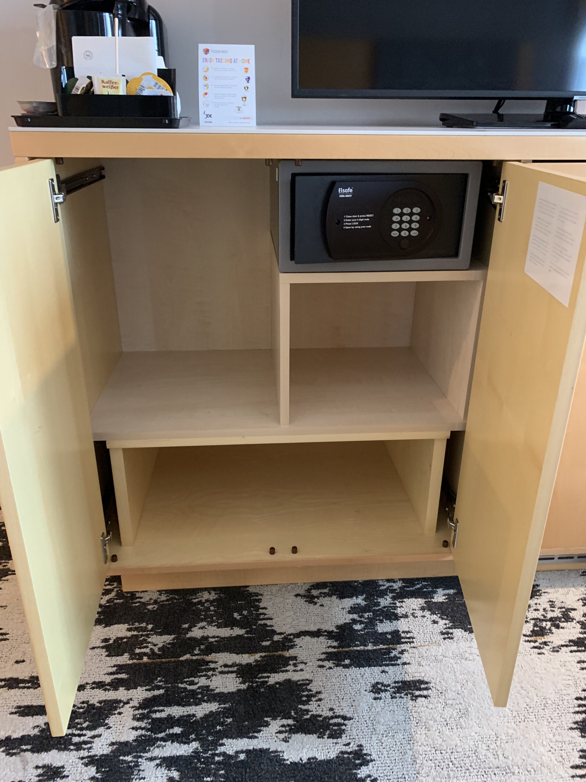 Es hat noch eine Kaffeemaschine neben dem Fernseher, darunter einen kleinen Safe. Daneben gab es noch gratis Wasser was ich immer wieder schätze. Unter dem Fernseher hat es noch eine kleine Minibar, also eher gesagt einen kleinen Kühlschrank.
