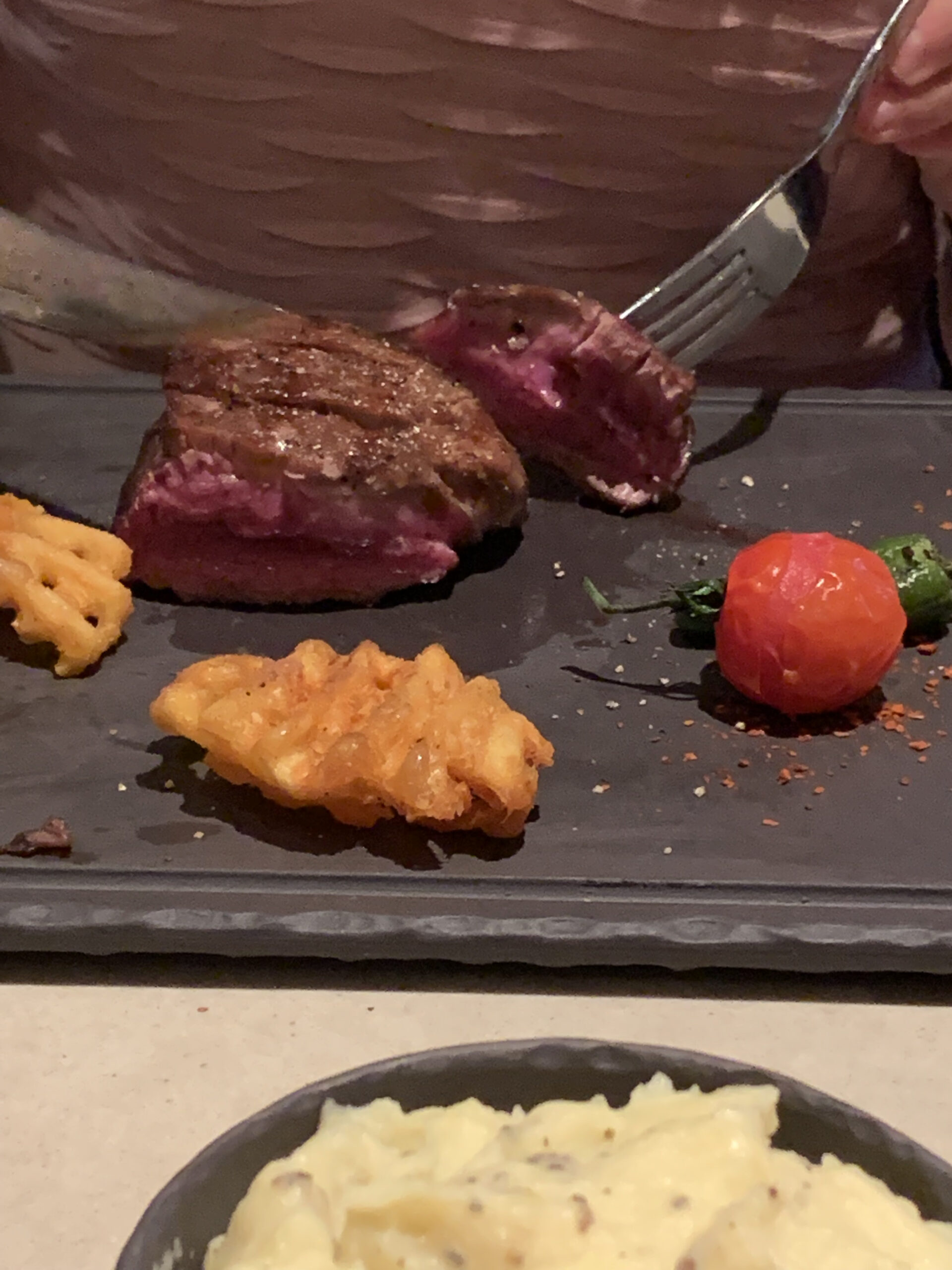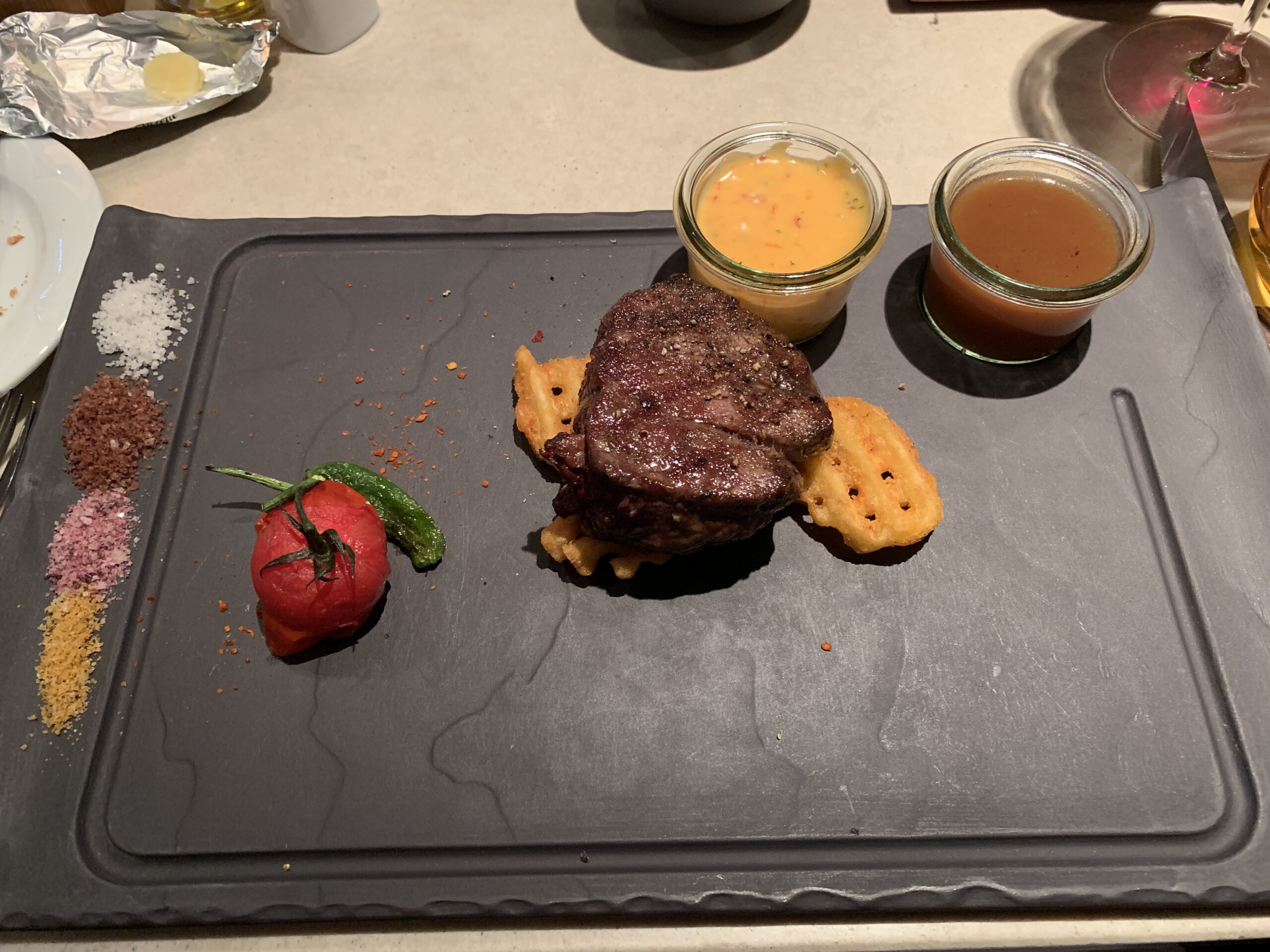 Hier gibt es ein RIESEN Kompliment ! Echt eine super Auswahl und der Service war echt umwerfend. Ich habe selten einen so guten Service in einem Hotel erlebt. Vegetarier sollten hier vielleicht wegschauen, aber das Steak konnte man sich aussuchen und wurde auf den Punkt gegrillt. Die Vorspeise und alles dazueinfach super.
