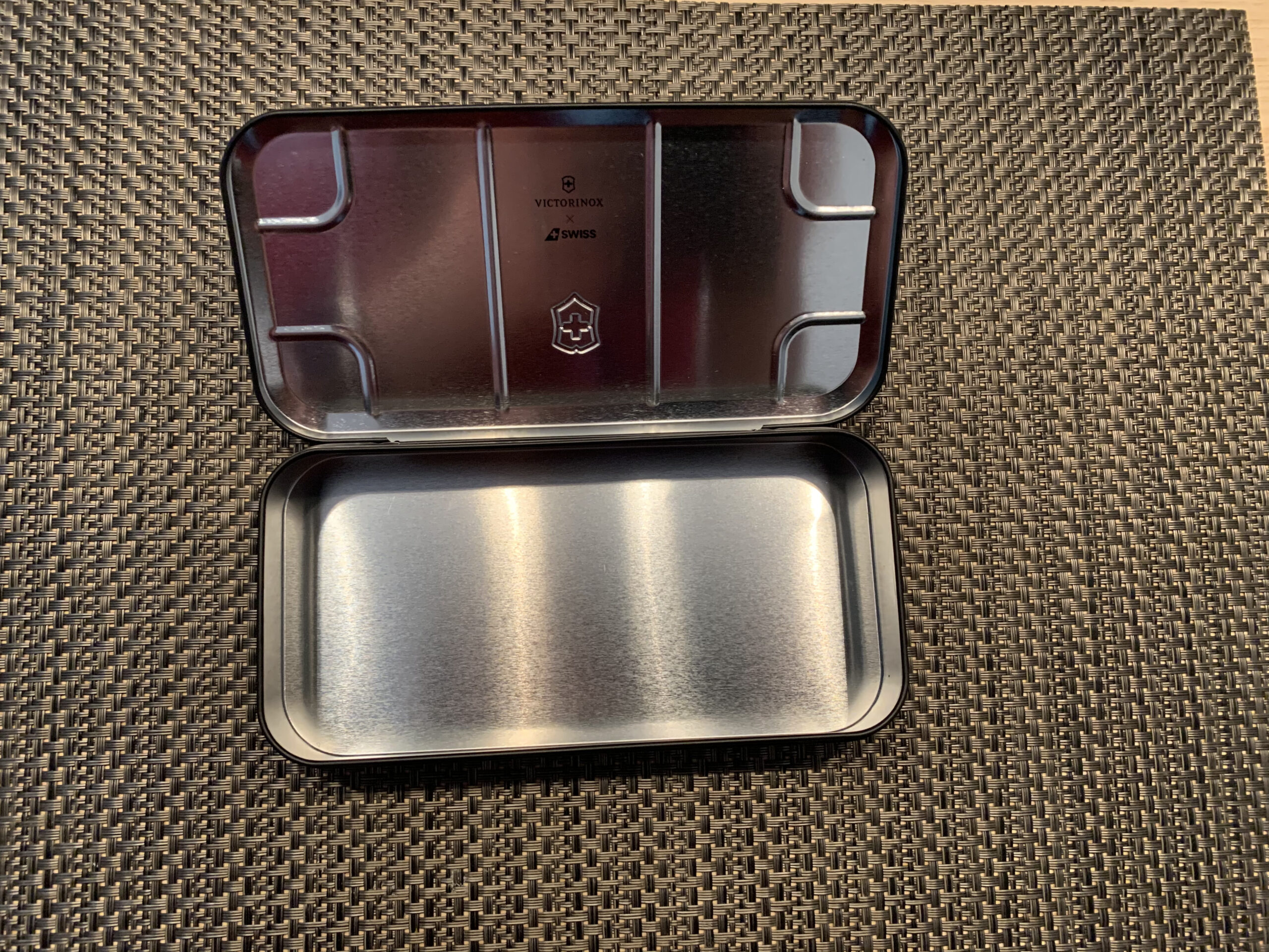 Nettes Victorinox-Branding, aber die schwarze Blechdose mit Standardinhalt ist kein Highlight — da geht mehr, Swiss.